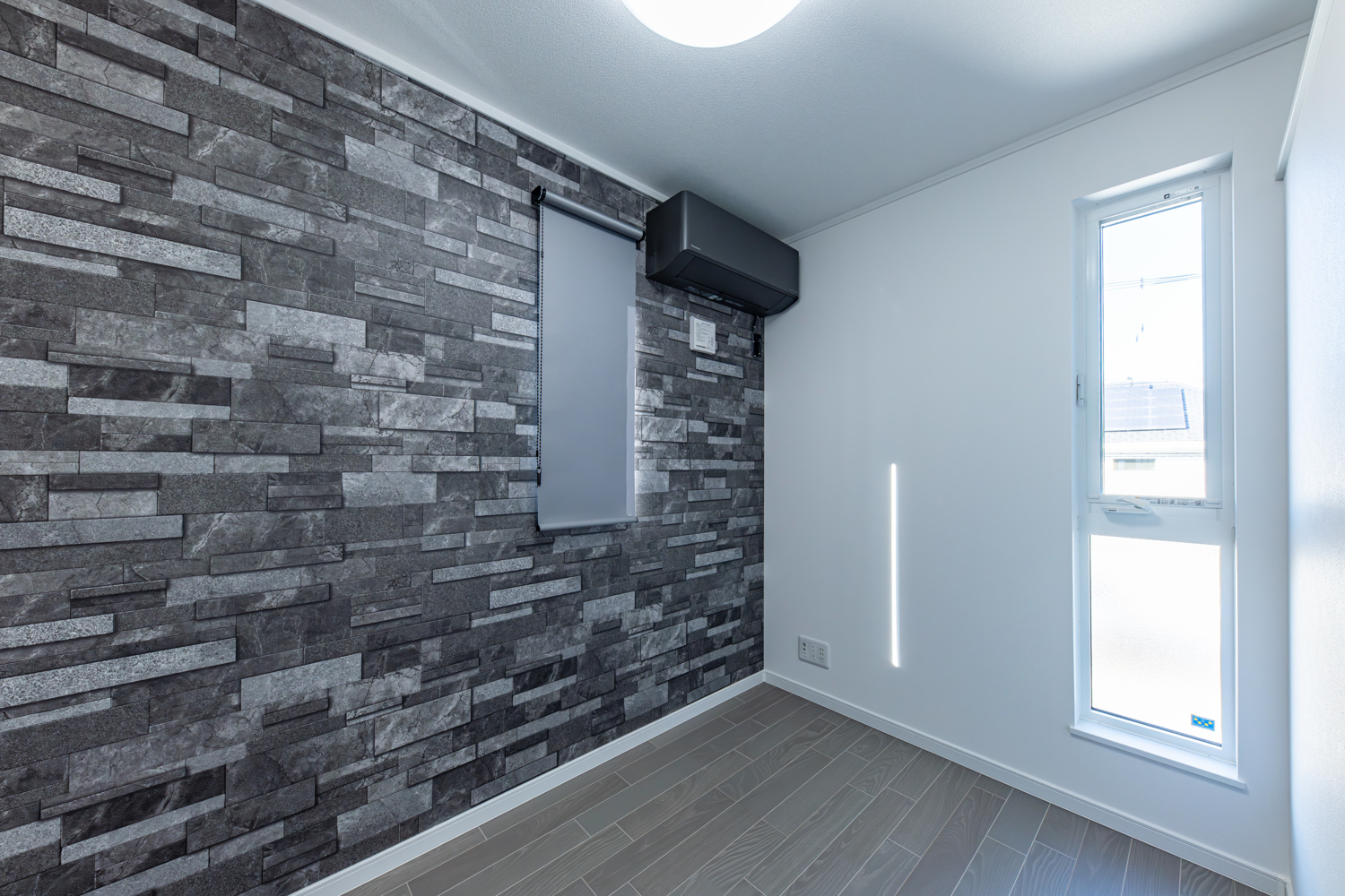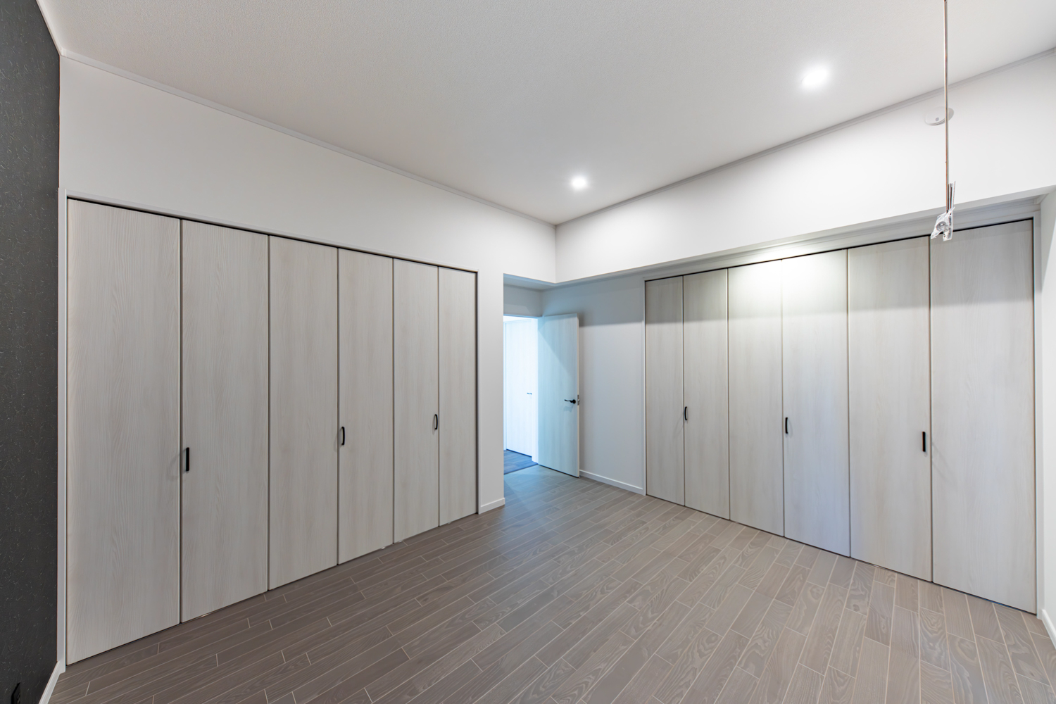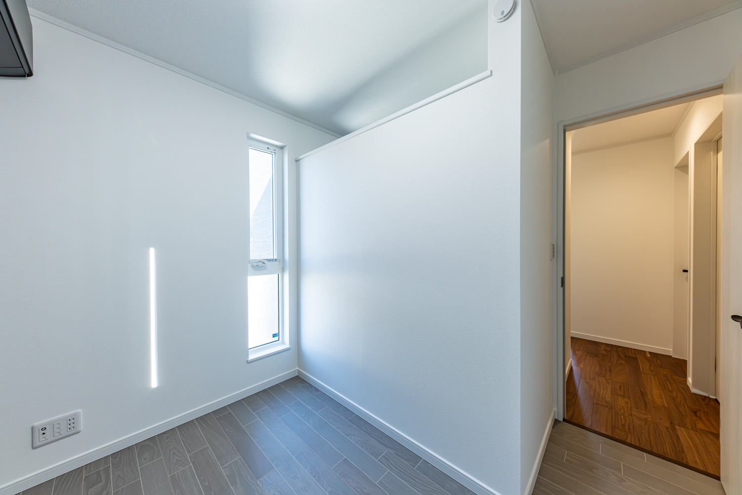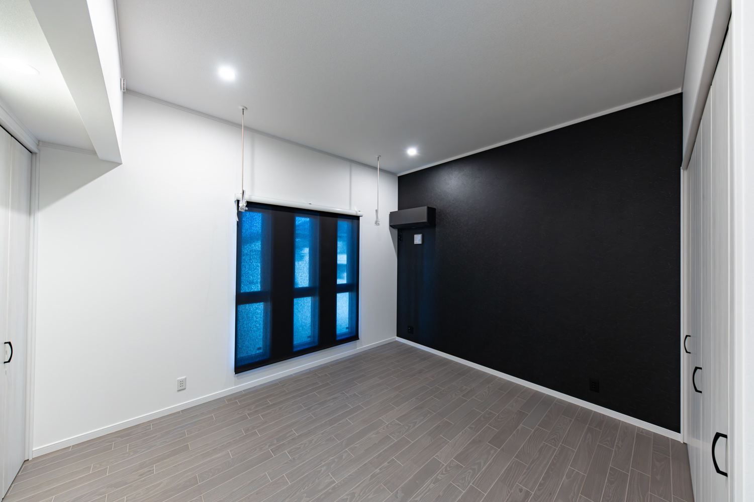 石目柄の光沢フロアが上品に輝く、開放的なリビング。ハイスタッドとダウンライトが生む広がりのある空間に、黒い石目柄のキッチンと統一感のあるカップボードが洗練された雰囲気を演出します。2階には、大容量のクローゼットや、スマートな室内物干し付きのお部屋を完備。デザインと機能性が調和した、心地よい暮らしが叶うお家が完成しました。