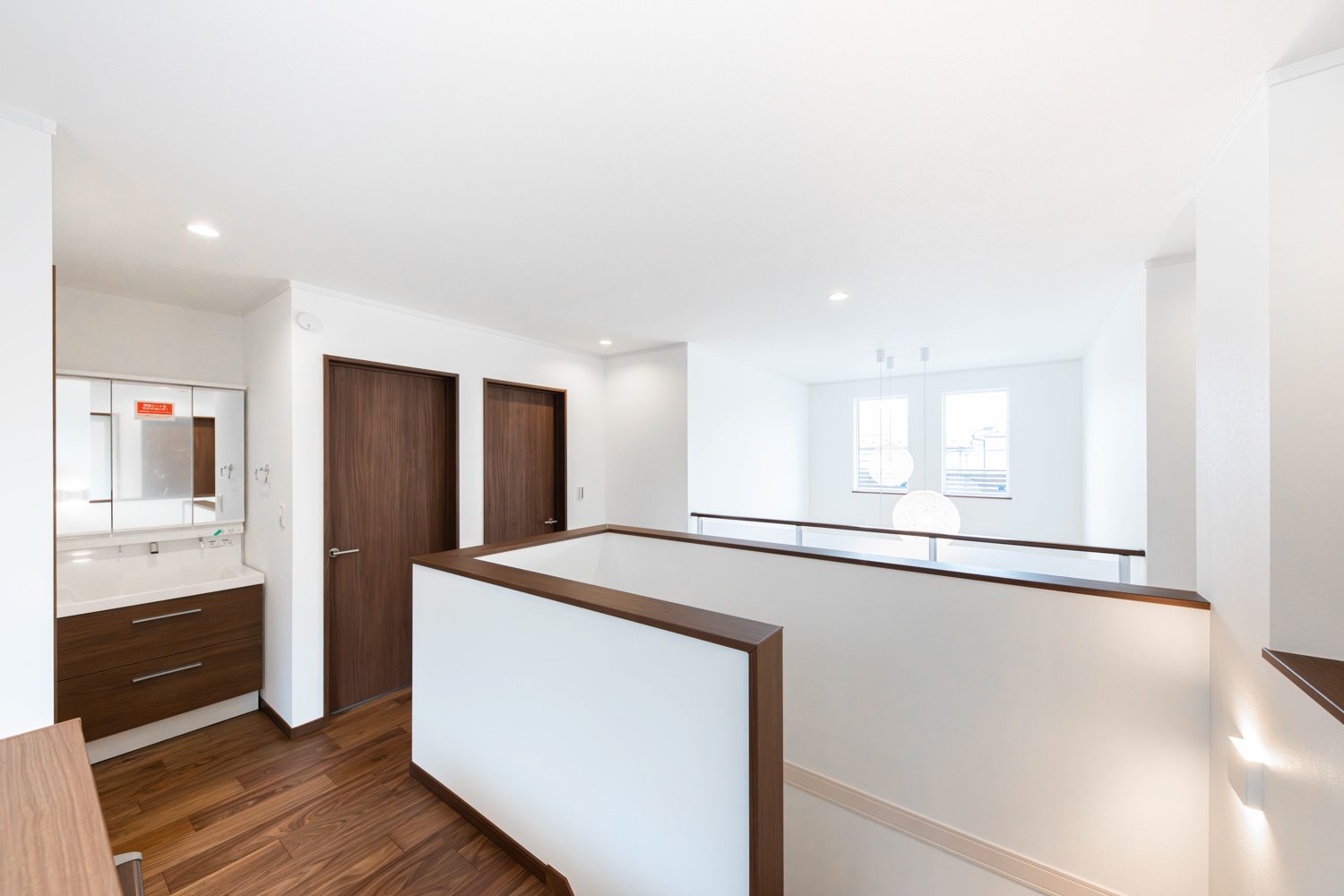 明るく開放感のある2階ホール。2階にも洗面化粧台を設えました。