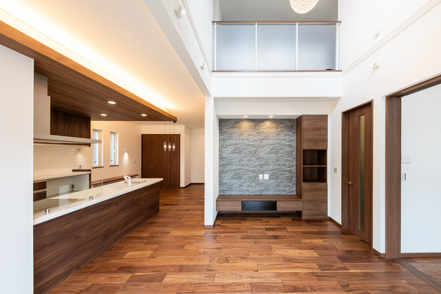 24帖超、ハイスタッド・吹き抜けを採用した開放感溢れるリビング。