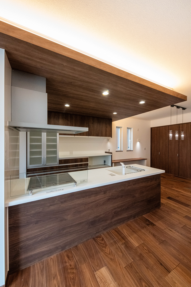 キッチン背面にはキッチンと同じ配色のカップボードを設置。