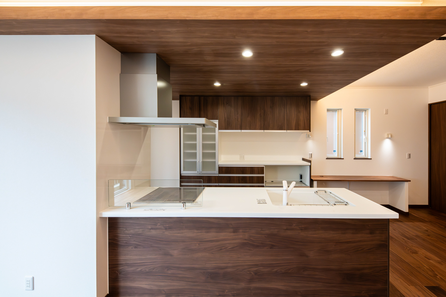 眺望や家族との会話も楽しめる開放感が心地よいキッチン。すっきりシンプルなデザインのペニンシュラ型です。