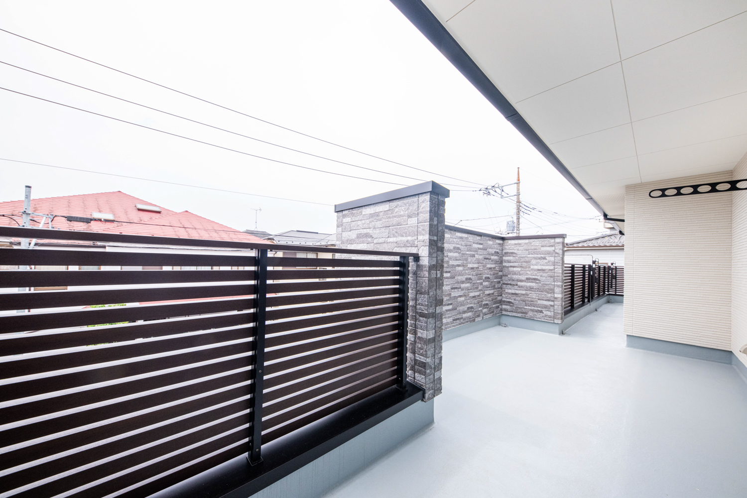 布団などの大きなものも楽に干せる広々としたバルコニー。干した洗濯物が見えにくいようになっています。