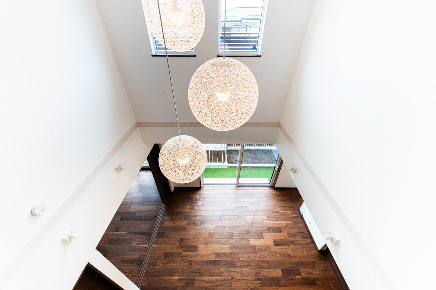 大きな吹抜けから明るい光が差し込み、自然な風が入り込む開放感あるリビング。