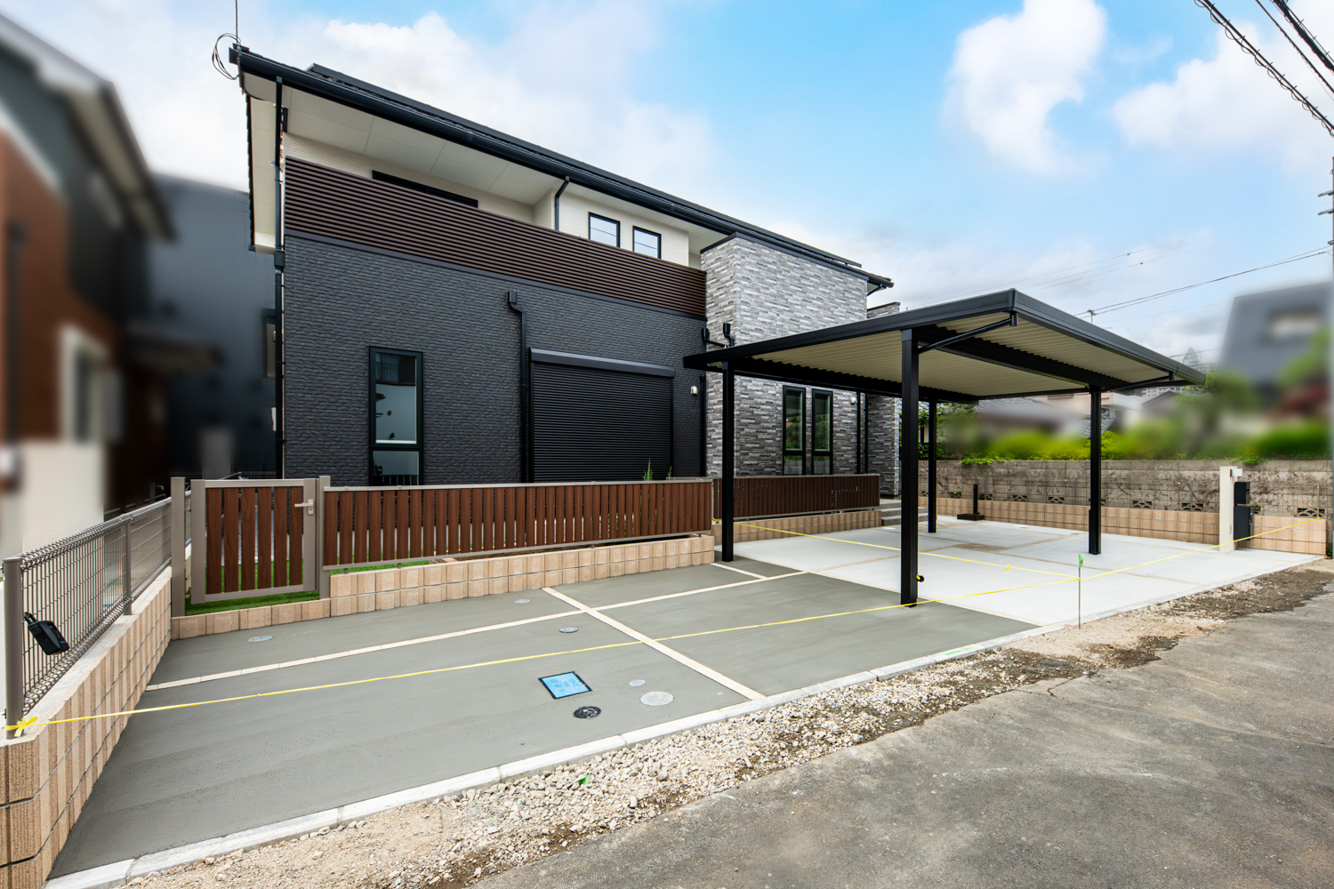 車2台駐車可能のカーポート付き。来客者も駐車可能な広々としたスペース。
