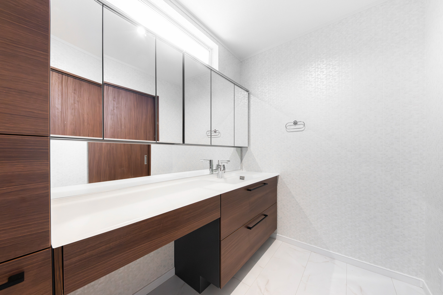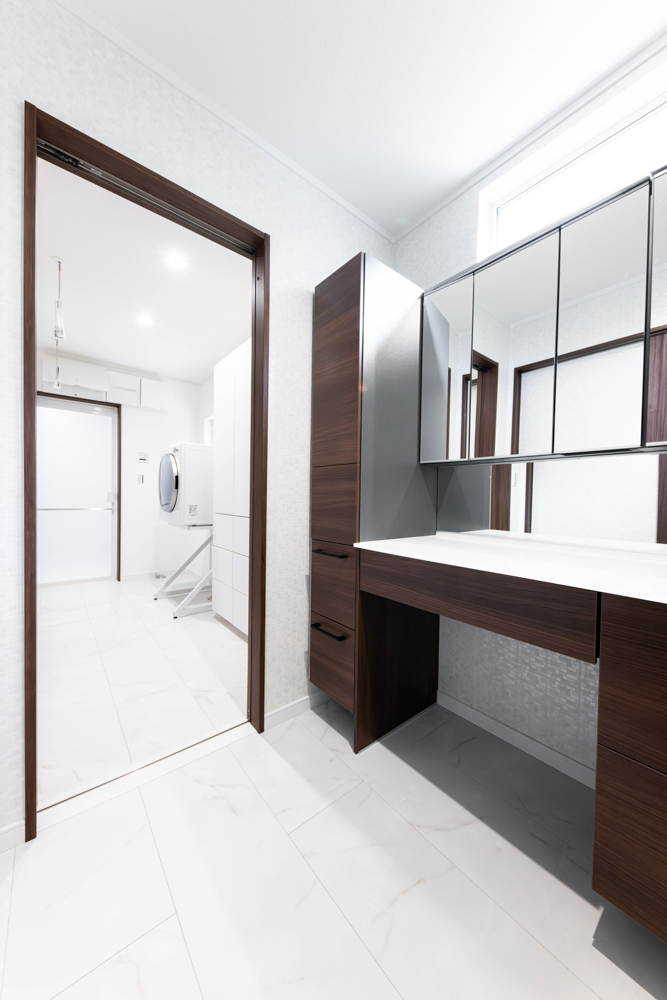 朝の身支度や夜のスキンケアが楽しくなるサニタリールーム。化粧品を入れても余裕の豊富な収納でいつもすっきりとした空間が保てます。