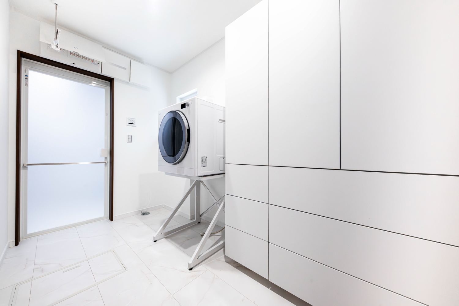 ランドリールーム・脱衣所。室内物干しや乾太くん、大きな収納付きで洗濯作業はこの部屋で完結できるようになっています。