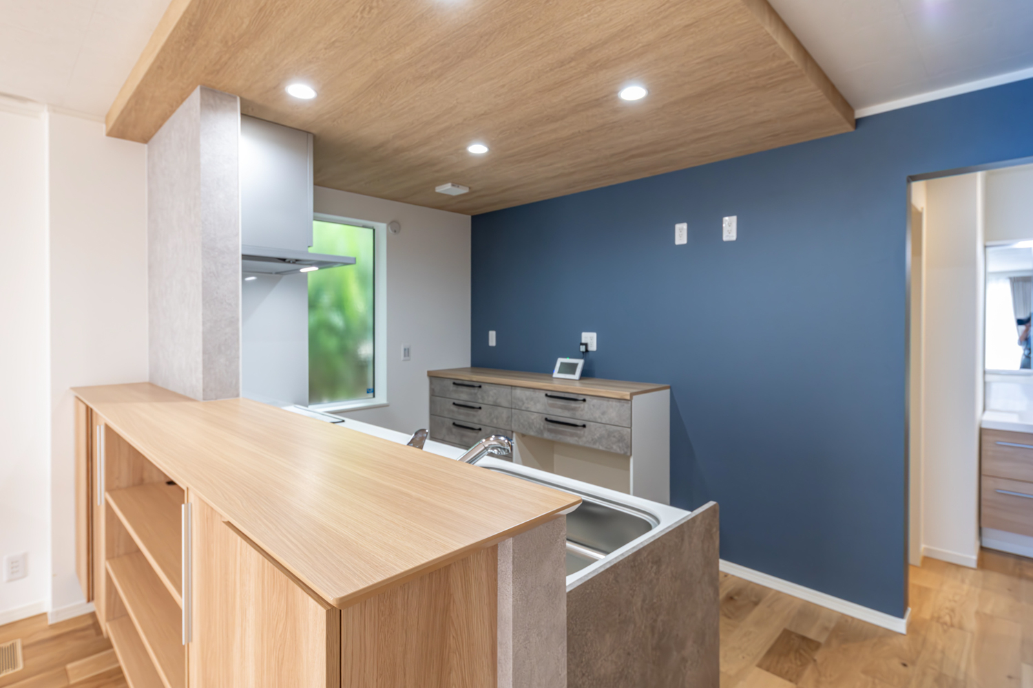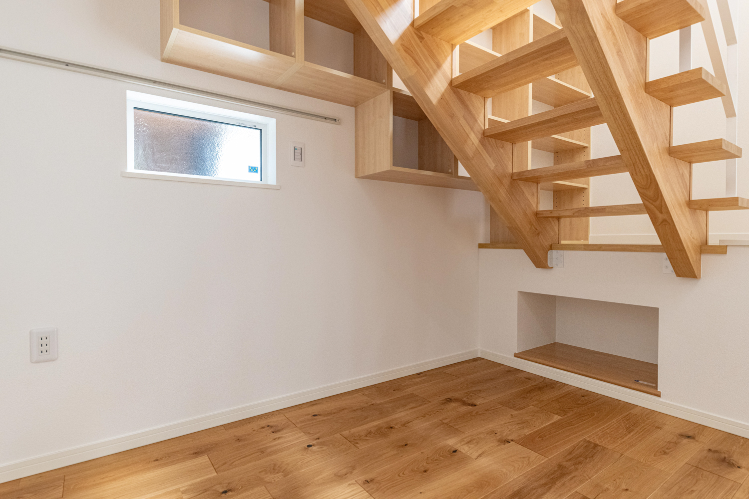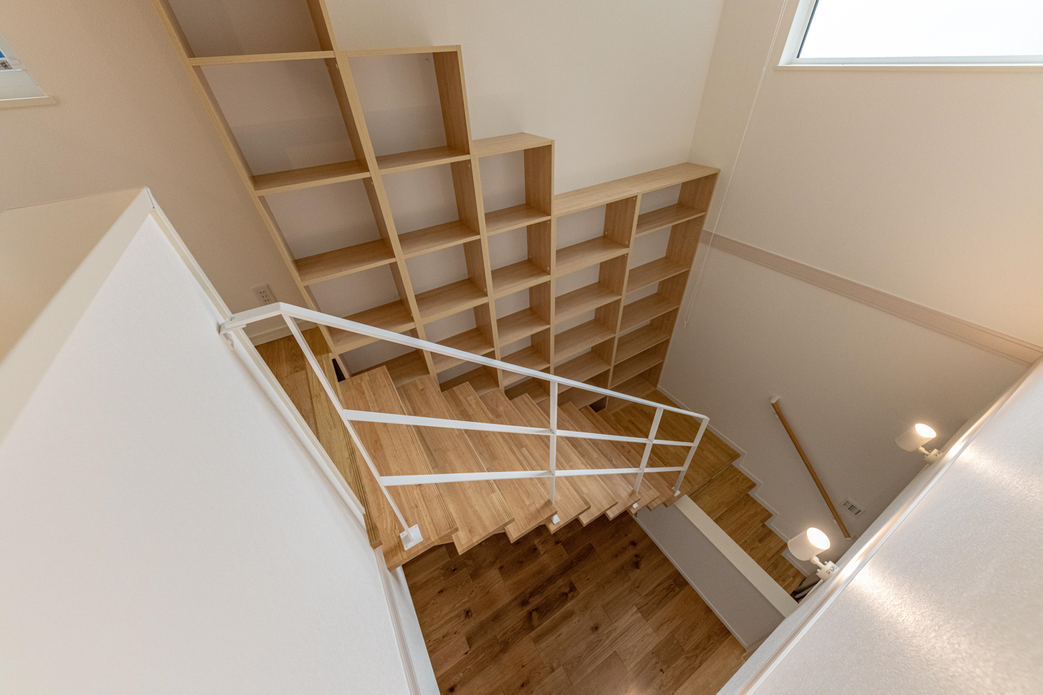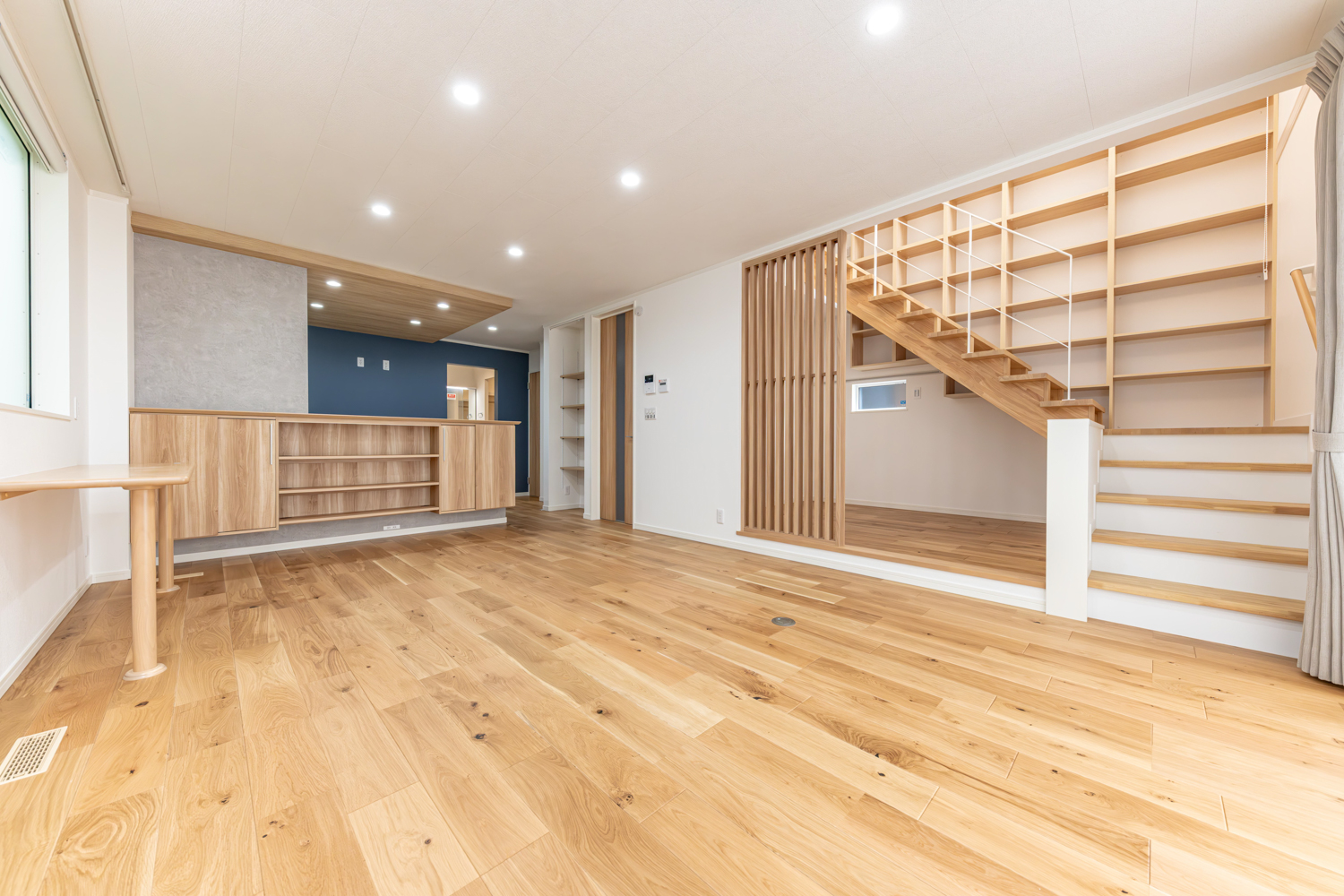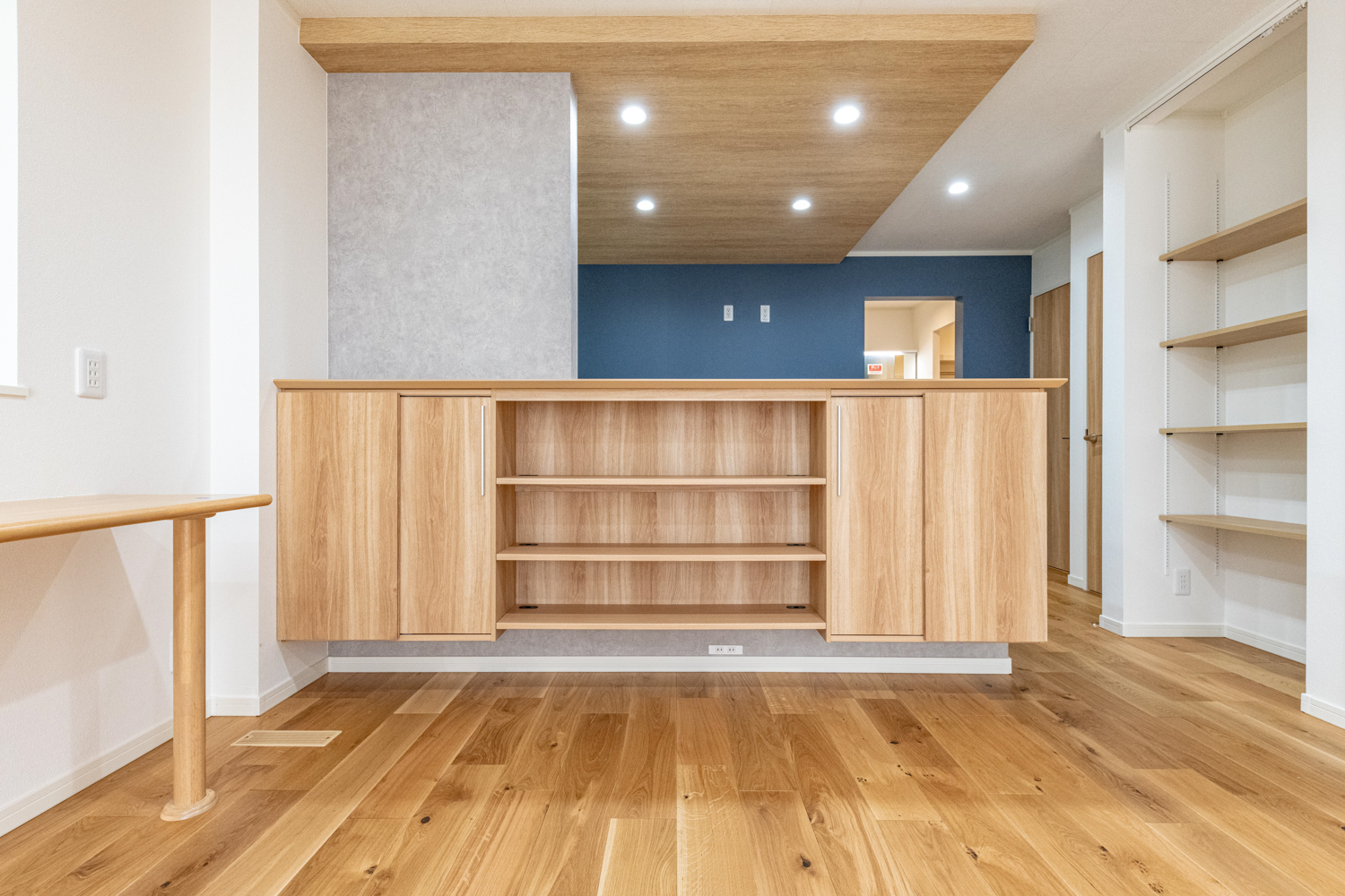 リビングにはダイニング収納や棚が充実し、カウンターは仕事や勉強にぴったり。吹き抜けのオープン階段は開放感があり、階段下の書斎は落ち着いたワークスペースに。さらに、壁面の造作棚にはお気に入りの本や趣味のアイテムを飾り、自分らしい空間を演出。暮らしやすさとデザイン性を兼ね備え、日々の生活を豊かにしてくれるお家が完成しました。