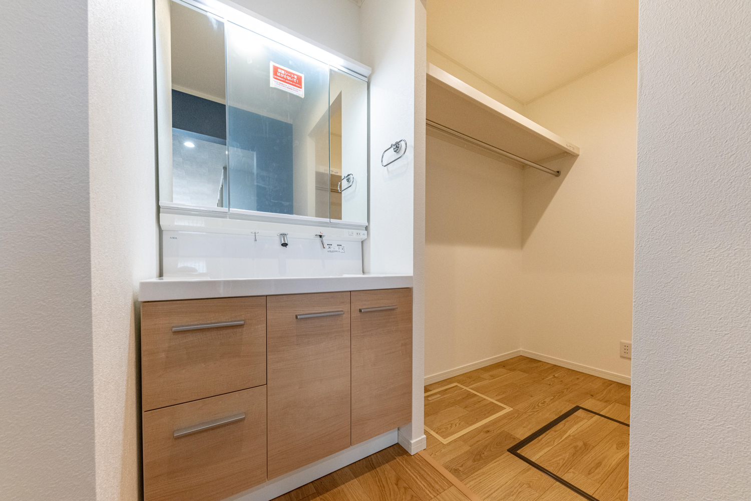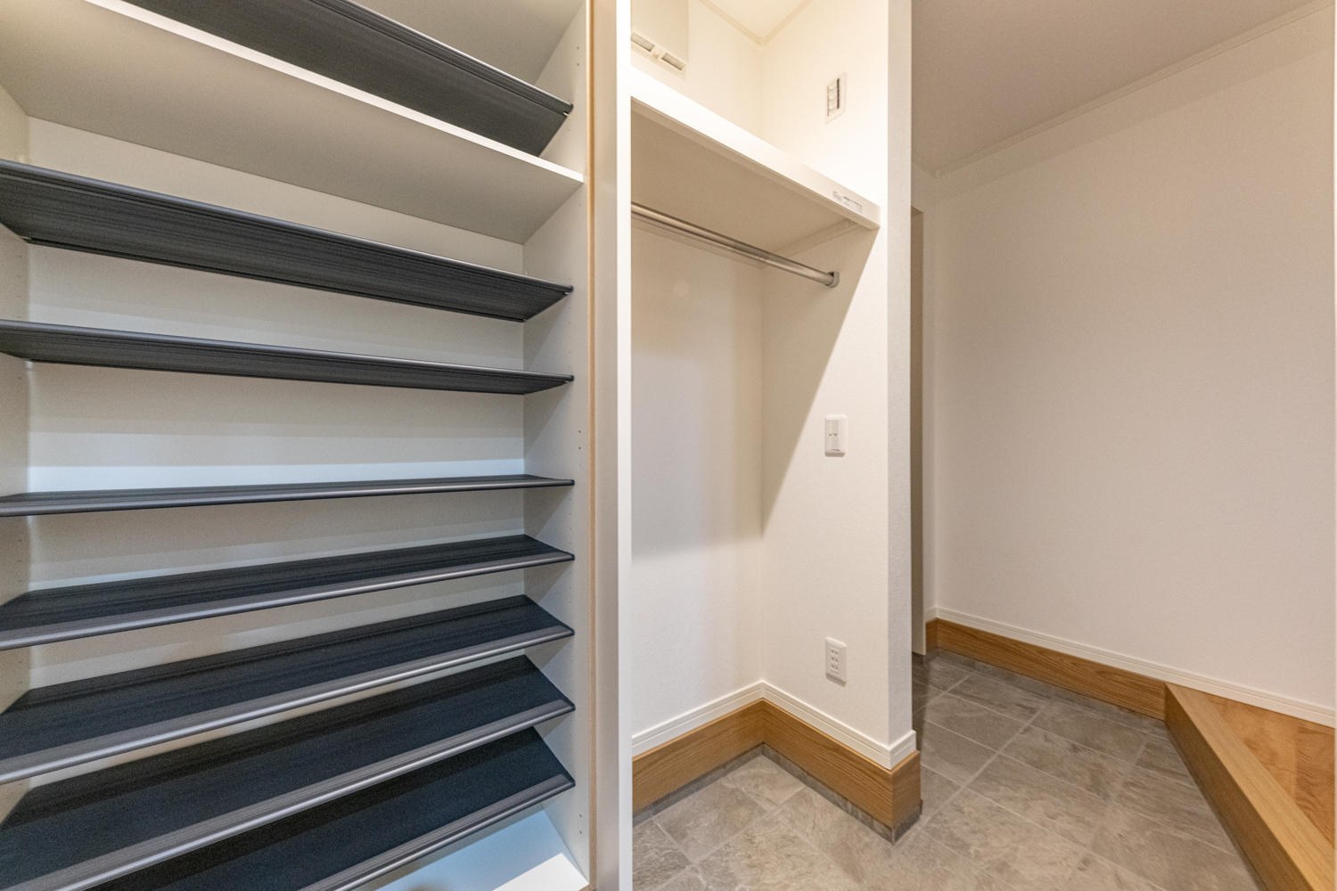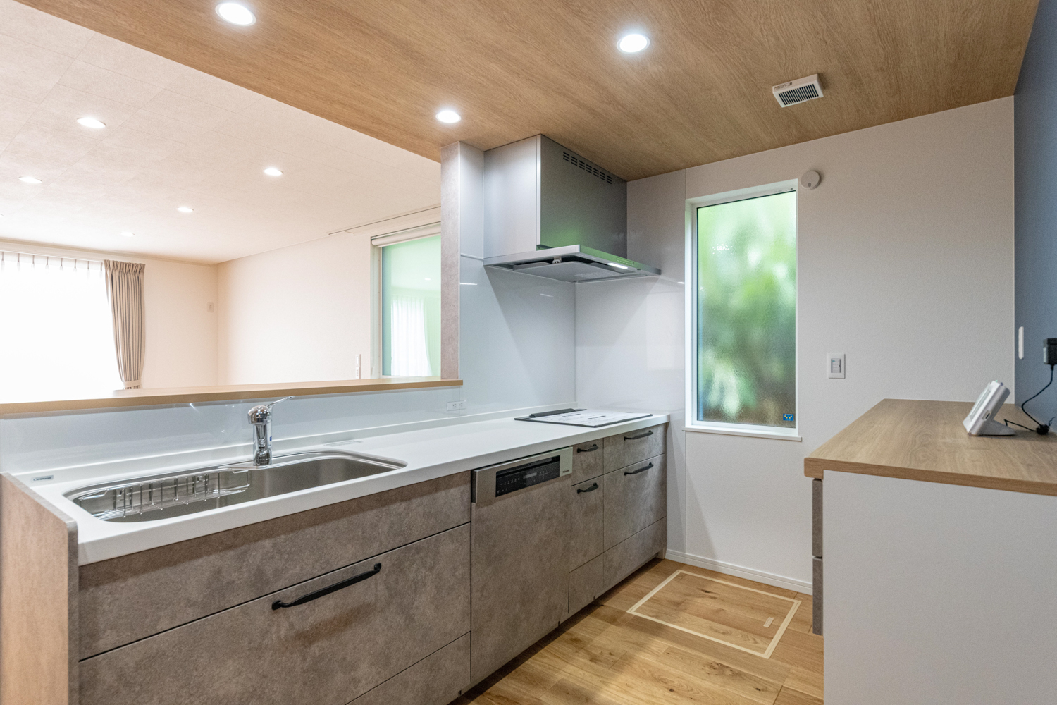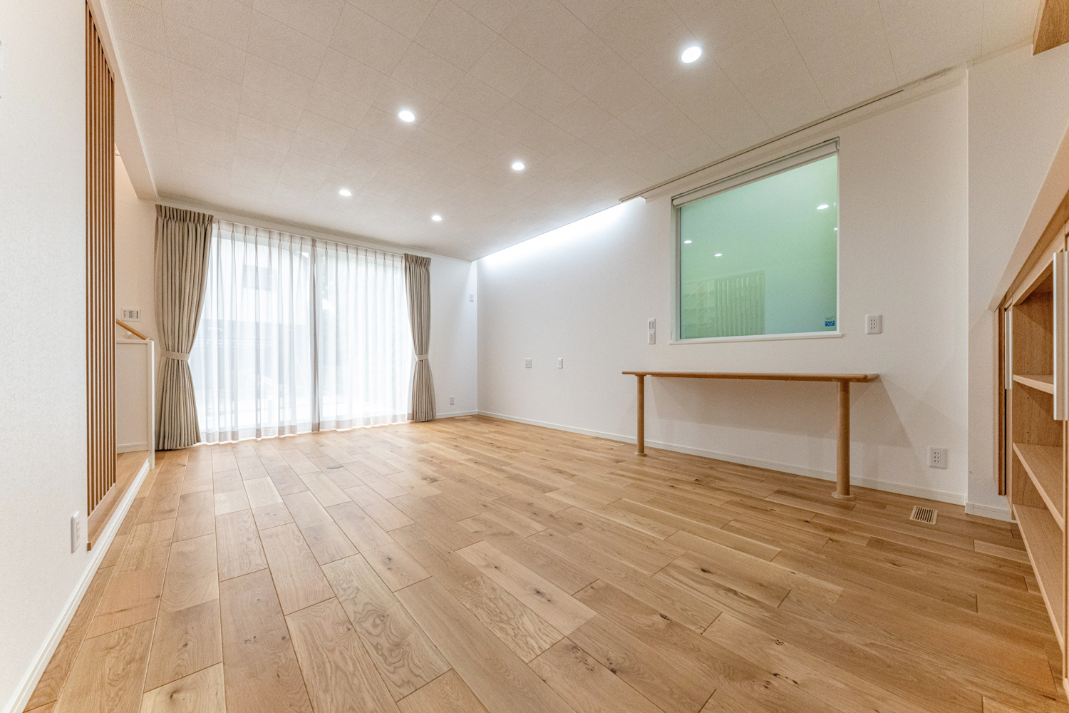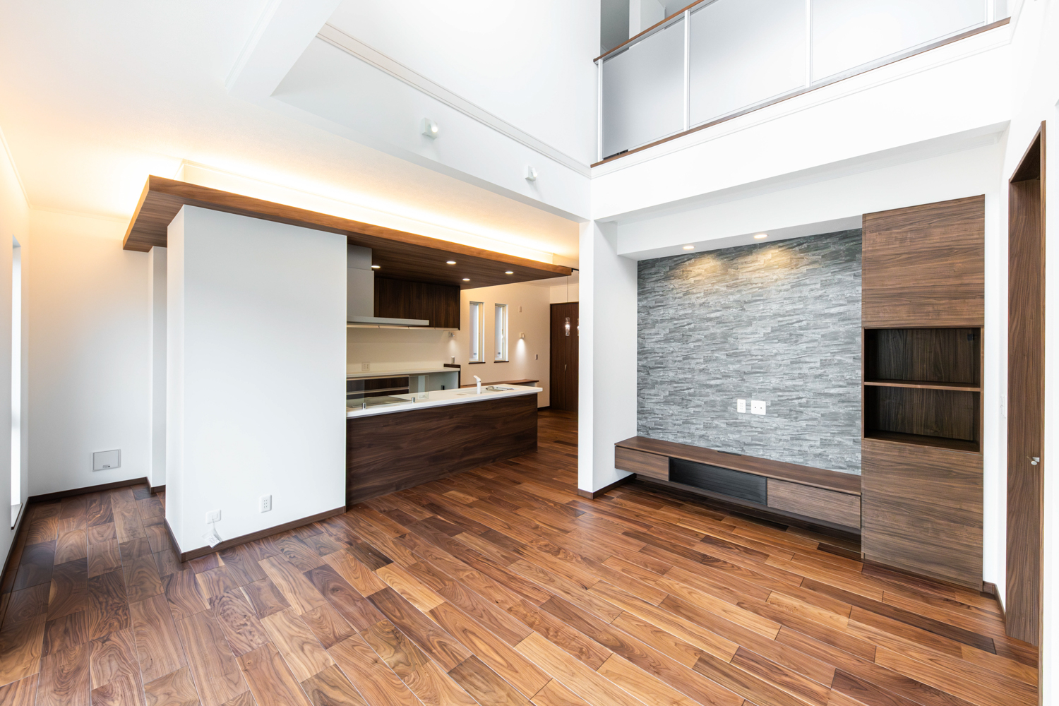 リビングにはダイニング収納や棚が充実し、カウンターは仕事や勉強にぴったり。吹き抜けのオープン階段は開放感があり、階段下の書斎は落ち着いたワークスペースに。さらに、壁面の造作棚にはお気に入りの本や趣味のアイテムを飾り、自分らしい空間を演出。暮らしやすさとデザイン性を兼ね備え、日々の生活を豊かにしてくれるお家が完成しました。