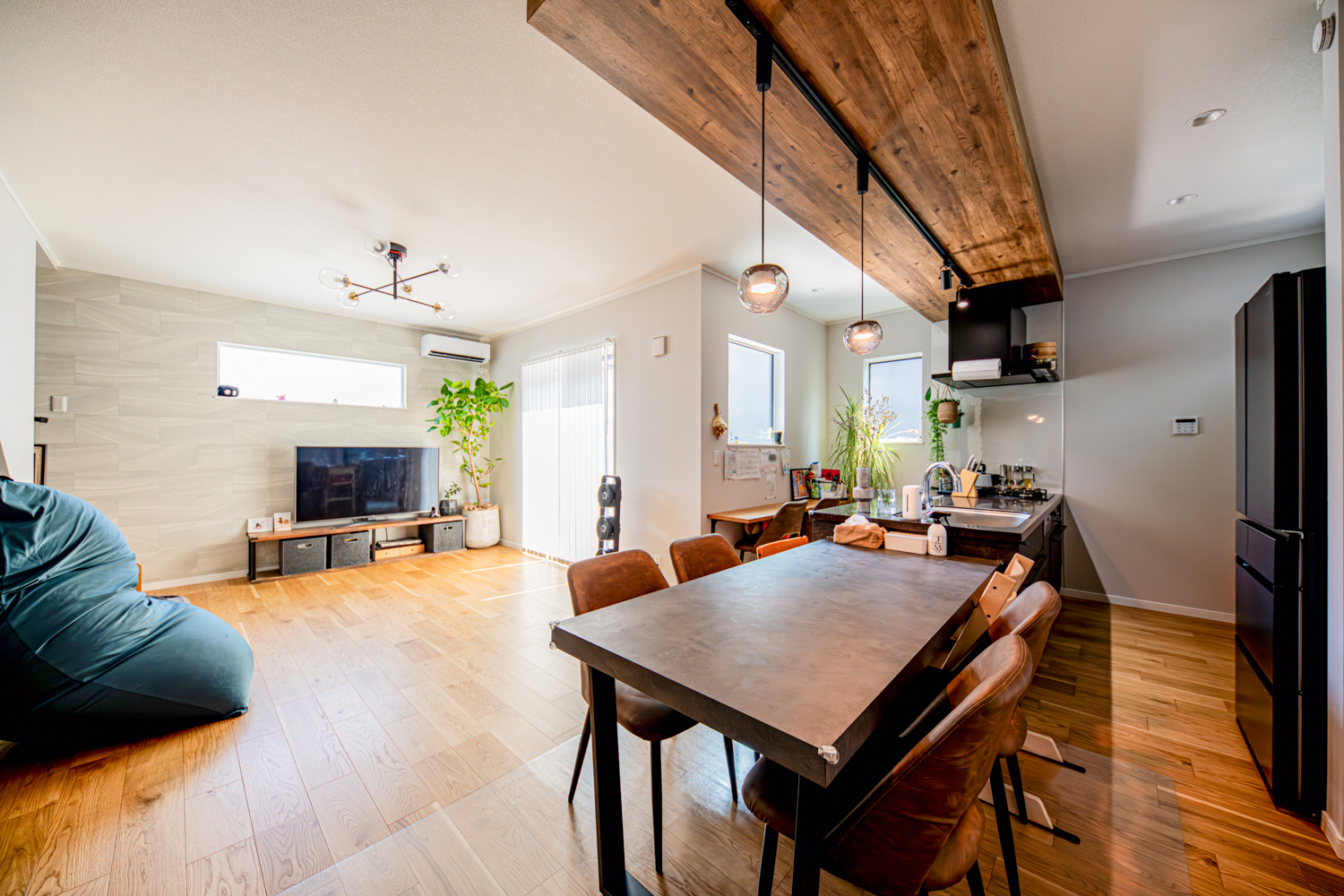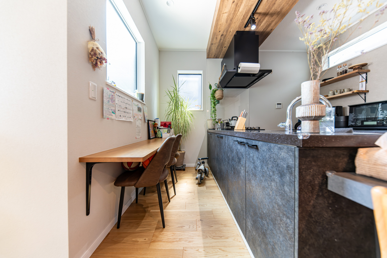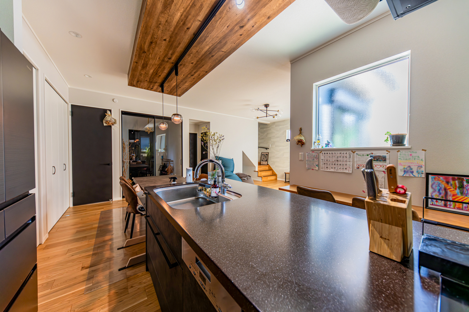 ハイスタッドの伸びやかな天井が心地よいリビングは、スクリーンパーティションの扉で家族の帰宅も自然に感じられる工夫をプラス。廊下を省いた設計で、リビングから2階や水まわりへスムーズに繋がる動線が広がります。シックな木目の下がり天井とロッシュチャコールのペニンシュラキッチンが調和する、上質なくつろぎを楽しめるお家が完成しました。