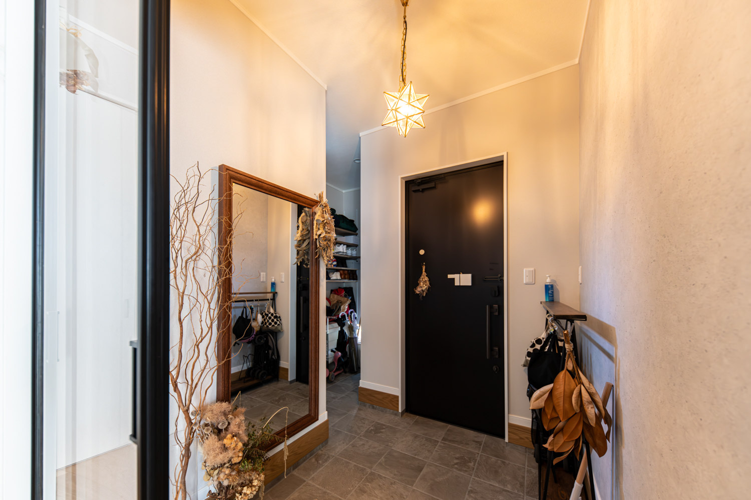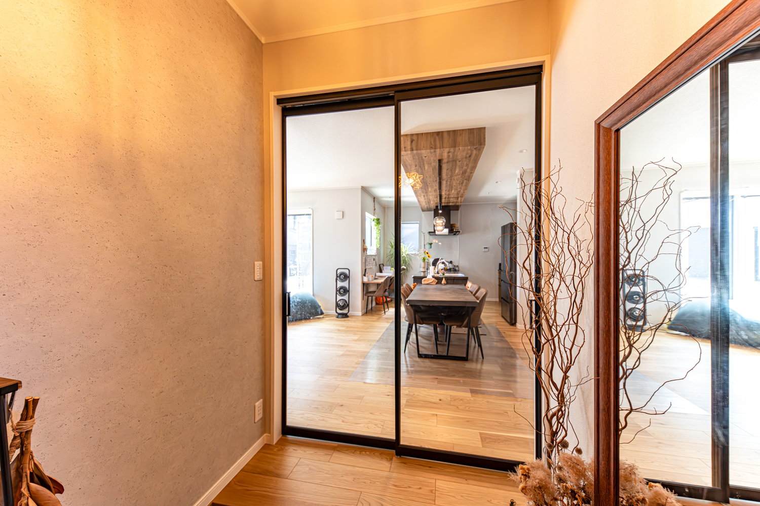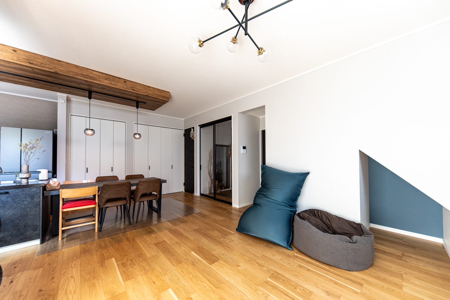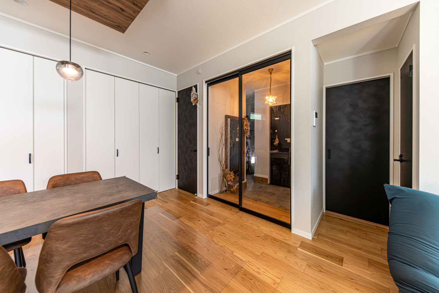 ハイスタッドの伸びやかな天井が心地よいリビングは、スクリーンパーティションの扉で家族の帰宅も自然に感じられる工夫をプラス。廊下を省いた設計で、リビングから2階や水まわりへスムーズに繋がる動線が広がります。シックな木目の下がり天井とロッシュチャコールのペニンシュラキッチンが調和する、上質なくつろぎを楽しめるお家が完成しました。