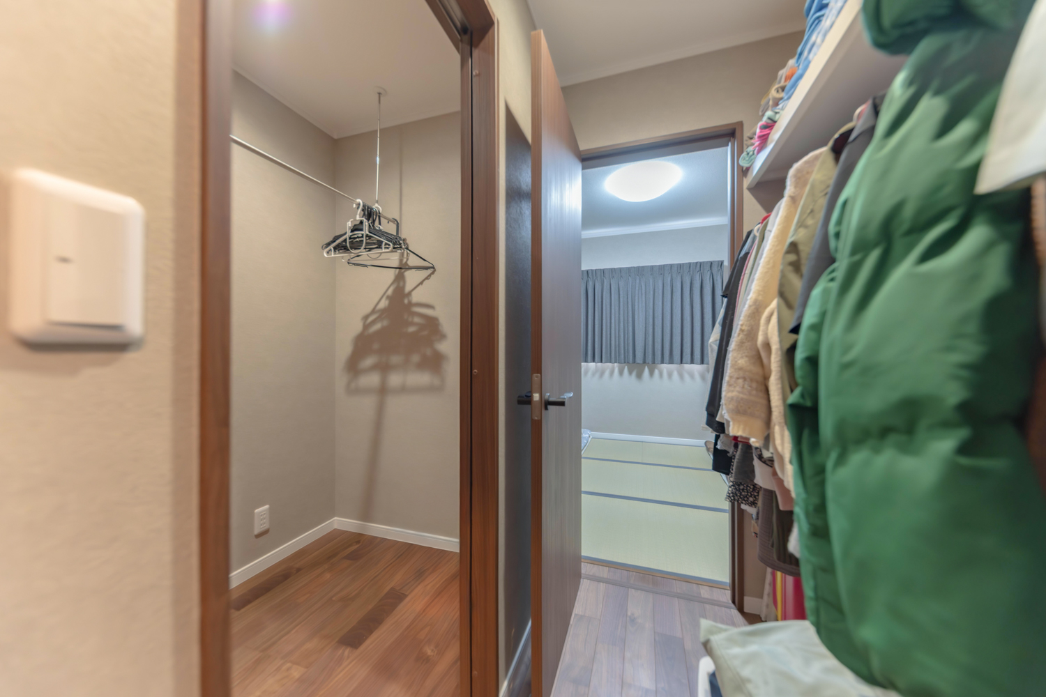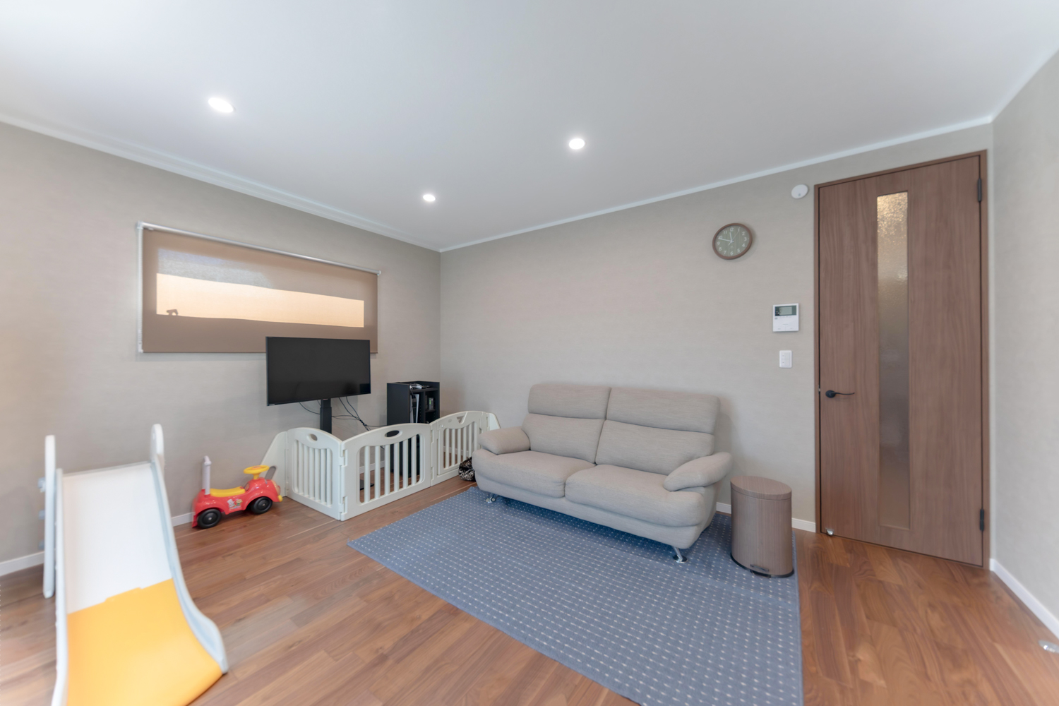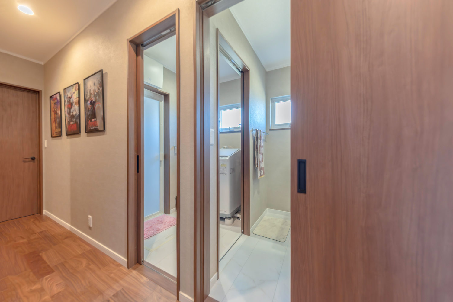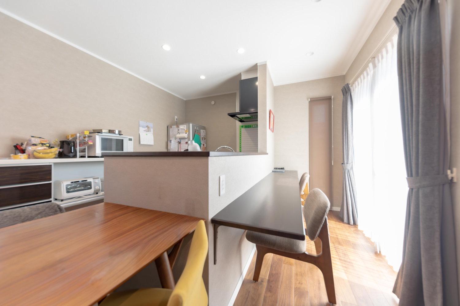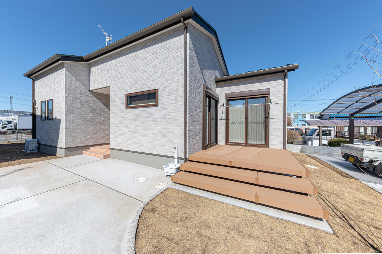 4台分の駐車スペースにウッドデッキと芝生が広がる外構は、暮らしにゆとりをもたらす設計。室内は19帖のリビングを中心に、カウンター付きのキッチンで勉強やPC作業も快適に。洗面と脱衣所は2ドアで仕切られ、家事や身支度もスムーズです。さらに和室からつながるウォークスルークローゼットやランドリースペースなど、便利な動線を備えた暮らしやすいお家が完成しました。