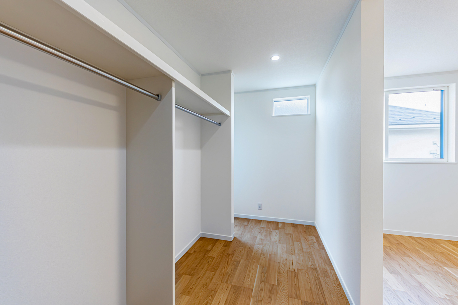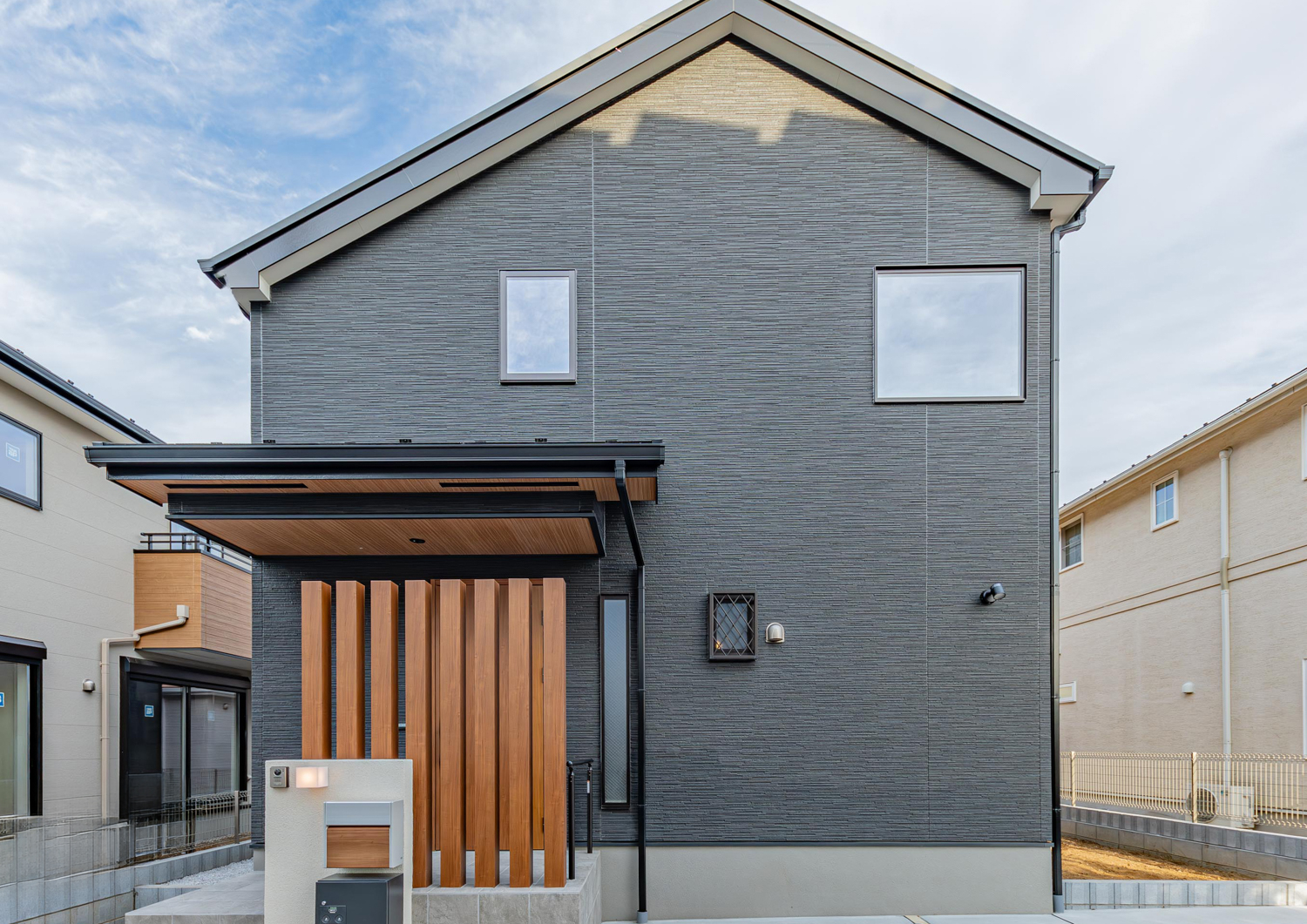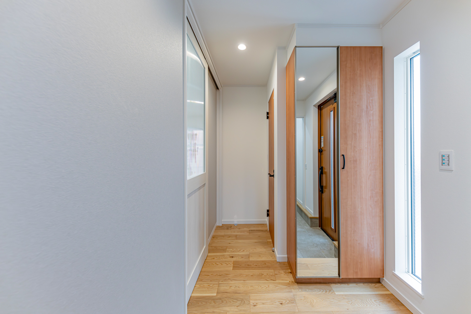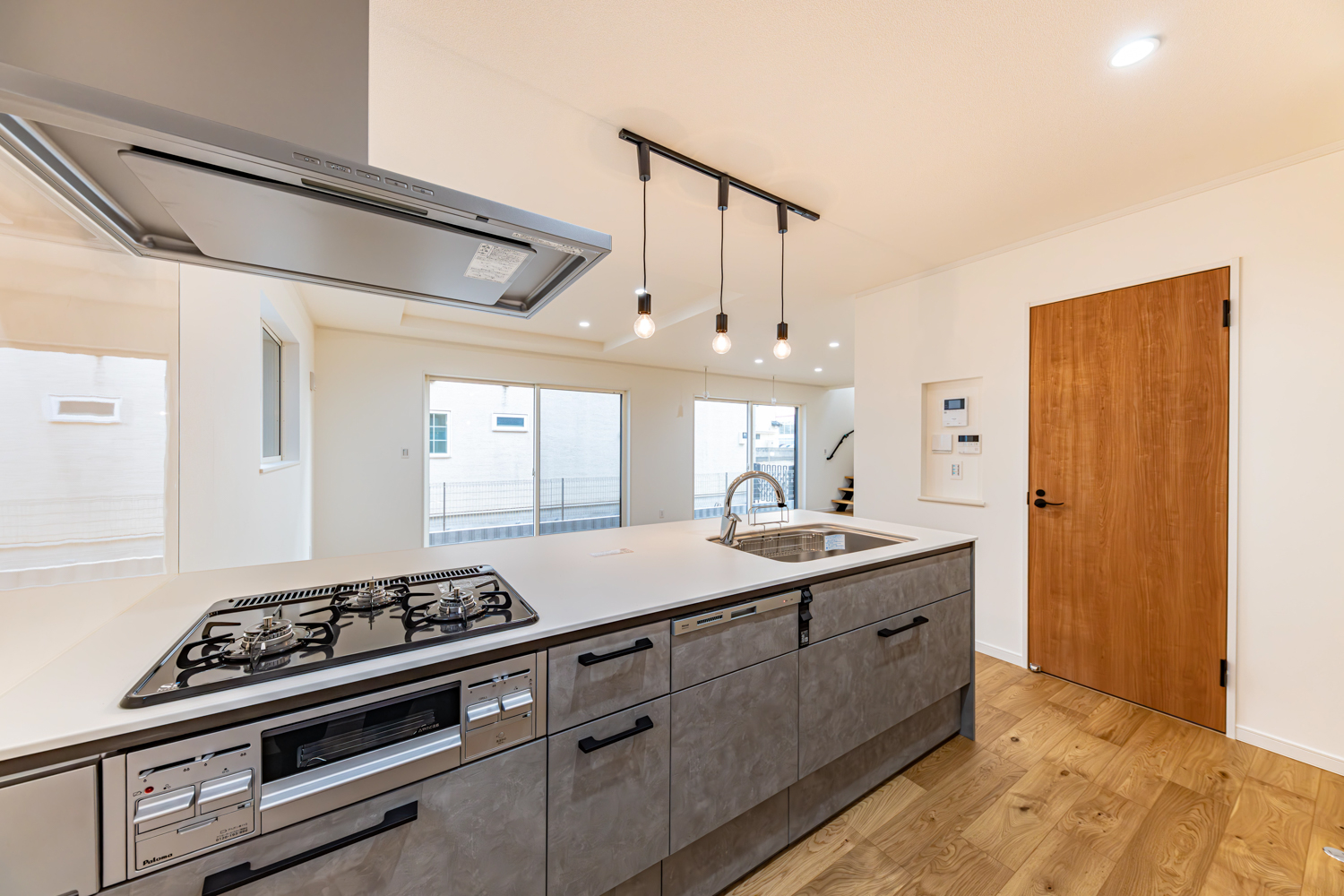 折上げ天井とダウンライトで開放感を演出した23帖のリビング。光や風を遮らないオープン階段や、収納付きのペニンシュラキッチンが暮らしを心地よく支えます。2階には将来的に2部屋にできる洋室や、3方向から出入りできるウォークインクローゼットを設計。バルコニーからそのまま収納へ繋がる洗濯動線も魅力です。随所に工夫が光る、収納豊富なお家が完成しました。