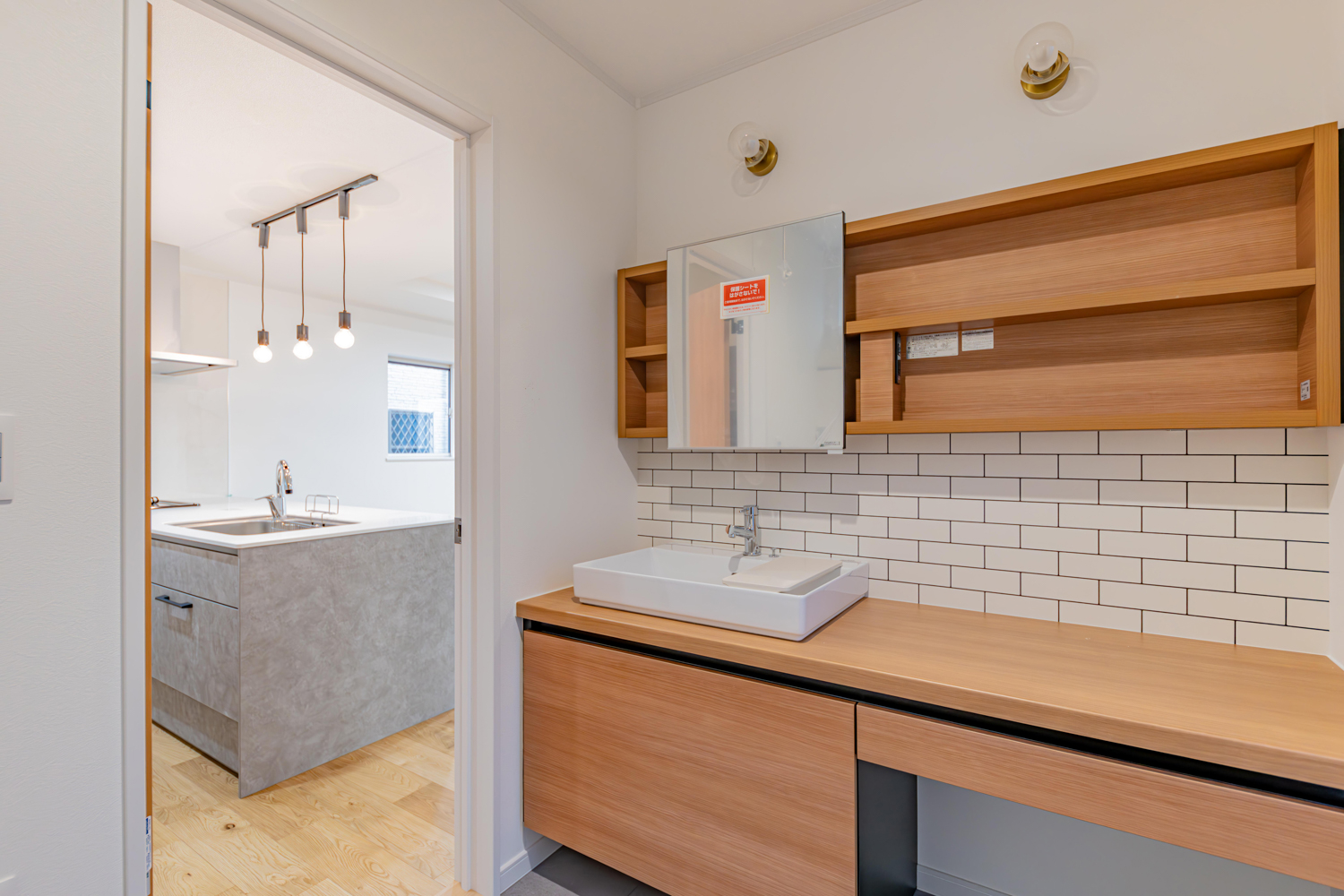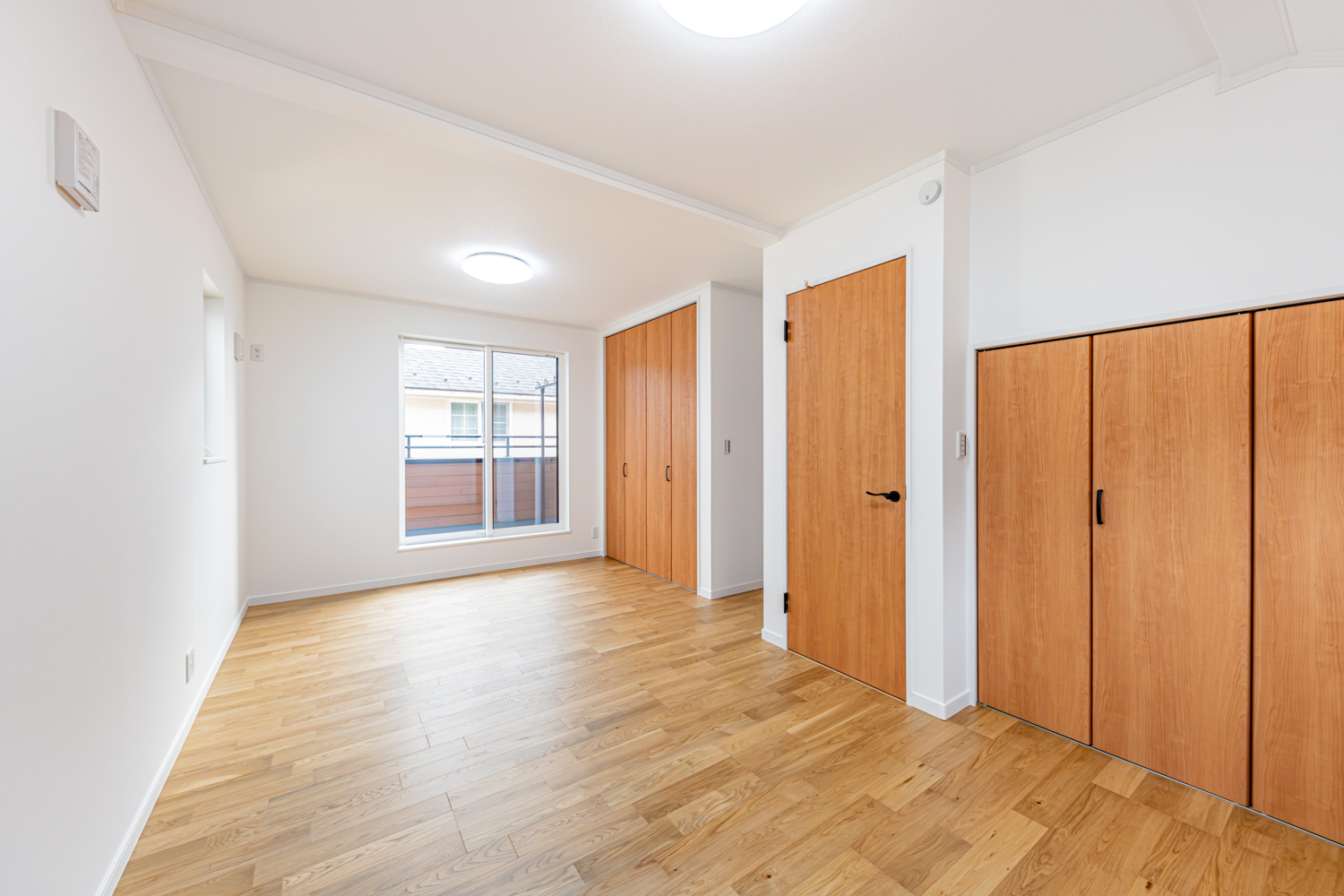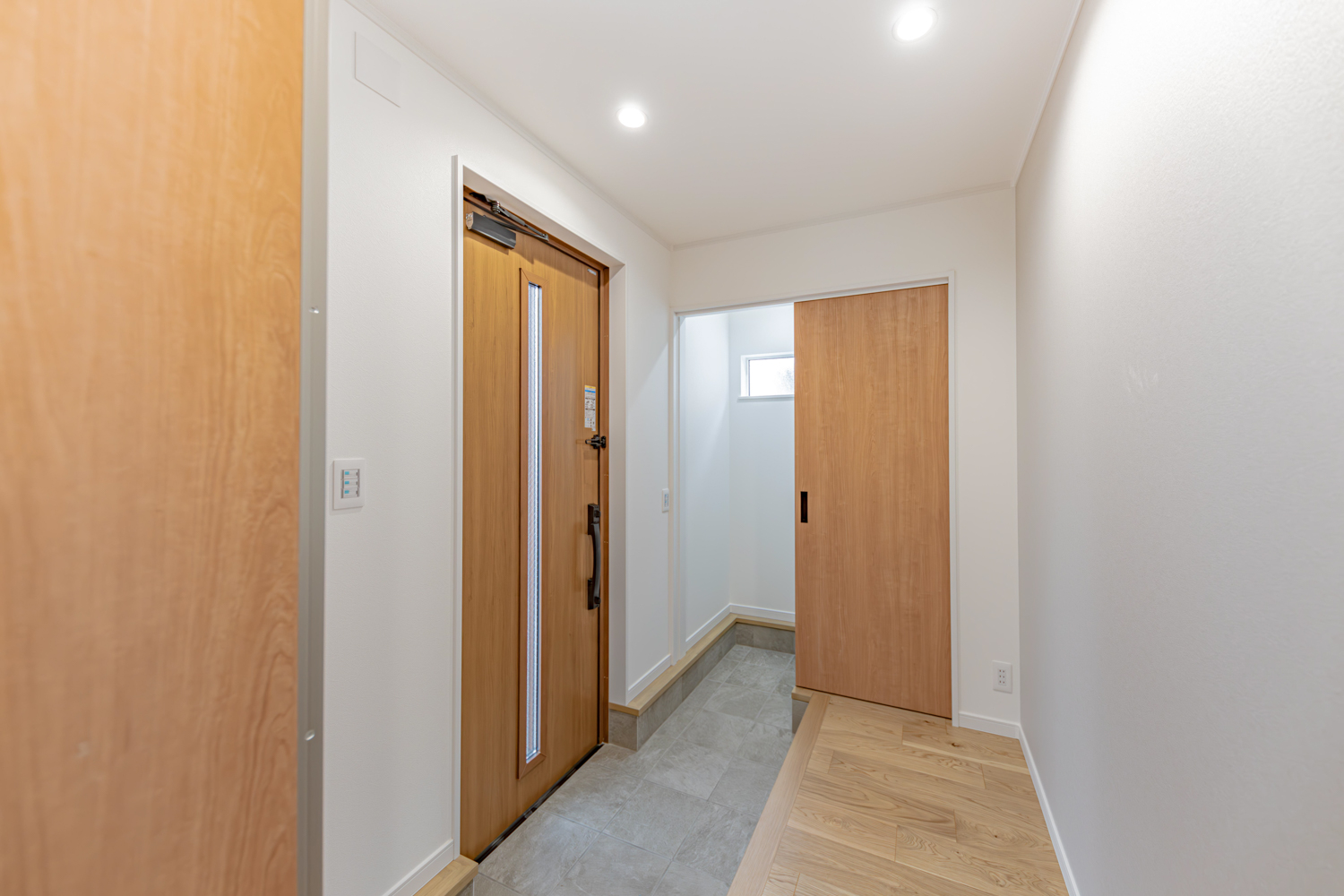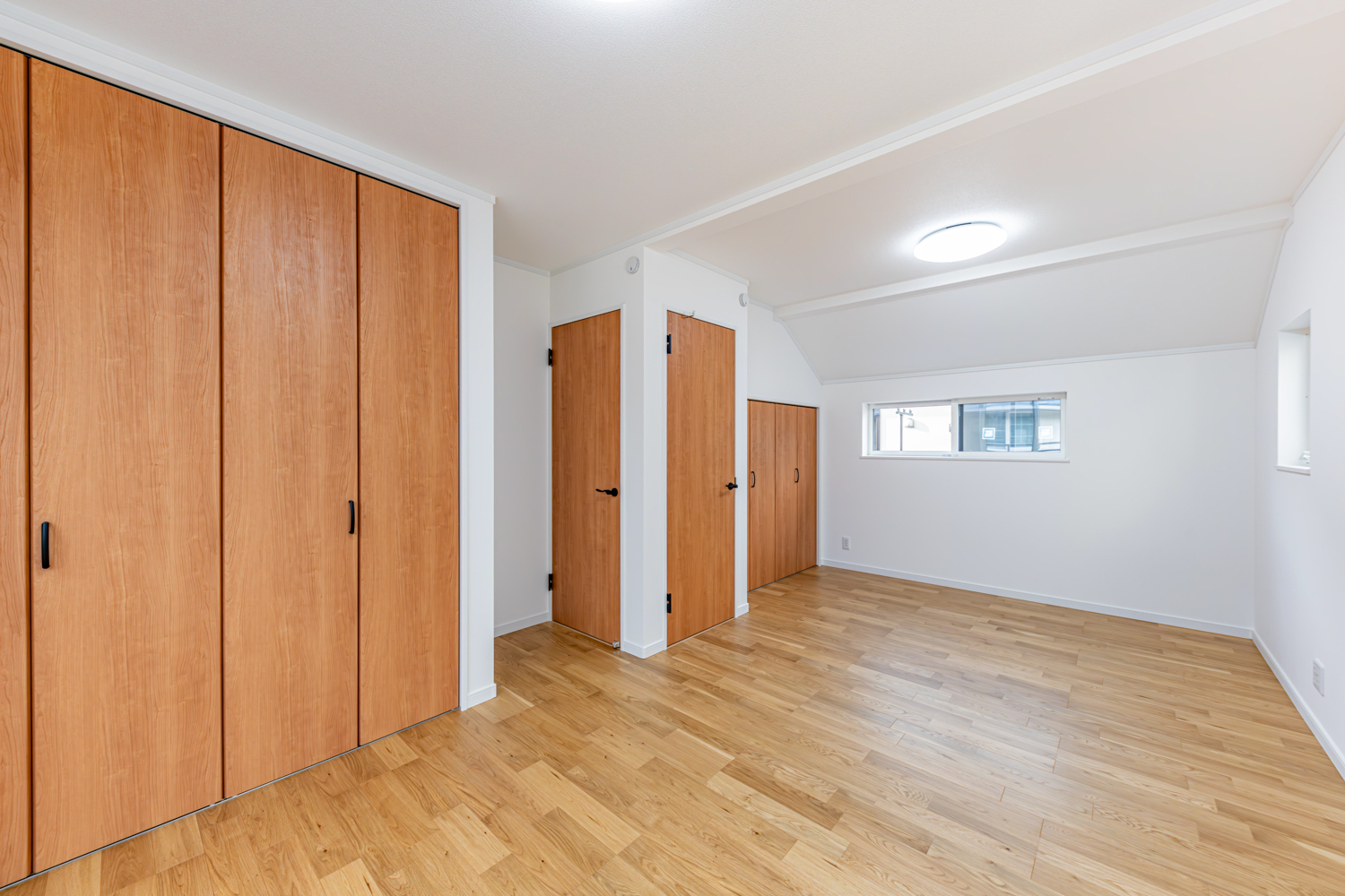 折上げ天井とダウンライトで開放感を演出した23帖のリビング。光や風を遮らないオープン階段や、収納付きのペニンシュラキッチンが暮らしを心地よく支えます。2階には将来的に2部屋にできる洋室や、3方向から出入りできるウォークインクローゼットを設計。バルコニーからそのまま収納へ繋がる洗濯動線も魅力です。随所に工夫が光る、収納豊富なお家が完成しました。