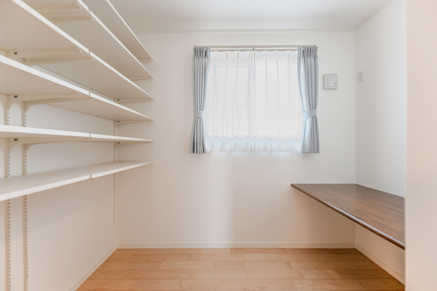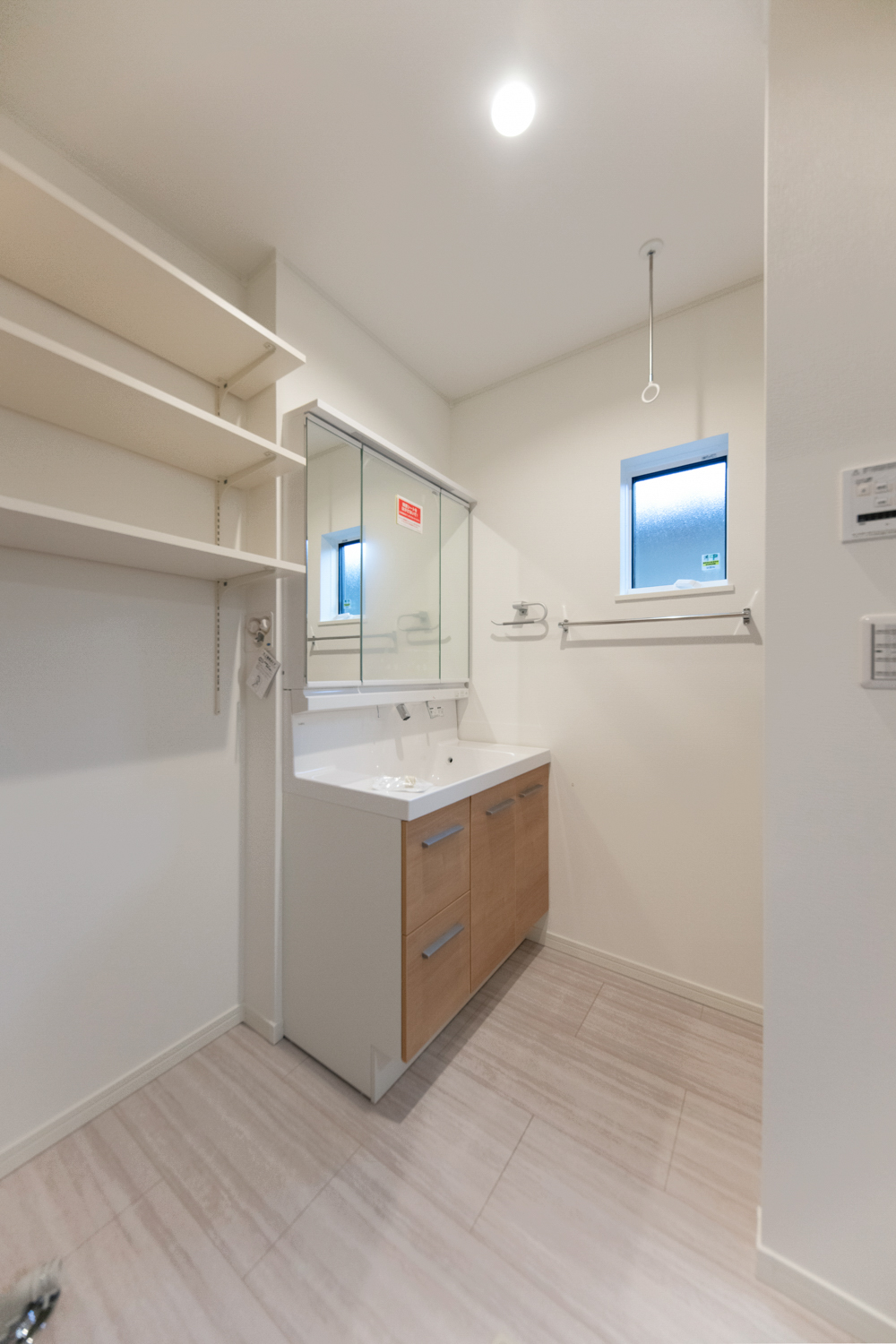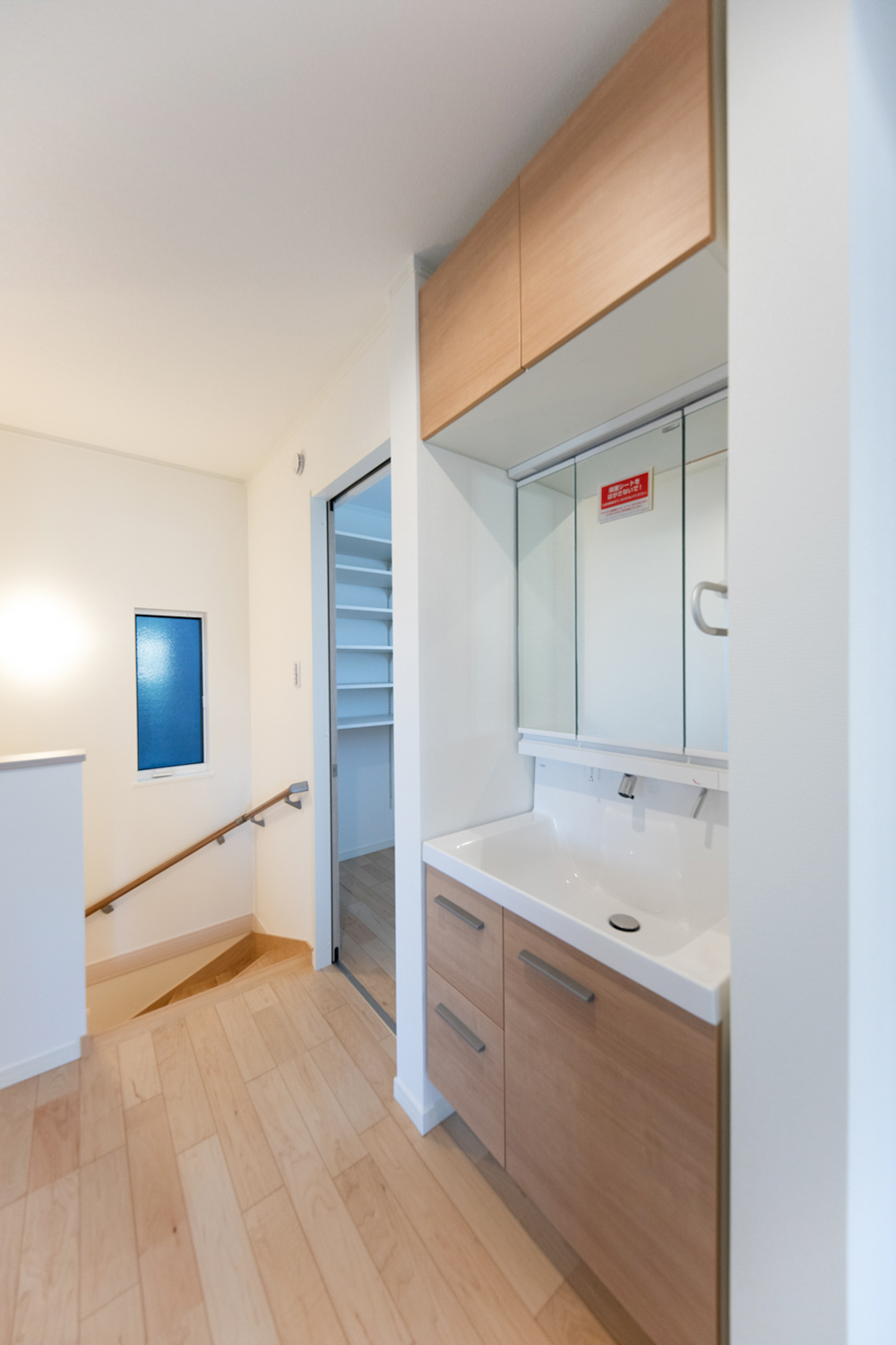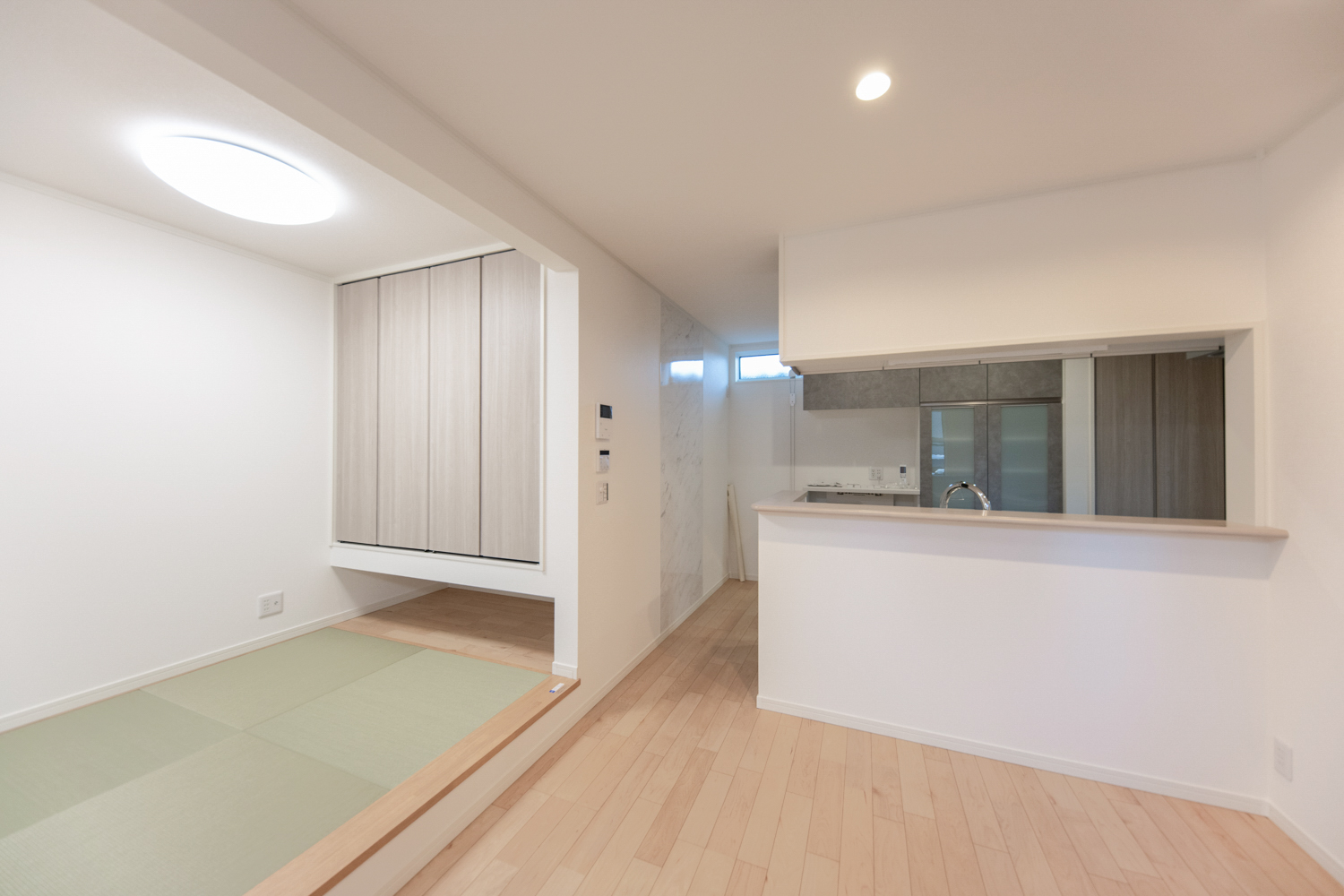 小上がりのあるリビングは、家族が自然と集まる心地よい空間。3帖のウォークインクローゼットや2.75帖の書斎は、暮らしにゆとりを生み出します。2階にはセカンド洗面やインナーバルコニーを設け、3か所の室内物干しが日々の家事をスマートにサポート。快適な住まいの工夫が詰まったお家が完成しました。