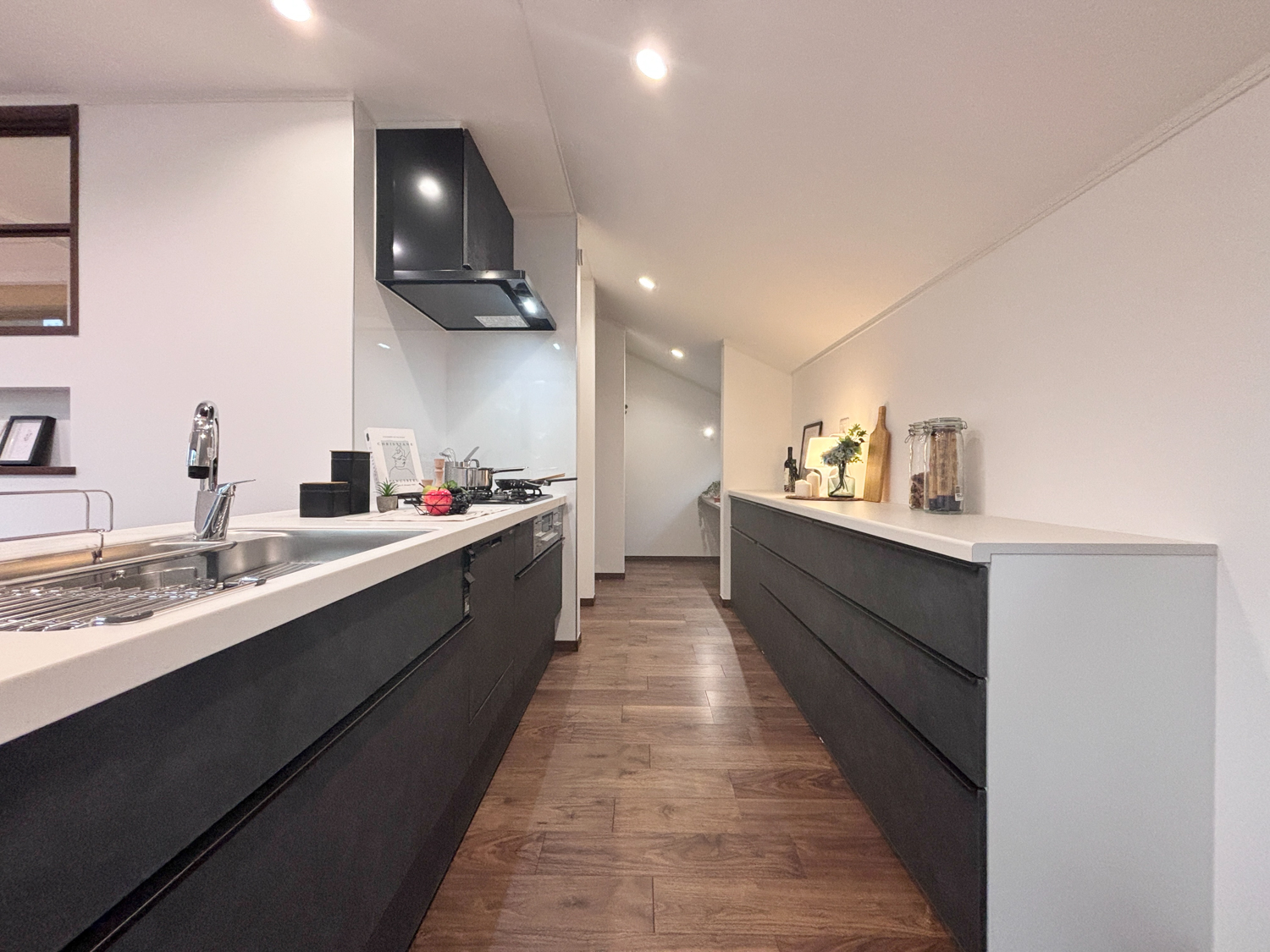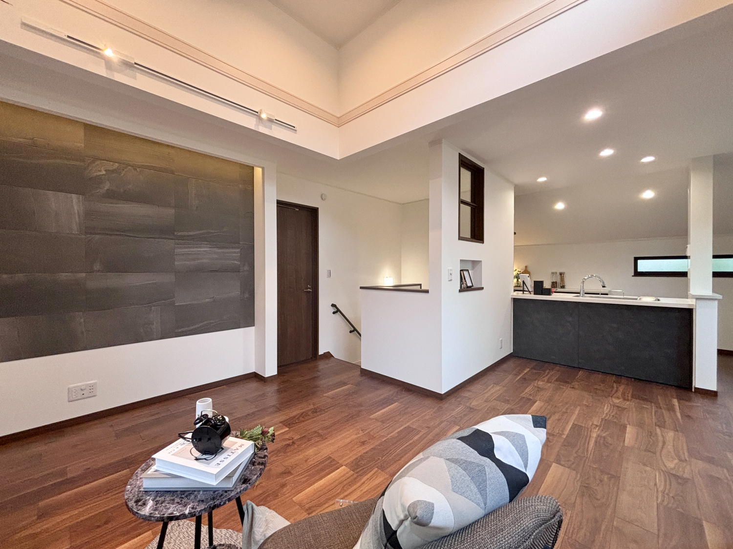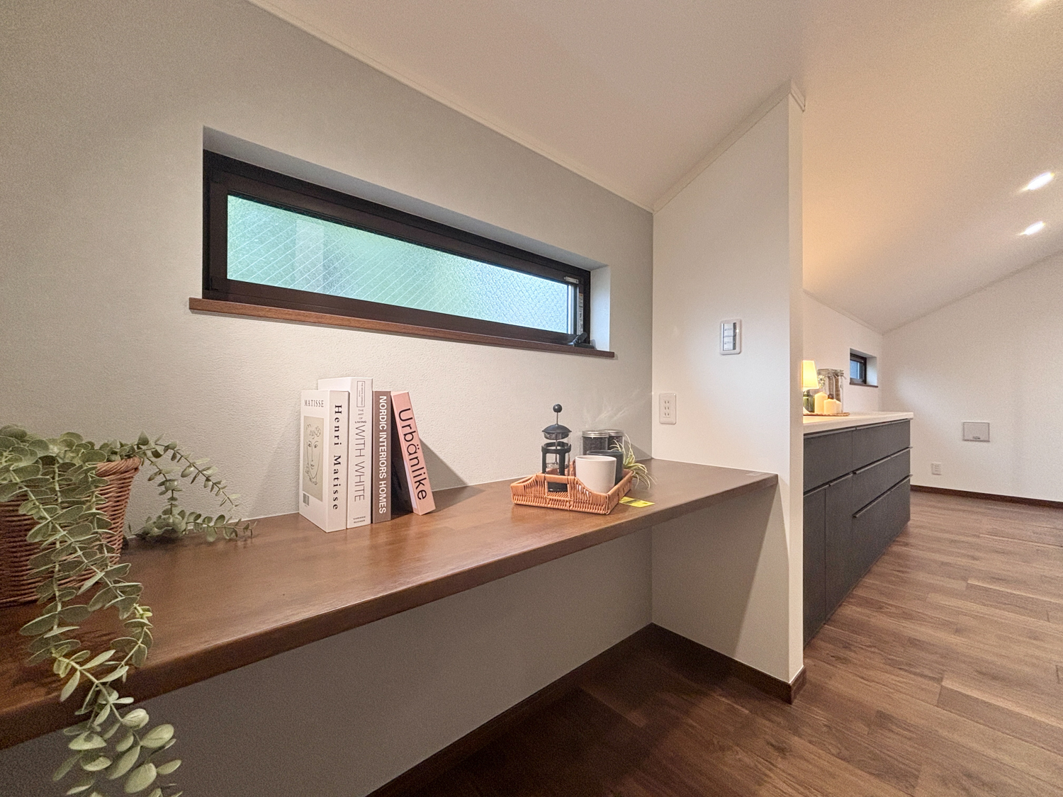 天井高のリビングが心地よい開放感をもたらす2階リビングの住まい。キッチン横には収納棚とカウンタースペースを設け、家事や作業も快適にこなせます。リビングとカウンターの2方向から行き来できる回遊動線で、暮らしの動きもスムーズに。ガラス壁の向こうに景色が広がるバルコニーで、くつろぎの時間を楽しめるお家が完成しました。