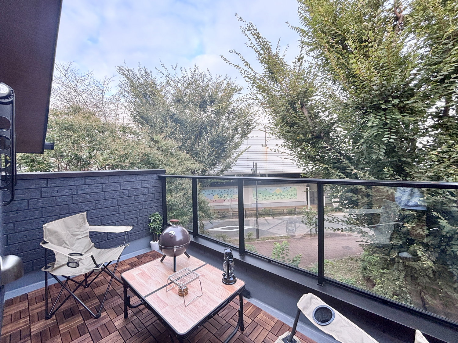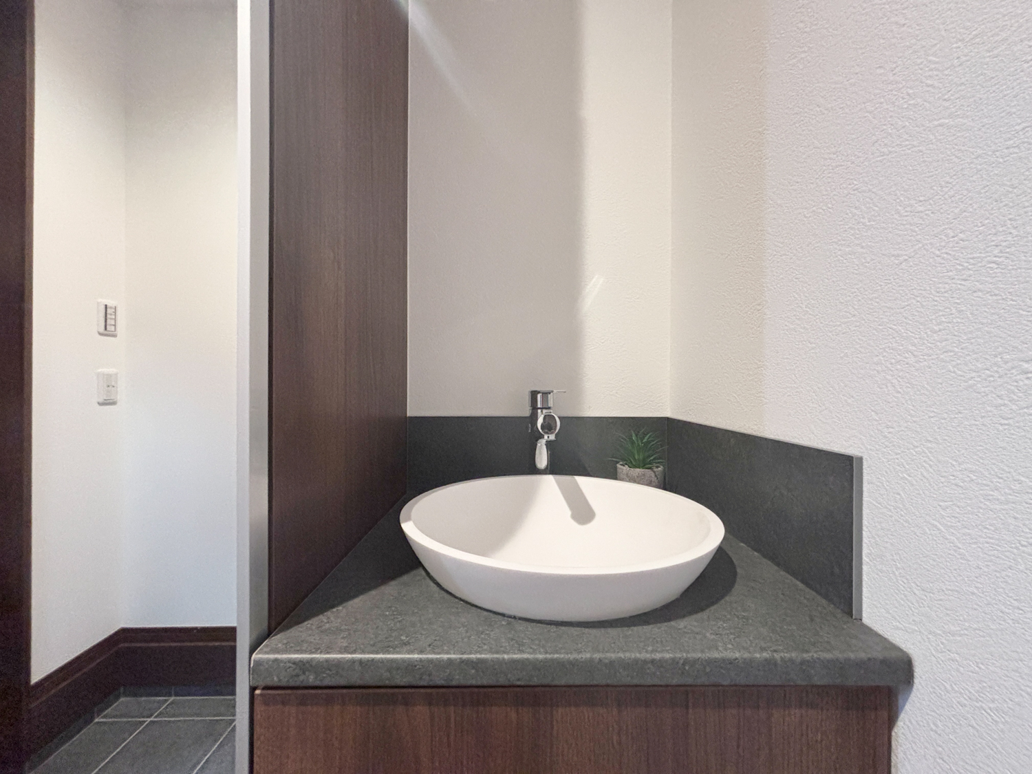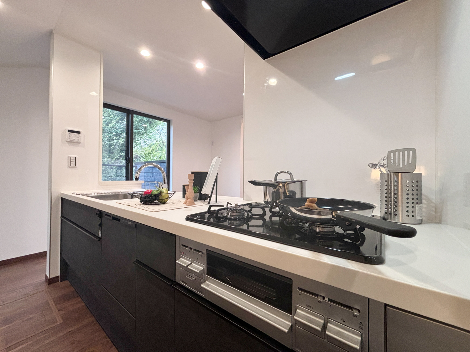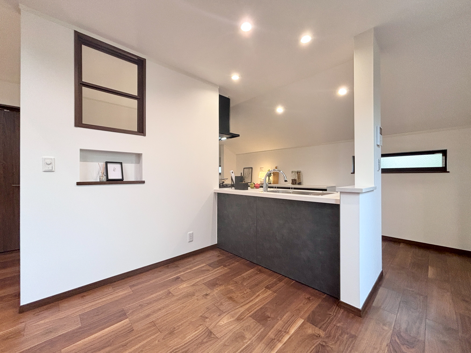 天井高のリビングが心地よい開放感をもたらす2階リビングの住まい。キッチン横には収納棚とカウンタースペースを設け、家事や作業も快適にこなせます。リビングとカウンターの2方向から行き来できる回遊動線で、暮らしの動きもスムーズに。ガラス壁の向こうに景色が広がるバルコニーで、くつろぎの時間を楽しめるお家が完成しました。