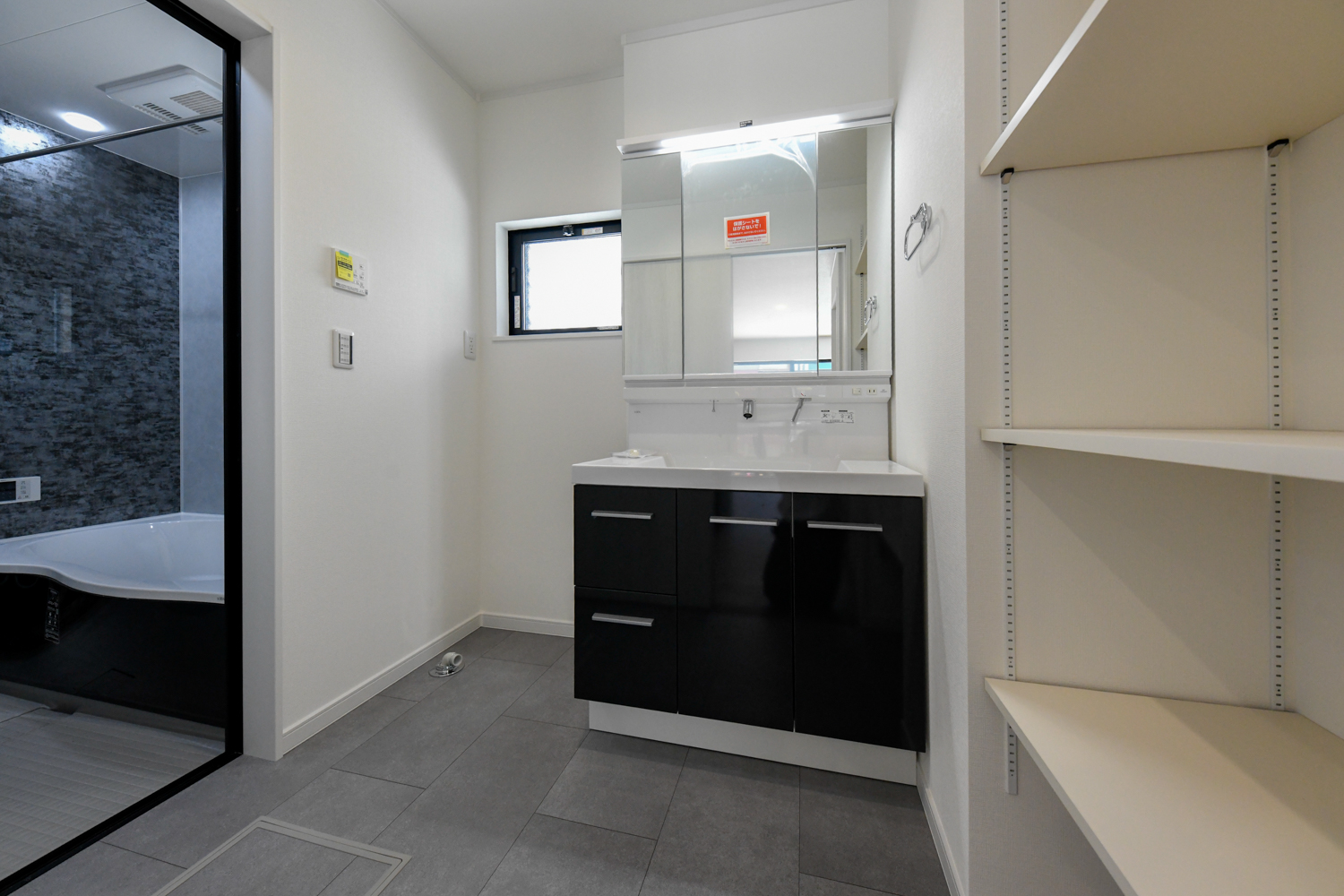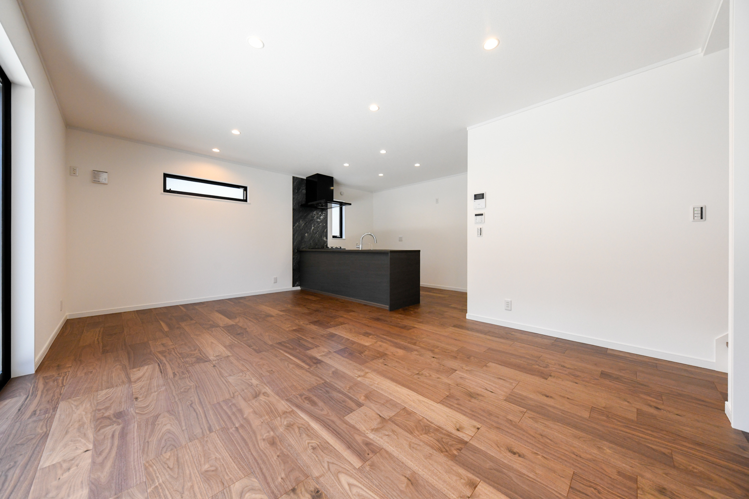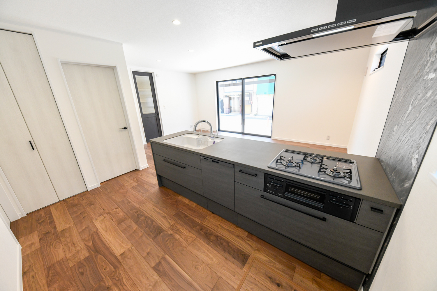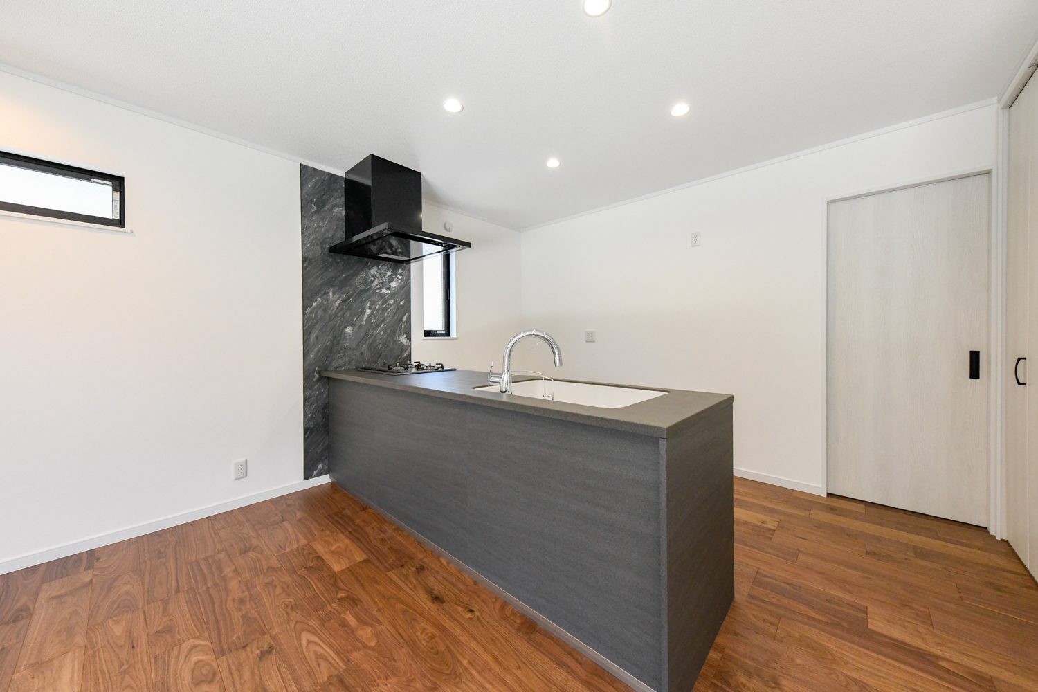白いクロスにブラックウォルナットの床が映える、コントラストが美しい住まい。キッチンはグレーストーンの扉とブラックカウンターを組み合わせ、眺望を楽しめるペニンシュラ型に。サイドパネルの大理石調デザインが空間に上質感を添えます。バスルームもシックな色合いで統一された、洗練された雰囲気のお家が完成しました。