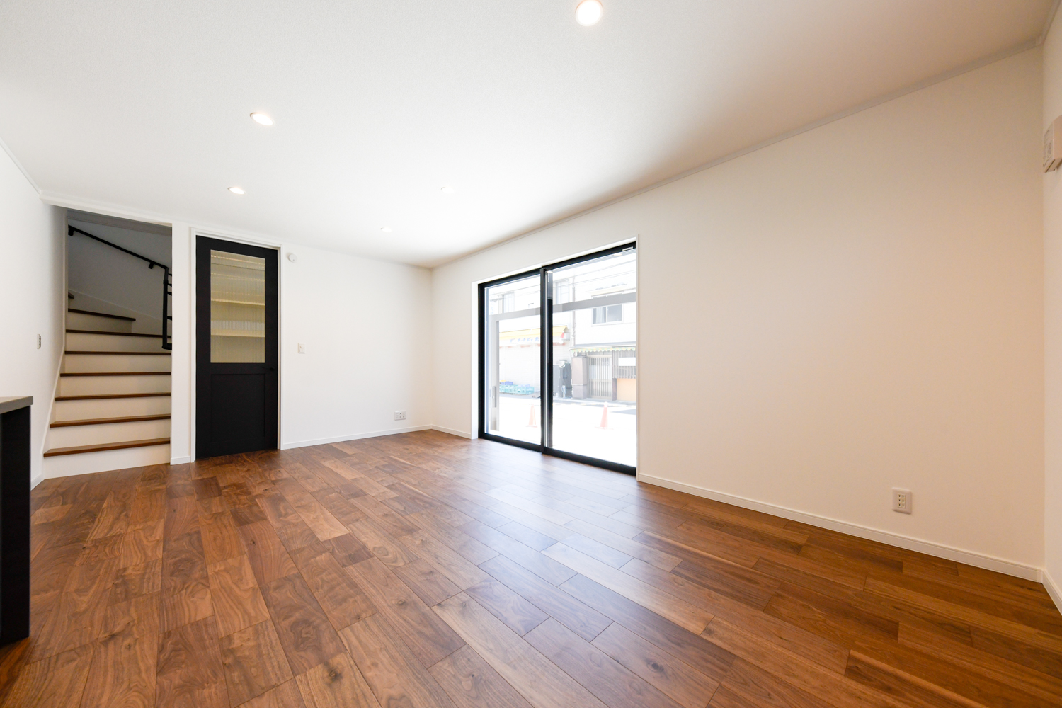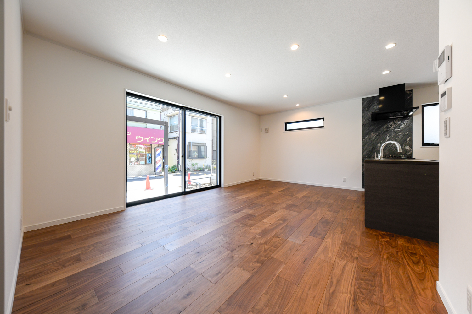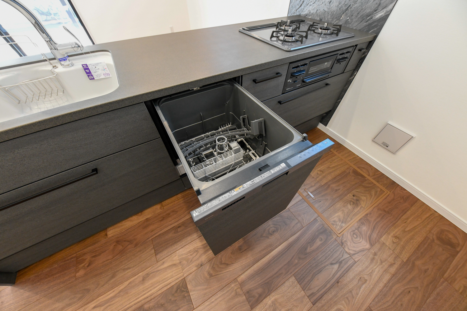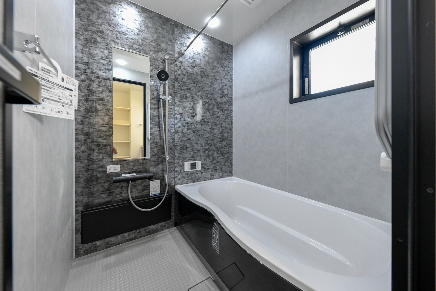 白いクロスにブラックウォルナットの床が映える、コントラストが美しい住まい。キッチンはグレーストーンの扉とブラックカウンターを組み合わせ、眺望を楽しめるペニンシュラ型に。サイドパネルの大理石調デザインが空間に上質感を添えます。バスルームもシックな色合いで統一された、洗練された雰囲気のお家が完成しました。