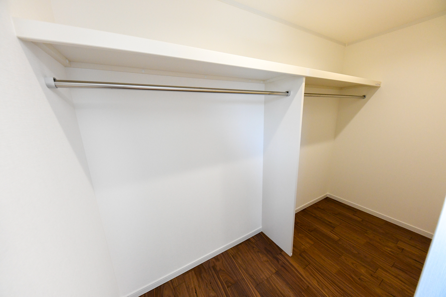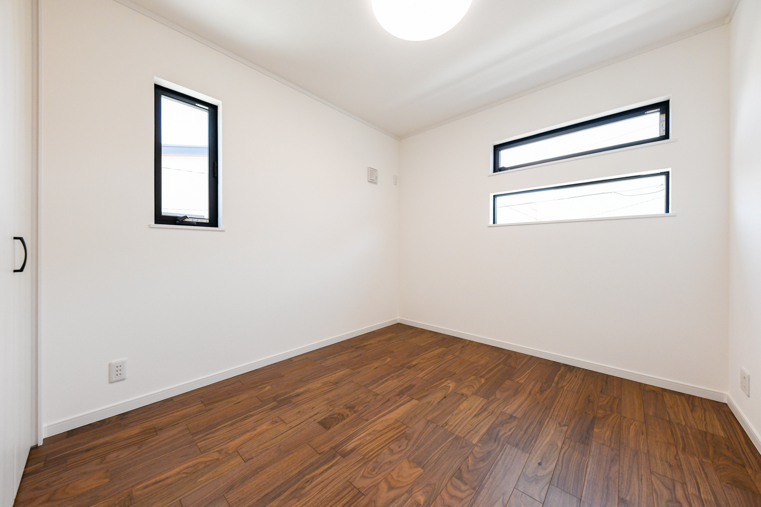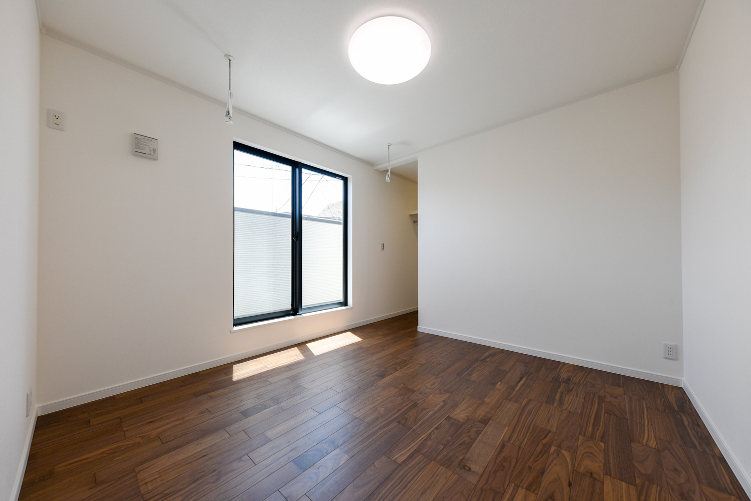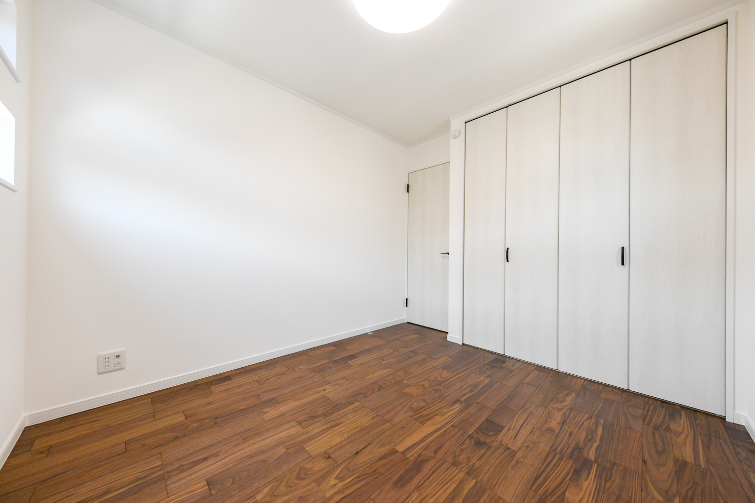 白いクロスにブラックウォルナットの床が映える、コントラストが美しい住まい。キッチンはグレーストーンの扉とブラックカウンターを組み合わせ、眺望を楽しめるペニンシュラ型に。サイドパネルの大理石調デザインが空間に上質感を添えます。バスルームもシックな色合いで統一された、洗練された雰囲気のお家が完成しました。