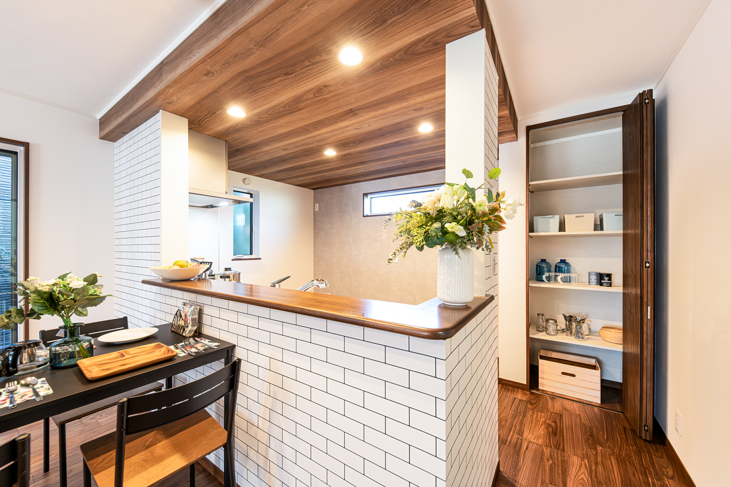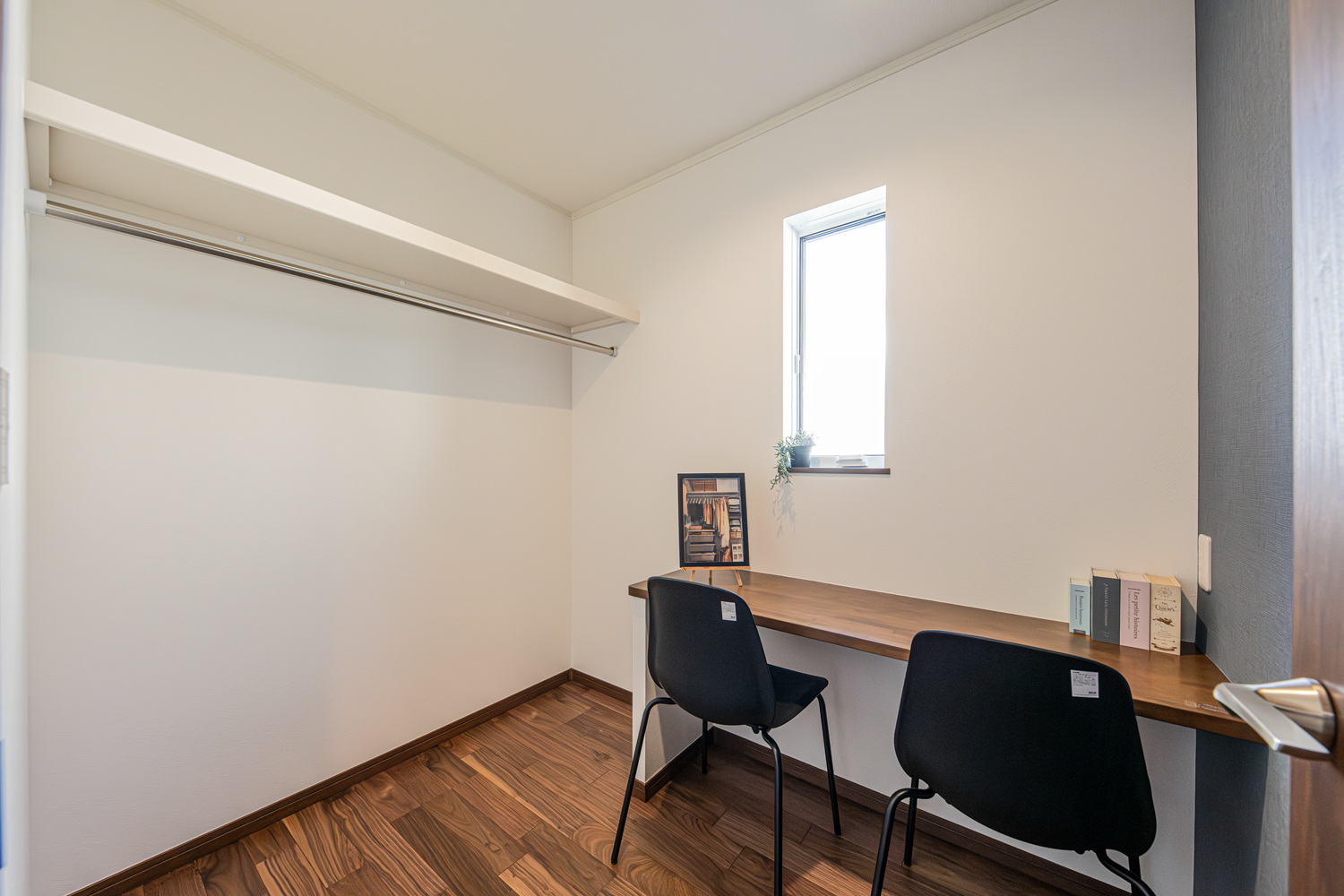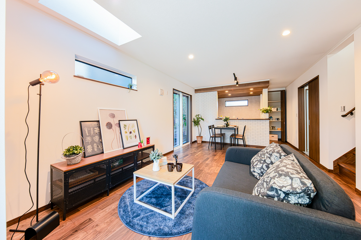 1件目は、ブラックウォルナットの深みが引き立つ上品な空間。2階には読書や作業にったりなカウンター付きのフリースペースを設けました。2件目は、オークの床にブルーペイントのドアや様々な模様のアクセントクロスが映える、やわらかな雰囲気の住まい。リビングには小上がりの書斎を備えた、個性あふれるお家が完成しました。