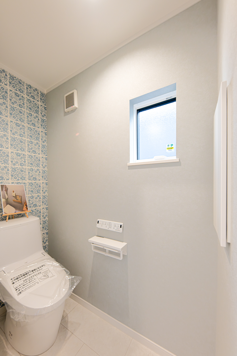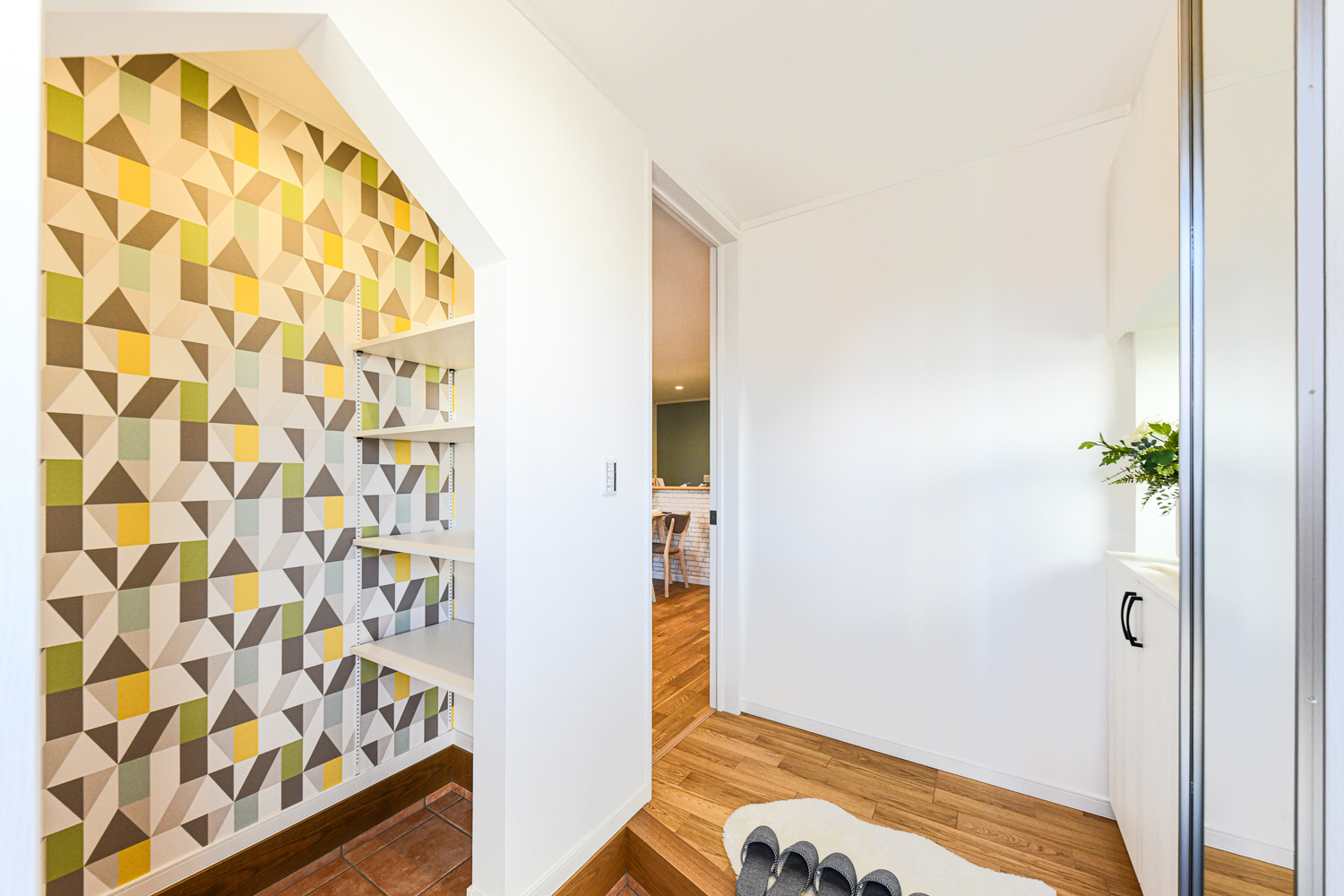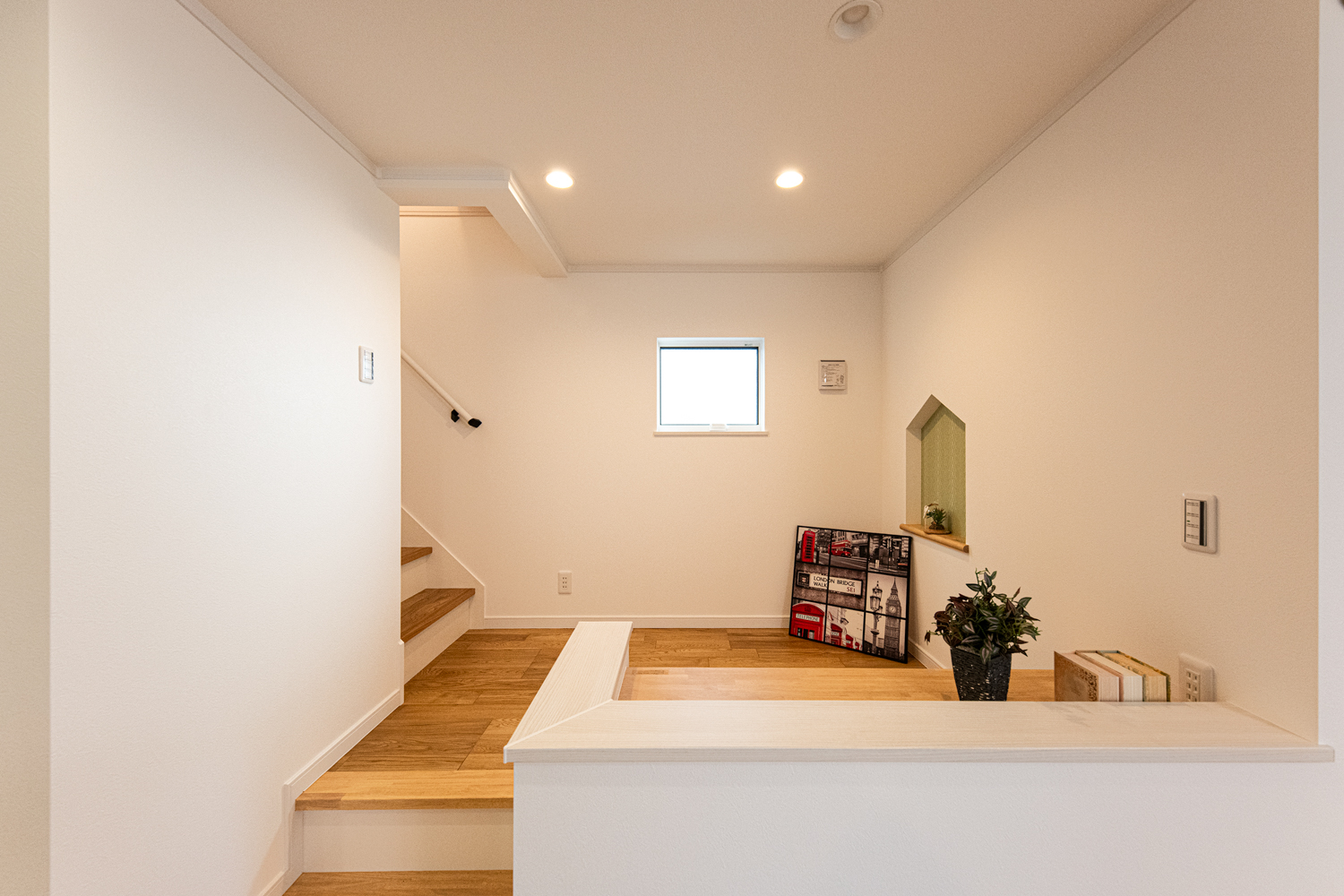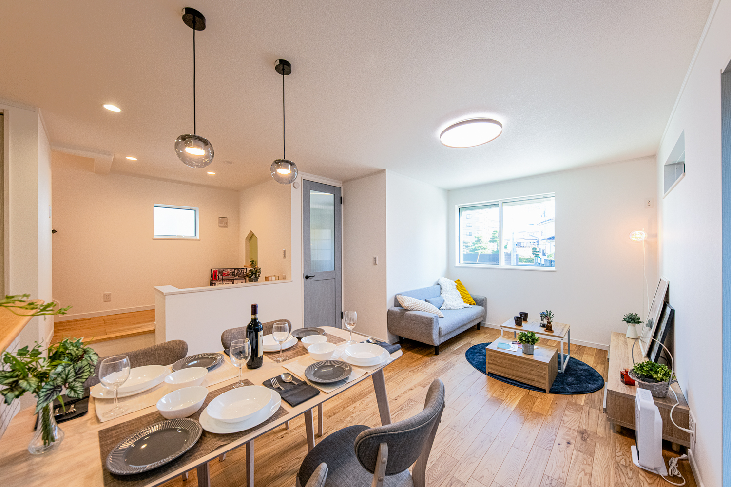 1件目は、ブラックウォルナットの深みが引き立つ上品な空間。2階には読書や作業にったりなカウンター付きのフリースペースを設けました。2件目は、オークの床にブルーペイントのドアや様々な模様のアクセントクロスが映える、やわらかな雰囲気の住まい。リビングには小上がりの書斎を備えた、個性あふれるお家が完成しました。