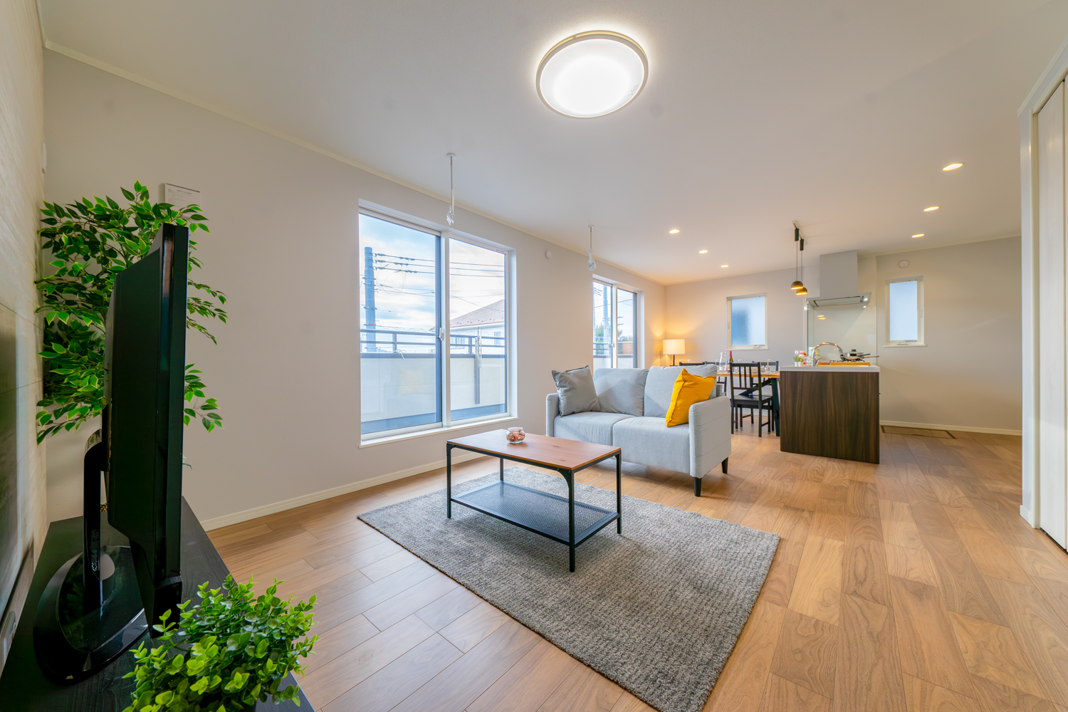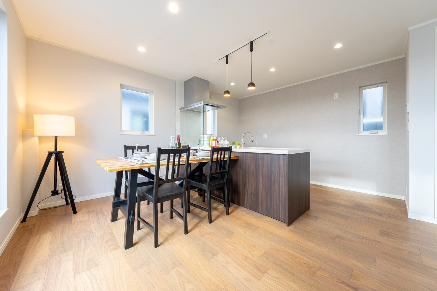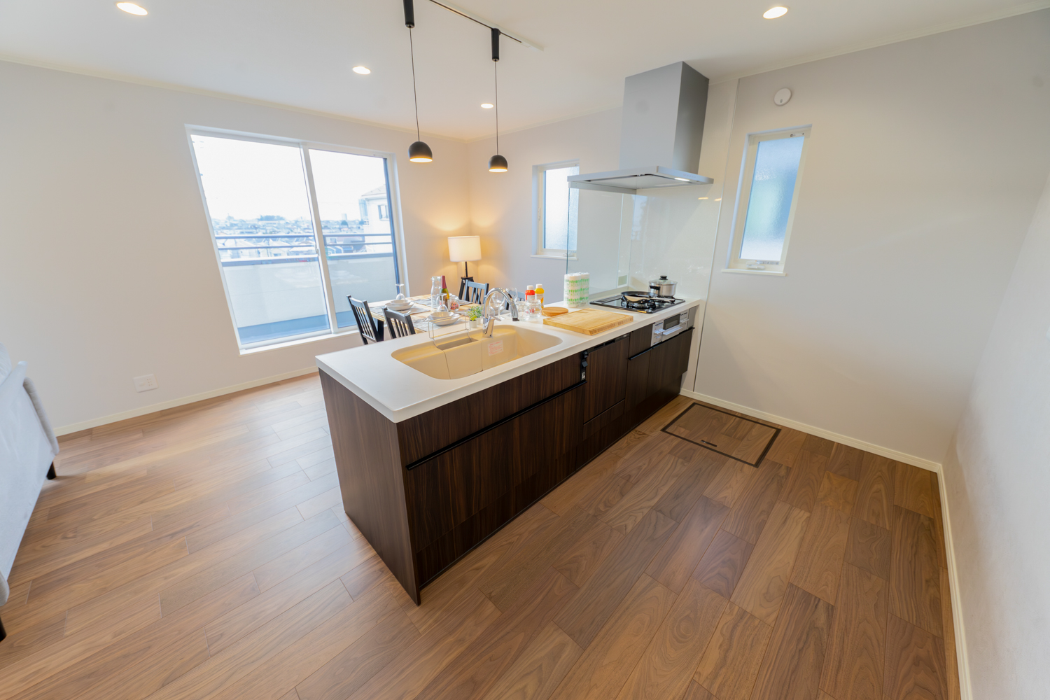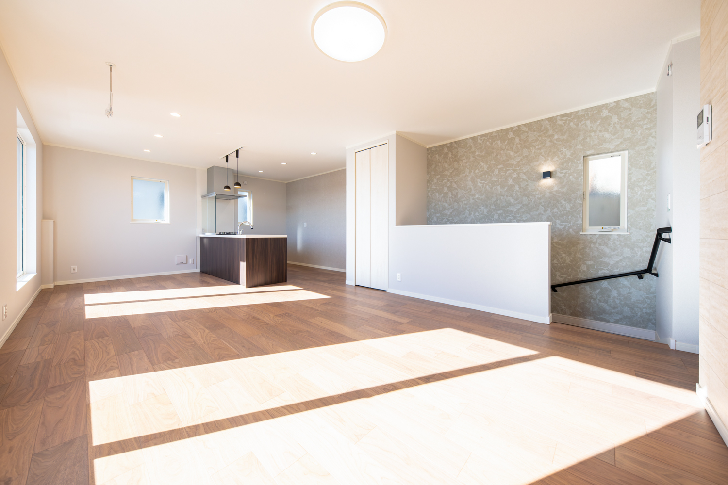 日当たりの良い2階リビングは、眺望を楽しみながら過ごせるペニンシュラキッチンや室内物干しが日々の動きを軽やかに支えます。玄関には手洗いを設け、帰宅後の流れもスムーズに。落ち着いた雰囲気でまとめた室内が、住む人の心をゆるやかに満たす心地よいお家が完成しました。