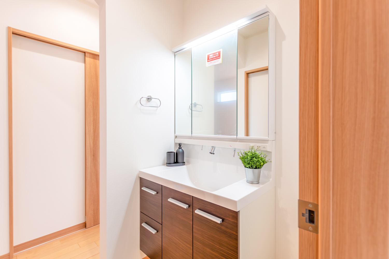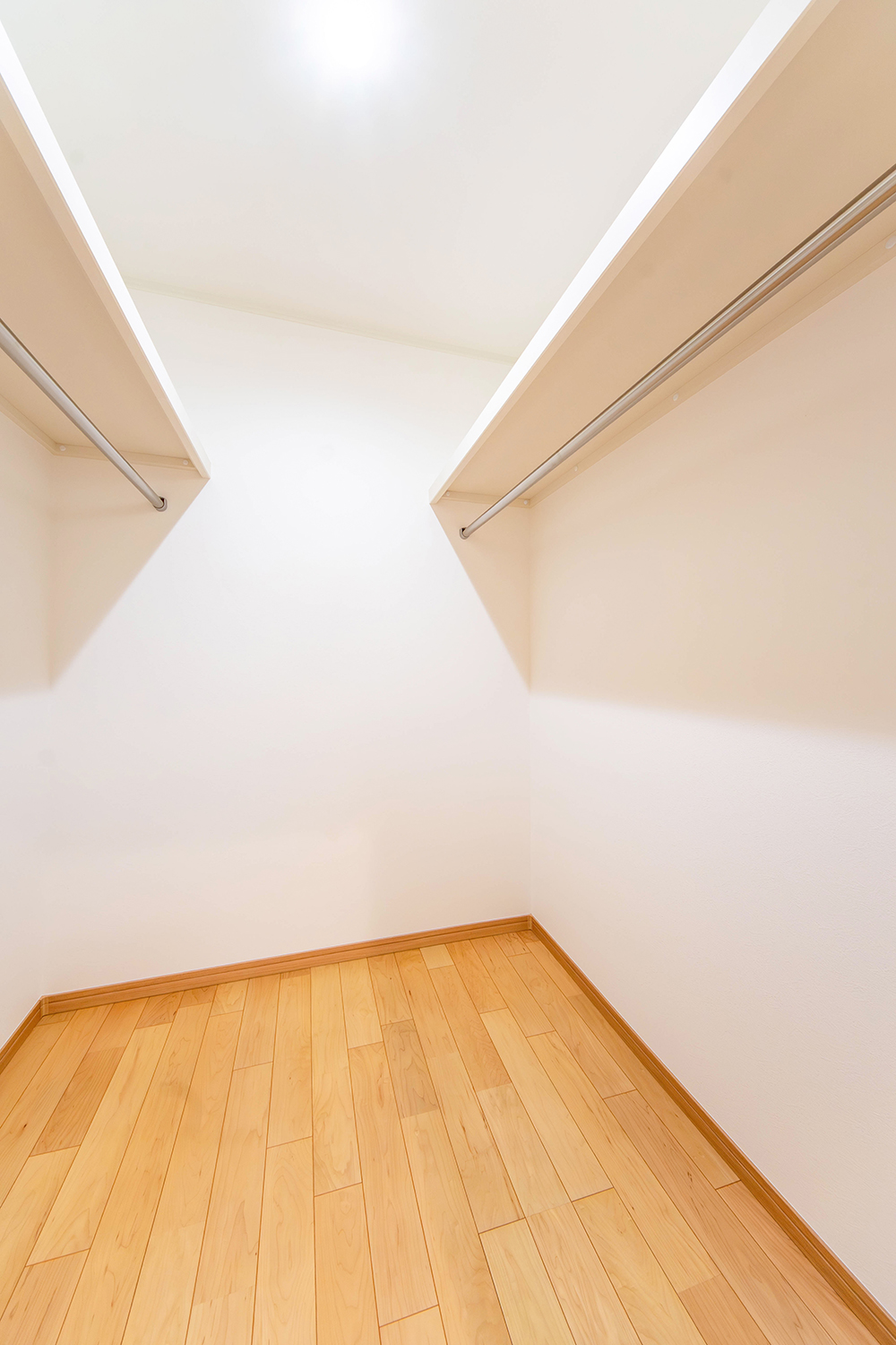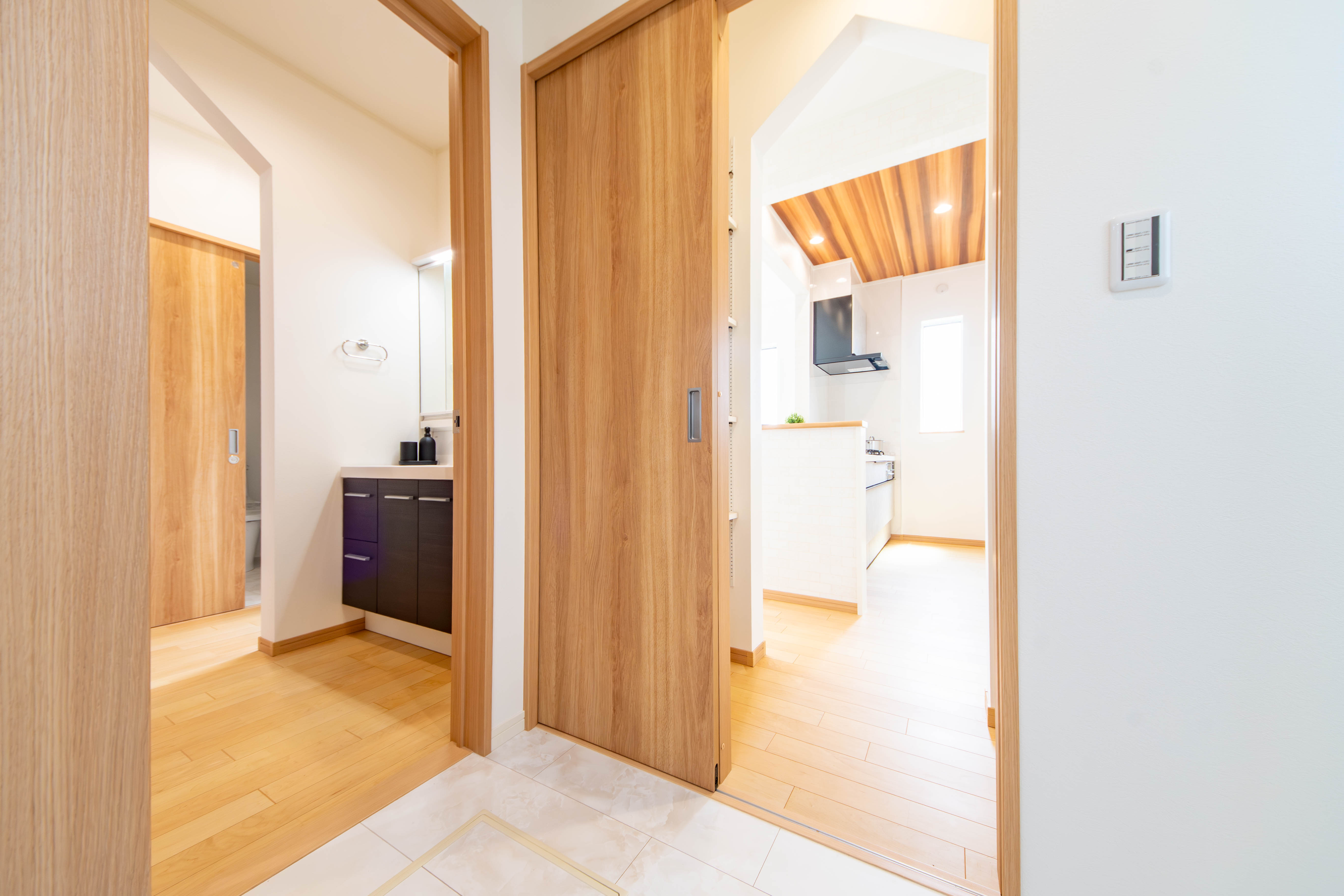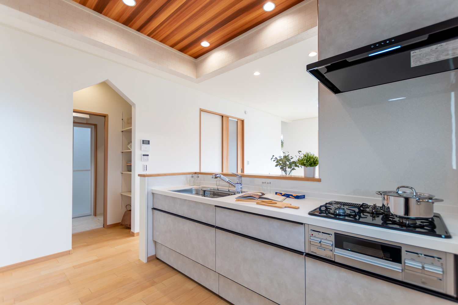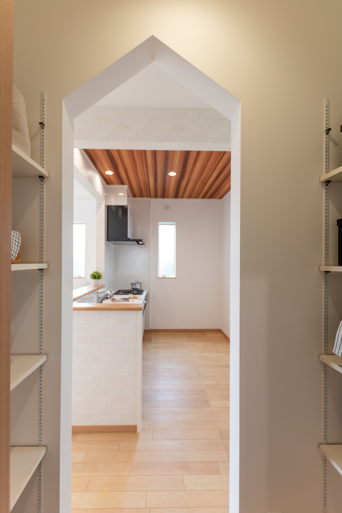 天井高をいかしたリビングは、のびやかな開放感が心地よく、自然と家族が集まる一角に。キッチン横のパントリーは脱衣所へと続き、巡るように使える動線が家事の流れを整えてくれます。さらに1階には使い勝手の良いファミリークローゼットを備え、暮らしにゆとりを添える住まいが完成しました。