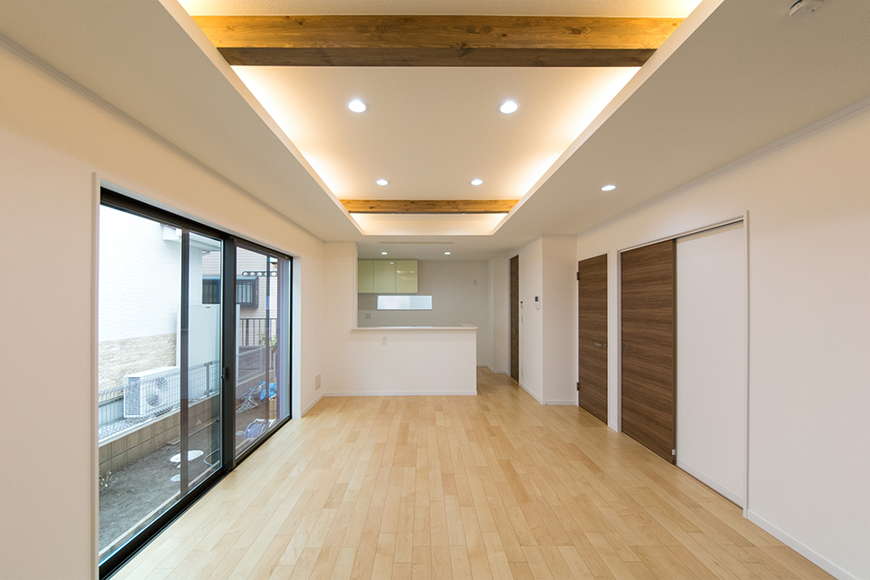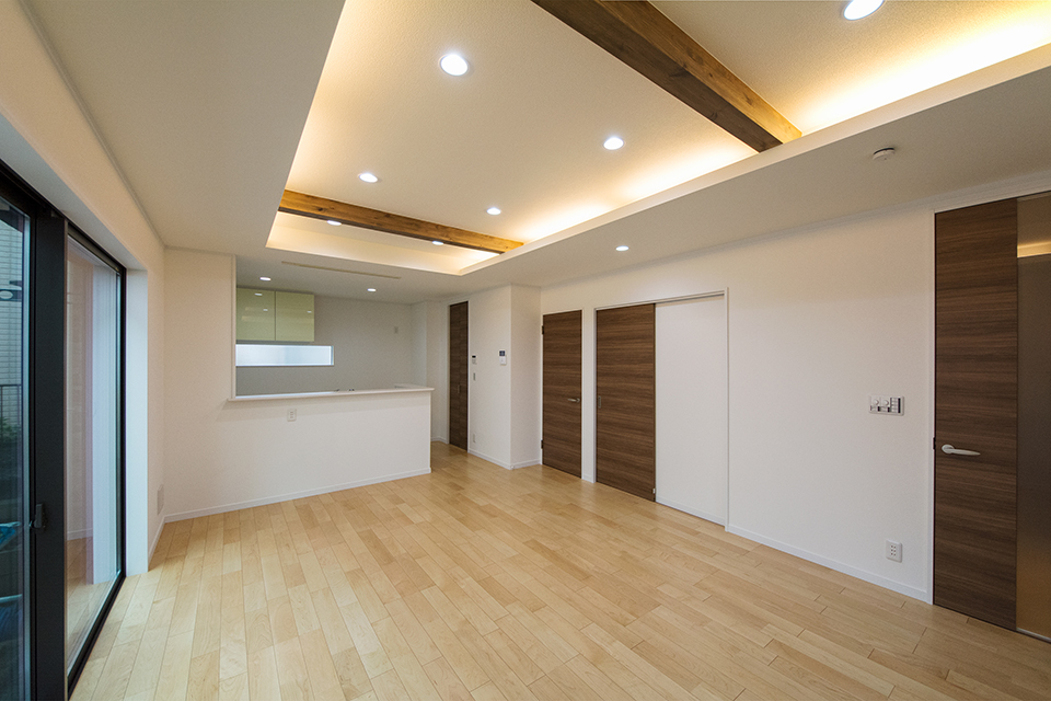 折り上げ天井の見せ梁と間接照明がナチュラルであたたかみのある空間を演出。