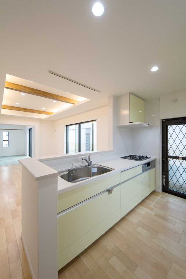 ライトグリーンのキッチン扉と人造大理石トップがナチュラルな室内を引き立てます。
