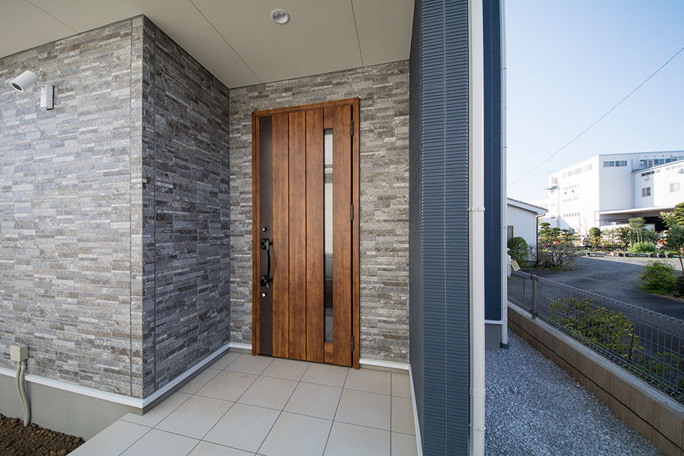 スリットの造形が印象的なブルーのサイディングと石積み調のサイディングを纏った、自然素材の風合いを活かしたモダンスタイル。