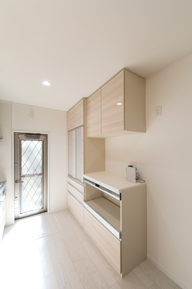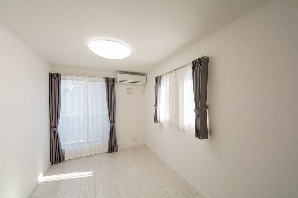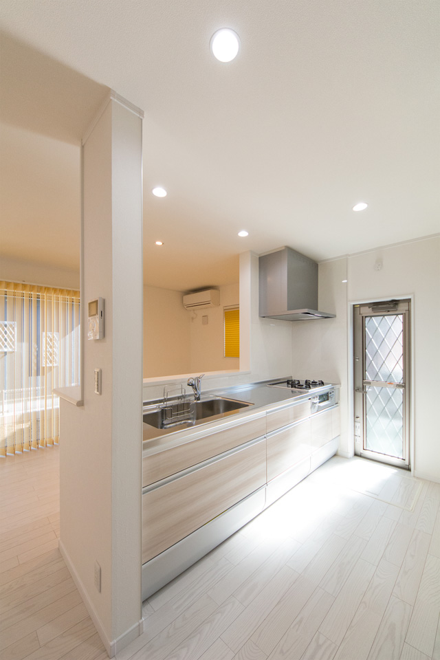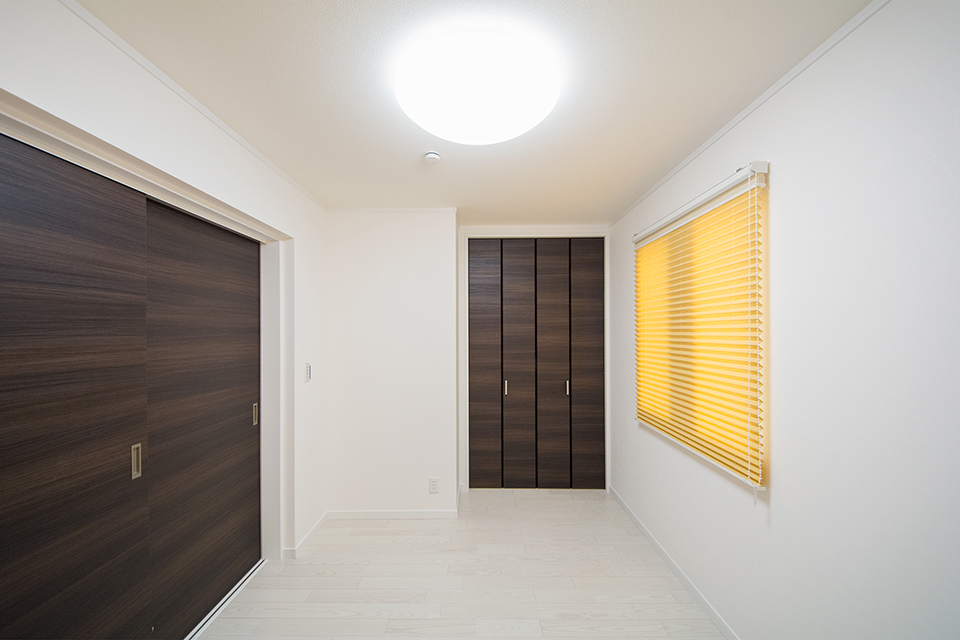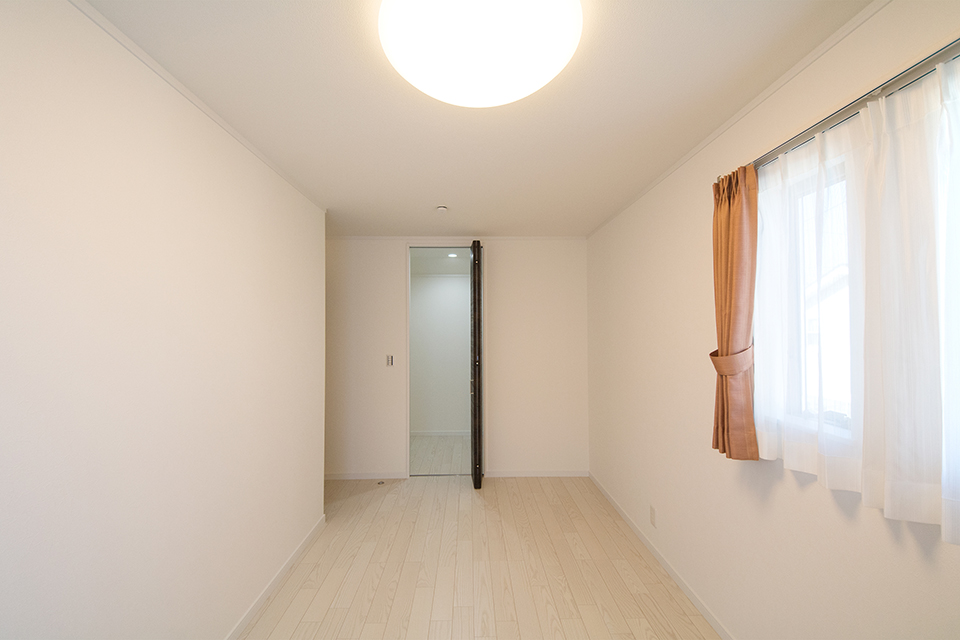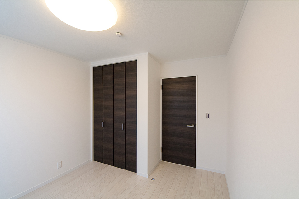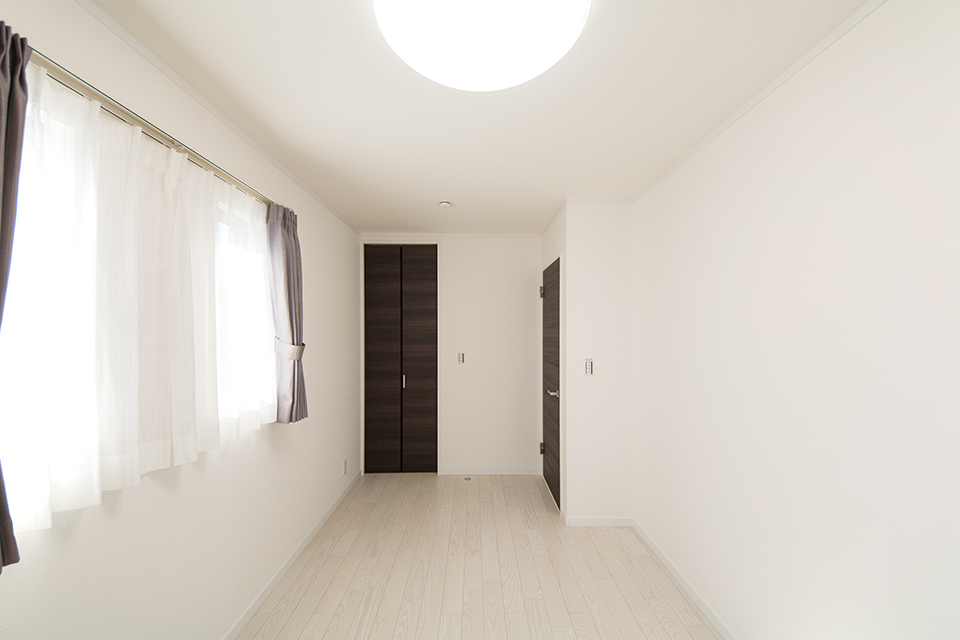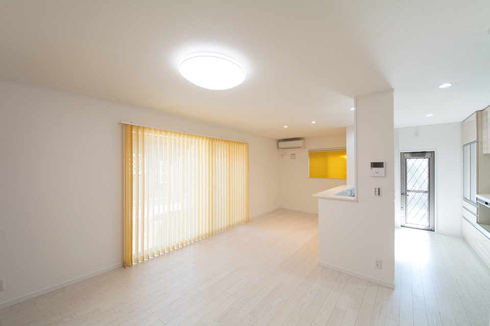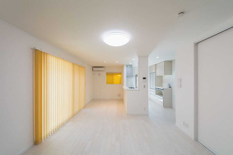 白を基調とした明るい室内。ビターオークの建具が空間を引き締めます。