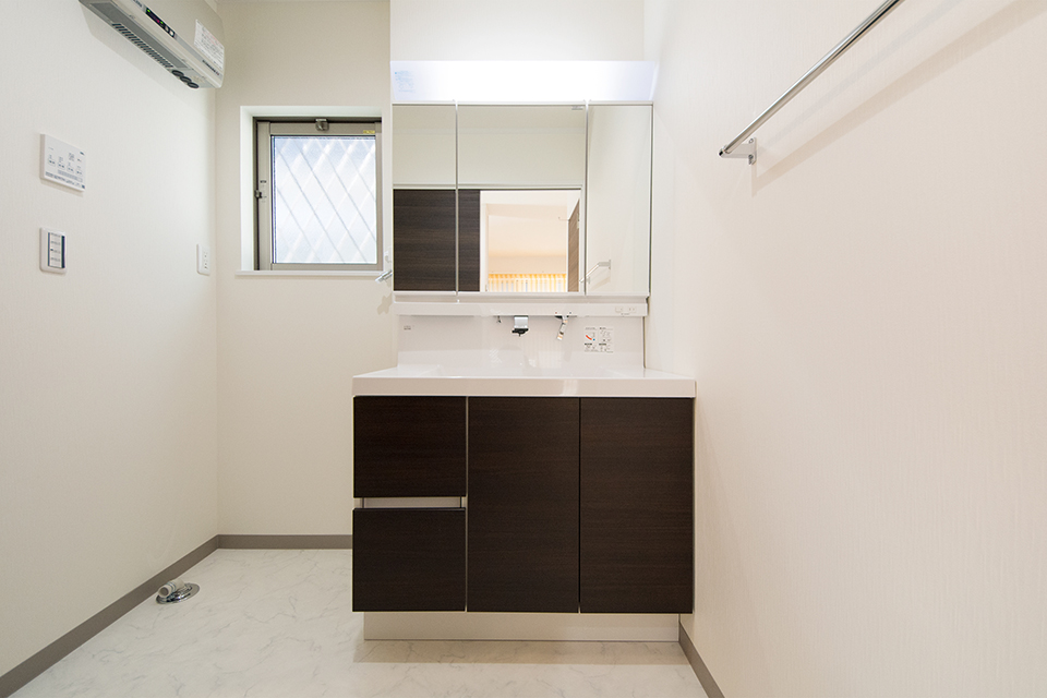 白を基調とした清潔感のあるサニタリールーム。ダークのブラウンの洗面化粧台が印象的。