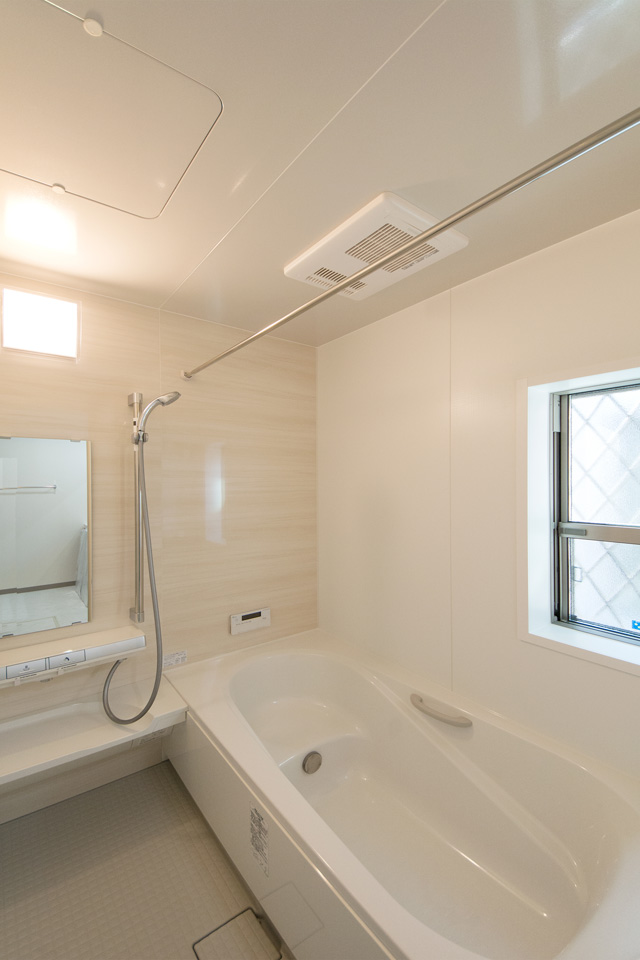 ベージュのアクセントパネルで穏やかな印象のバスルーム。