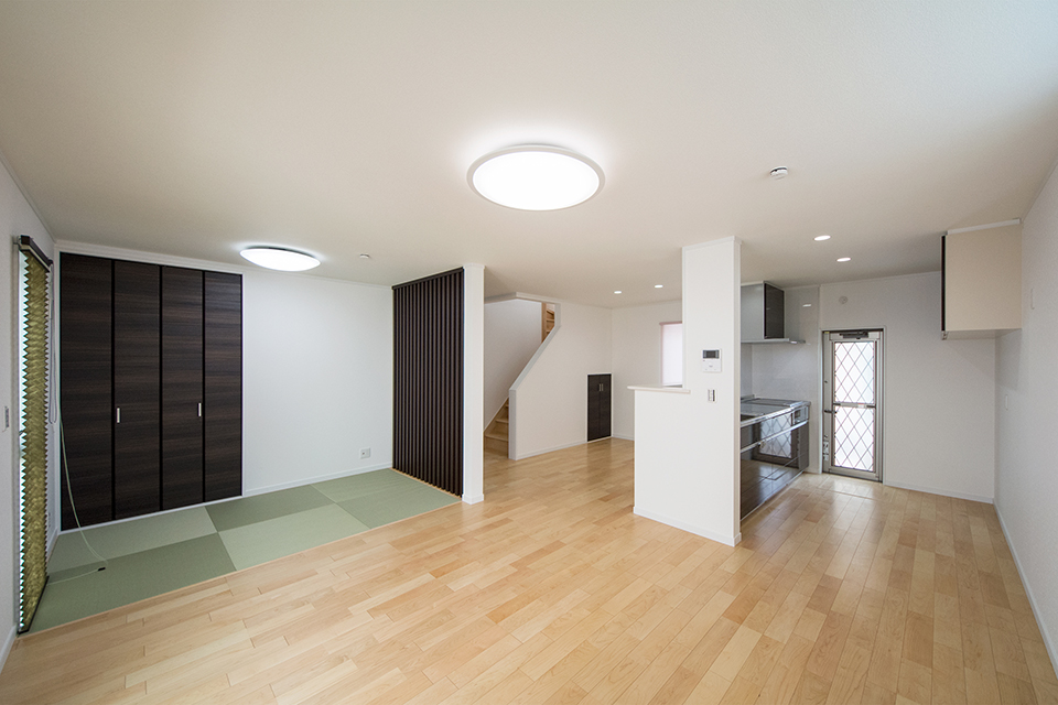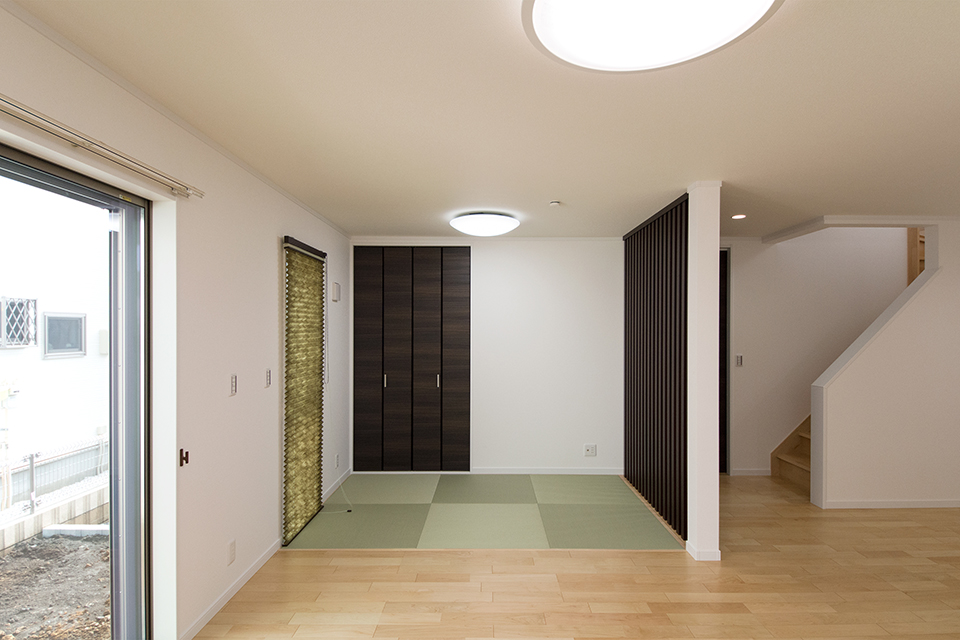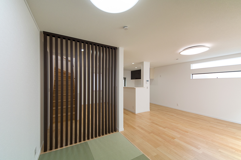 タタミコーナーのスリットラインが空間全体のアクセントに。