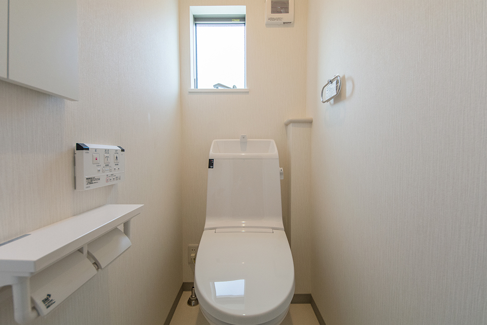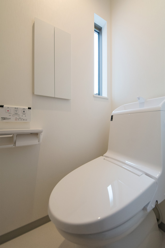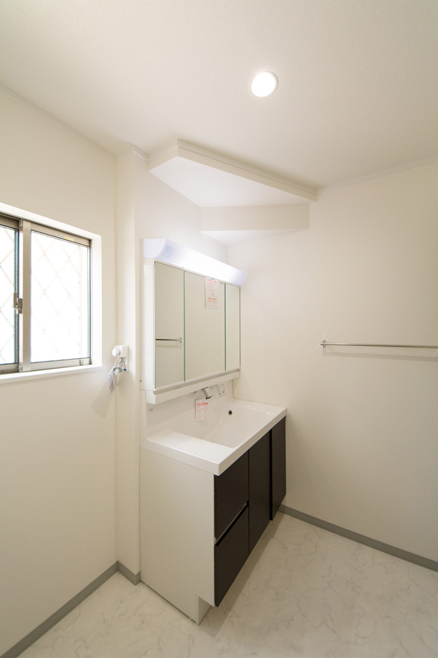 白を基調とした清潔感のあるサニタリールーム。ブラウンの洗面化粧台が印象的。