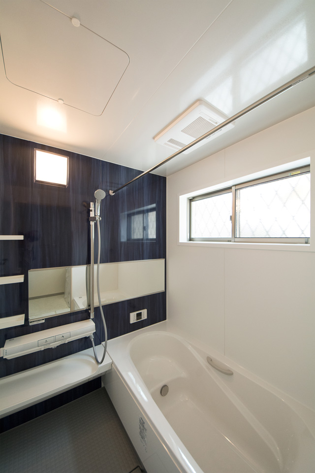 紺青をアクセントにした爽やかで清潔感のあるバスルーム。