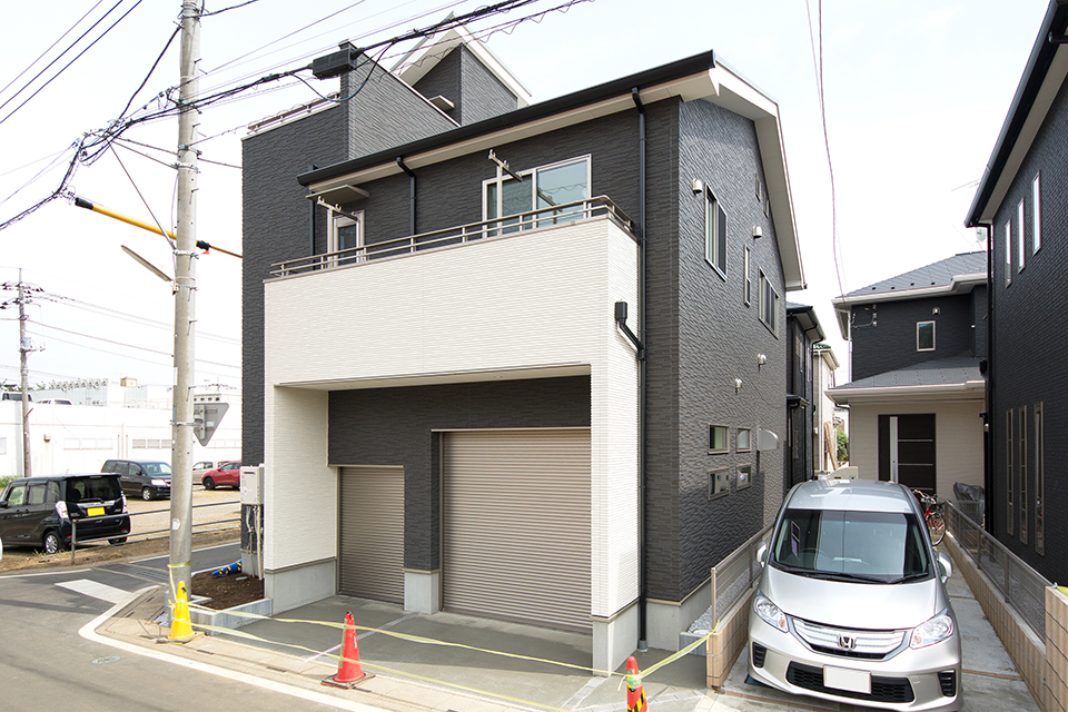 寄木調の黒いサイディングと、モダンなボーダーラインの白いサイディングを合わせた、スタイリッシュなファサードデザイン。