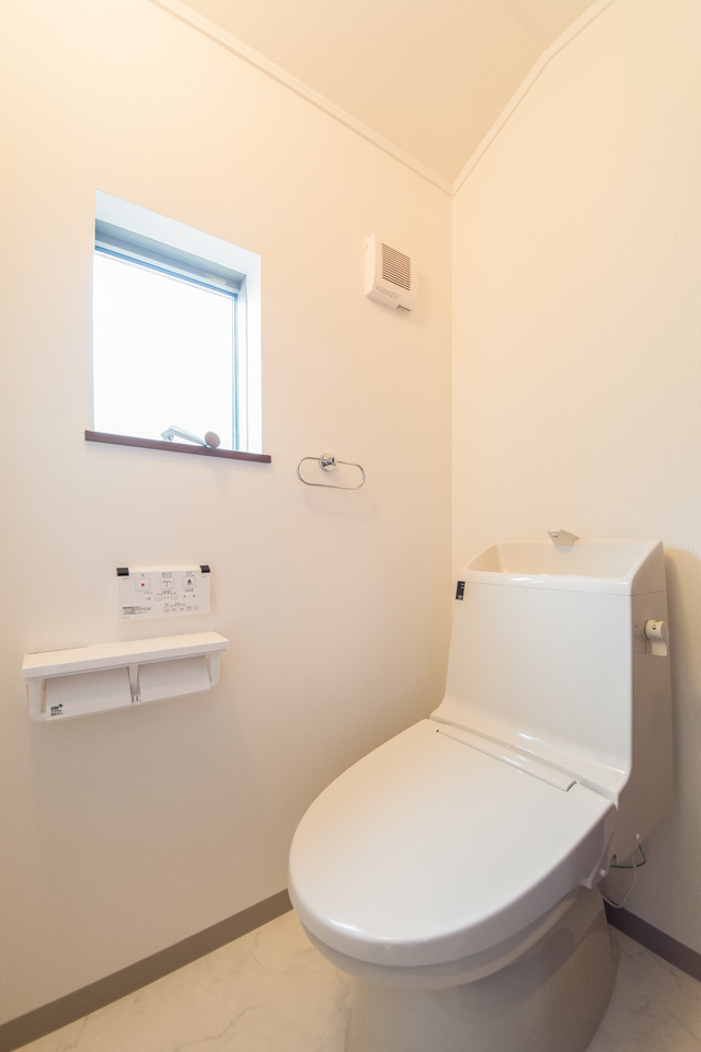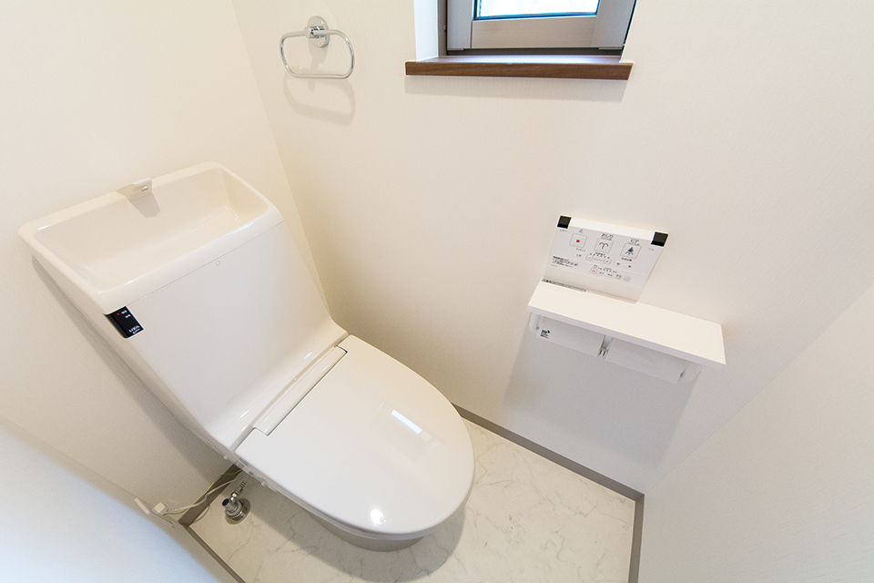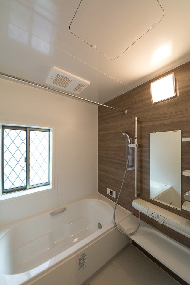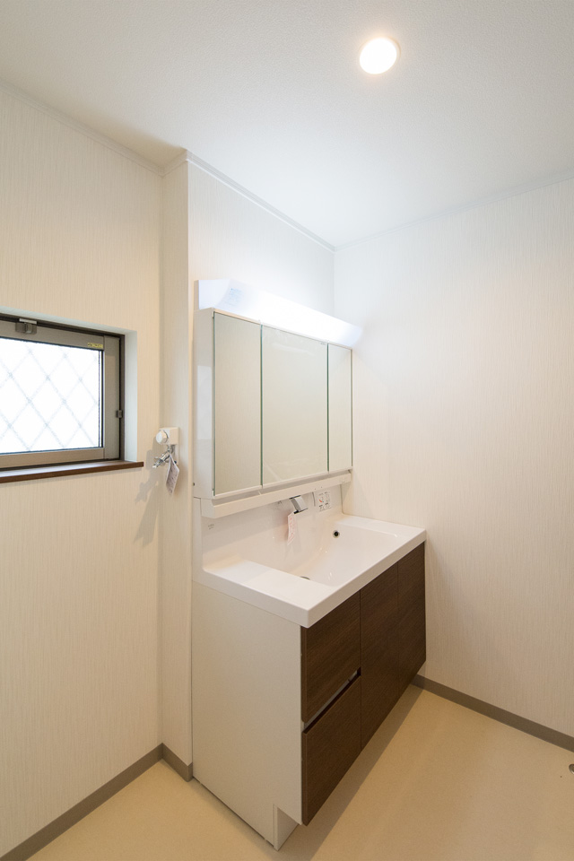 白を基調とした清潔感のあるサニタリールーム。ダークのブラウンの洗面化粧台が印象的。