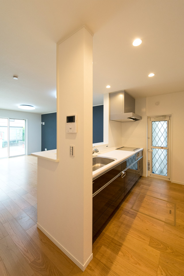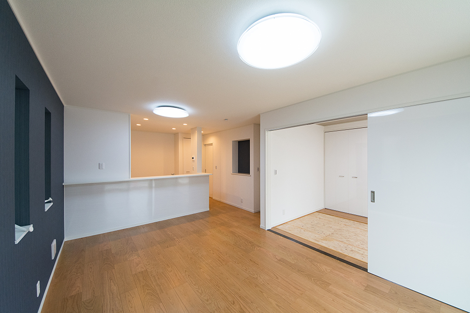 紅褐色のやわらかな木肌の上質感あふれるフローリング。紺のアクセントクロスがシックで落ち着いた雰囲気を演出します。