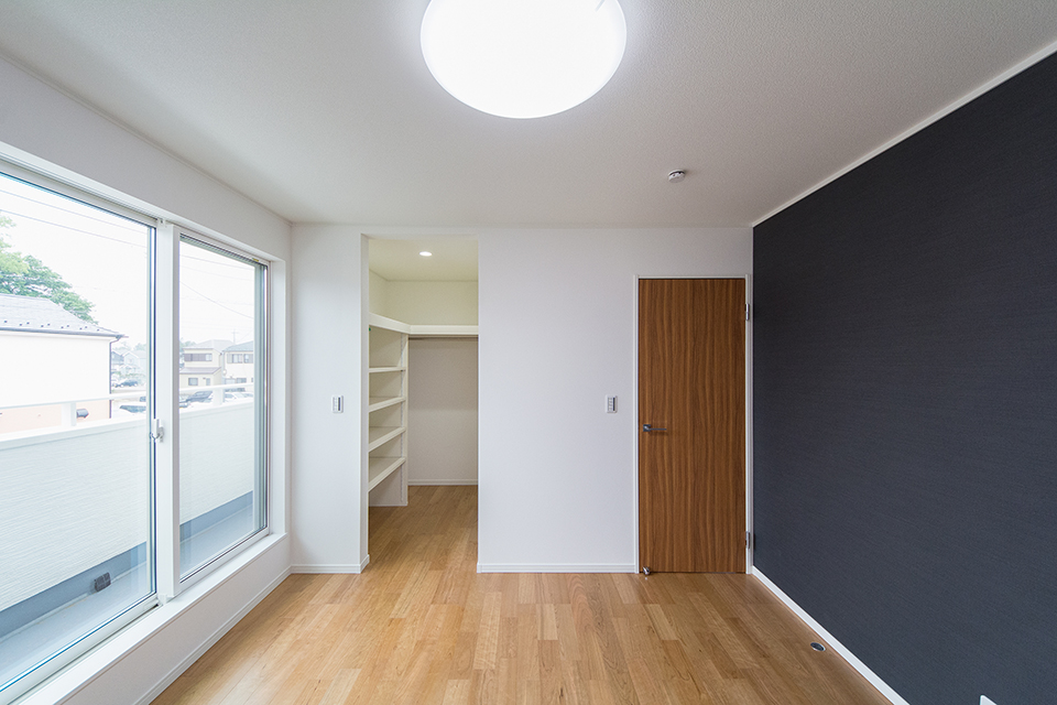 2階洋室。紺のアクセントクロスがシックで落ち着いた雰囲気を演出します。