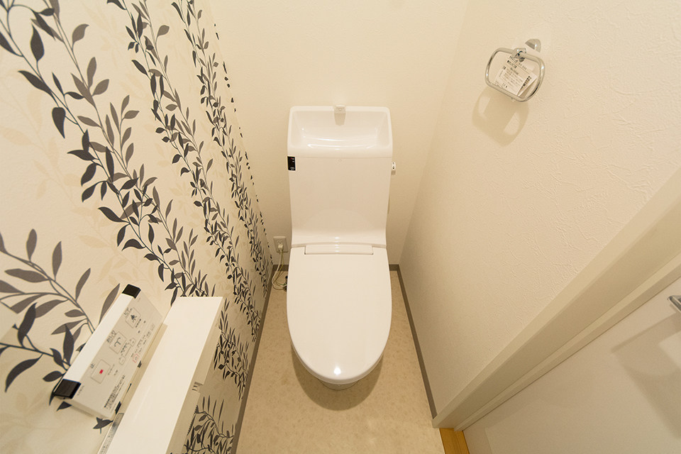1階トイレ。リーフ柄テキスタイルのアクセントクロスが、ナチュラルな空間を演出します。