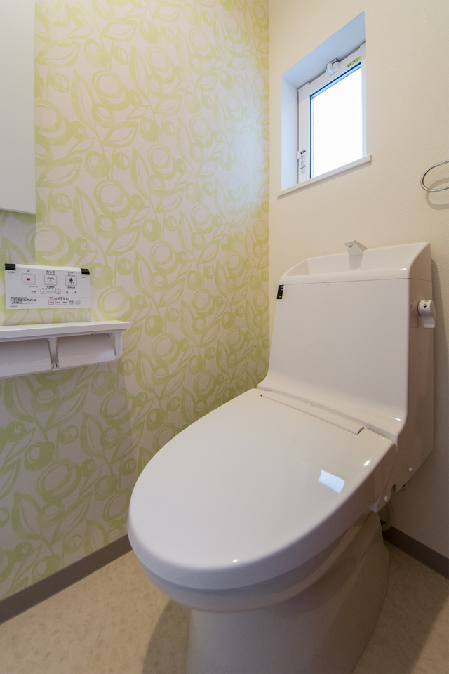 2階トイレ。グリーンのアクセントクロスが爽やかな空間を演出します。