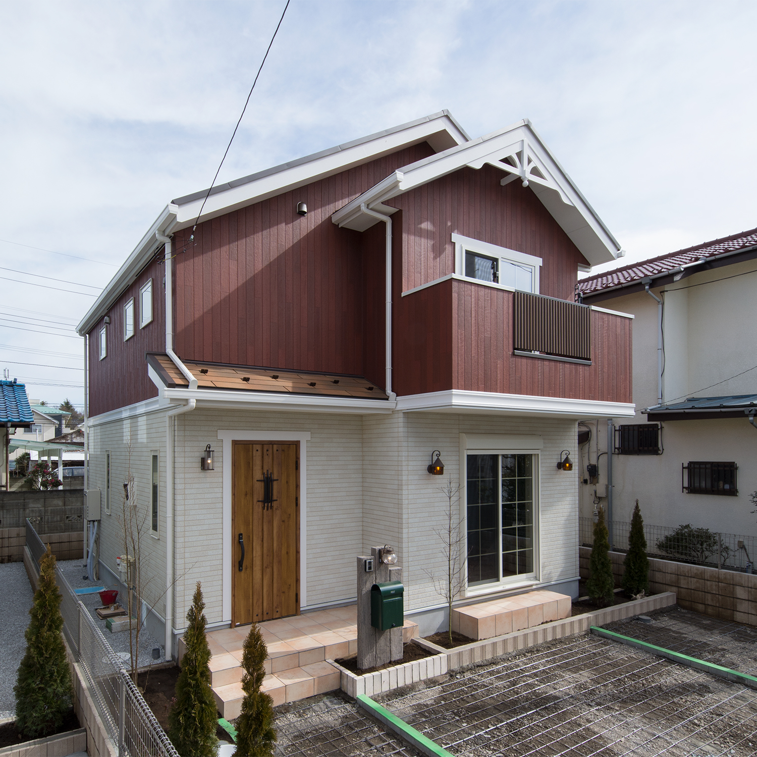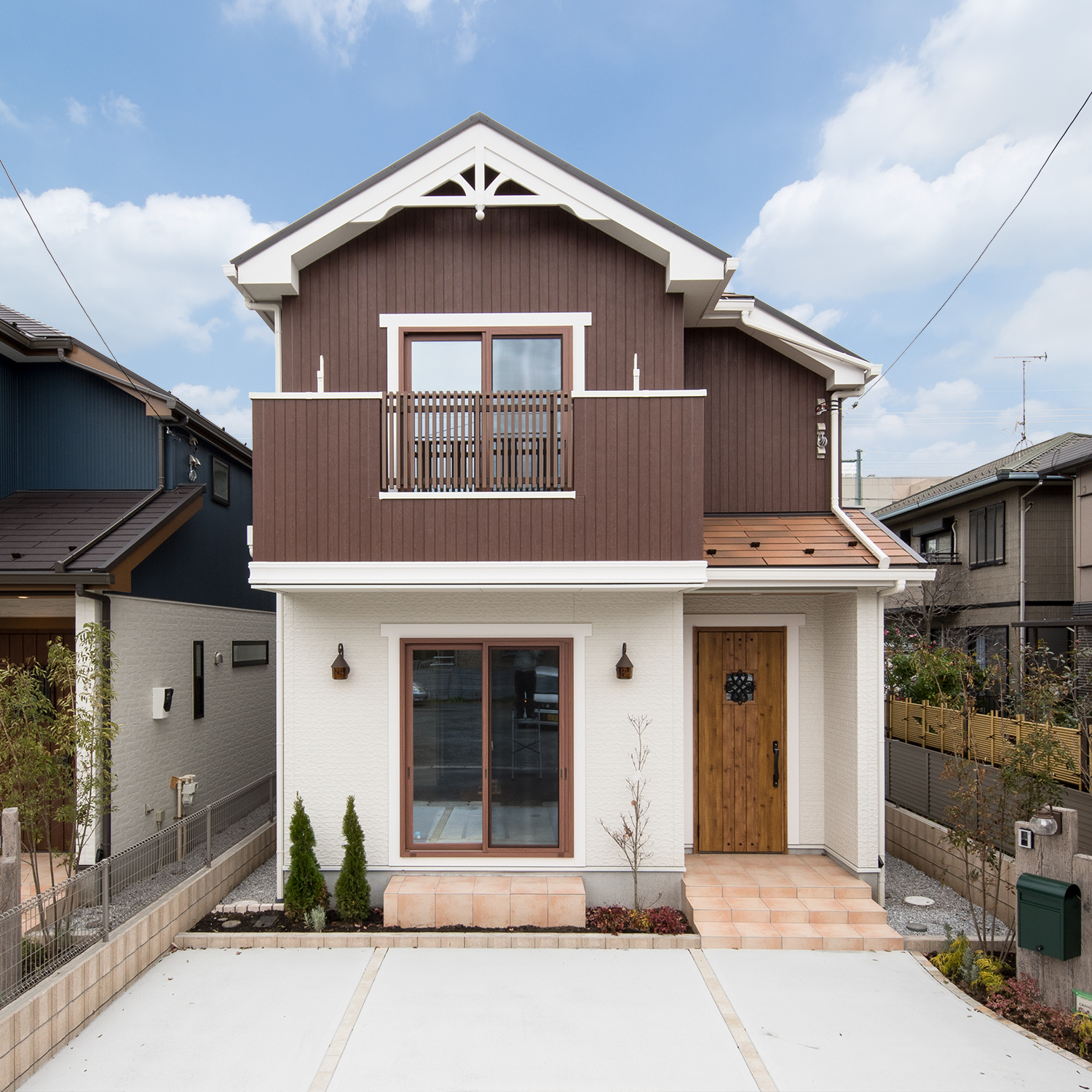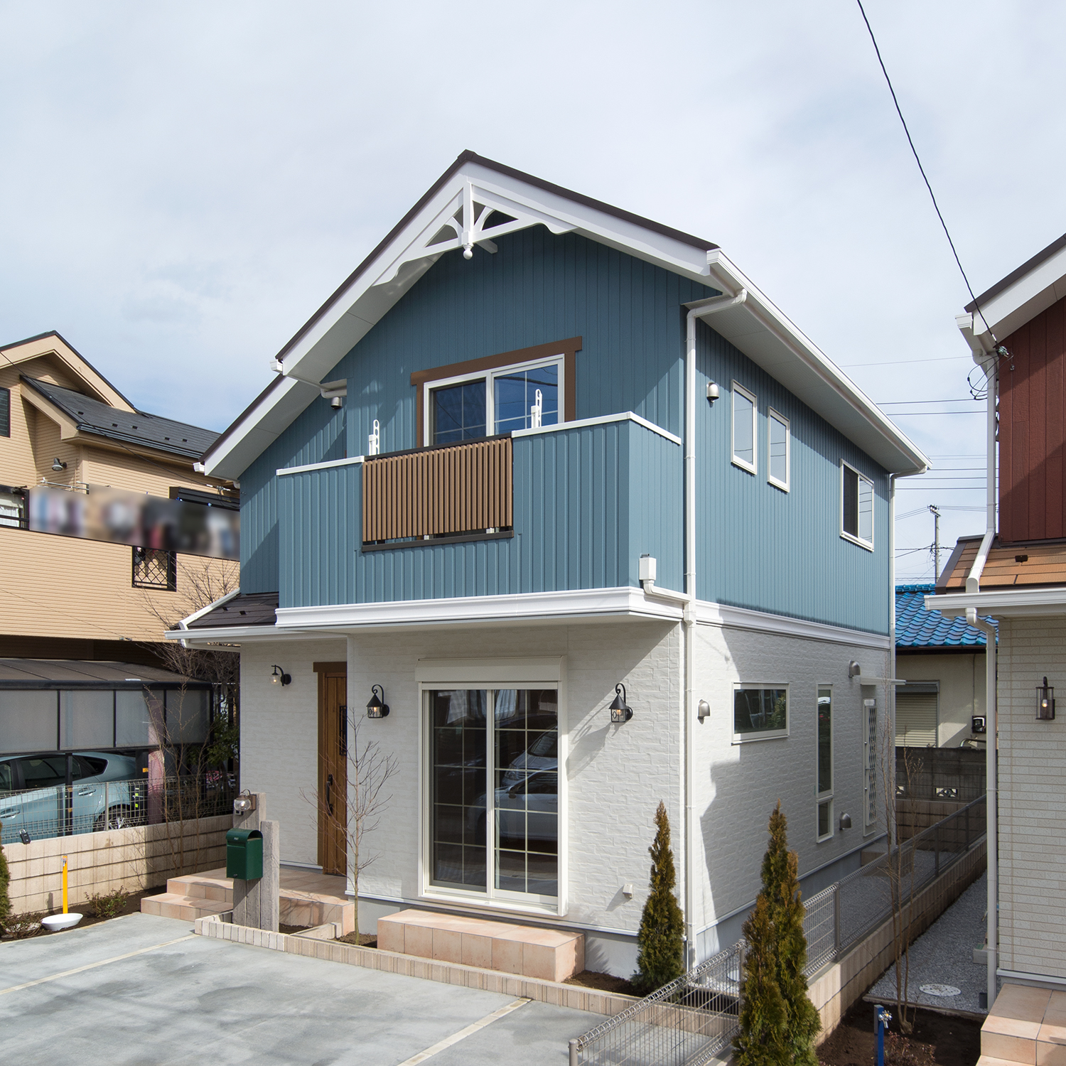 こて塗り風の趣にあふれた白のサイディングをベースに、古木材をイメージしたアンティーク調グリーンの木目柄をアクセントとした、ナチュラル&モダンな佇まい。