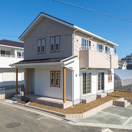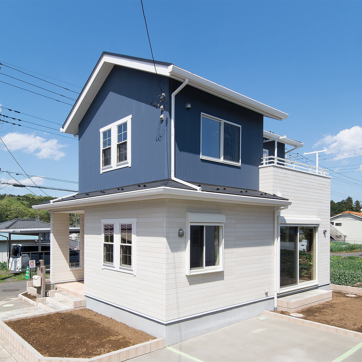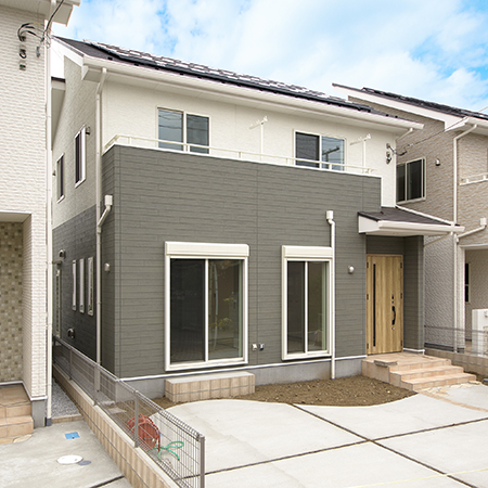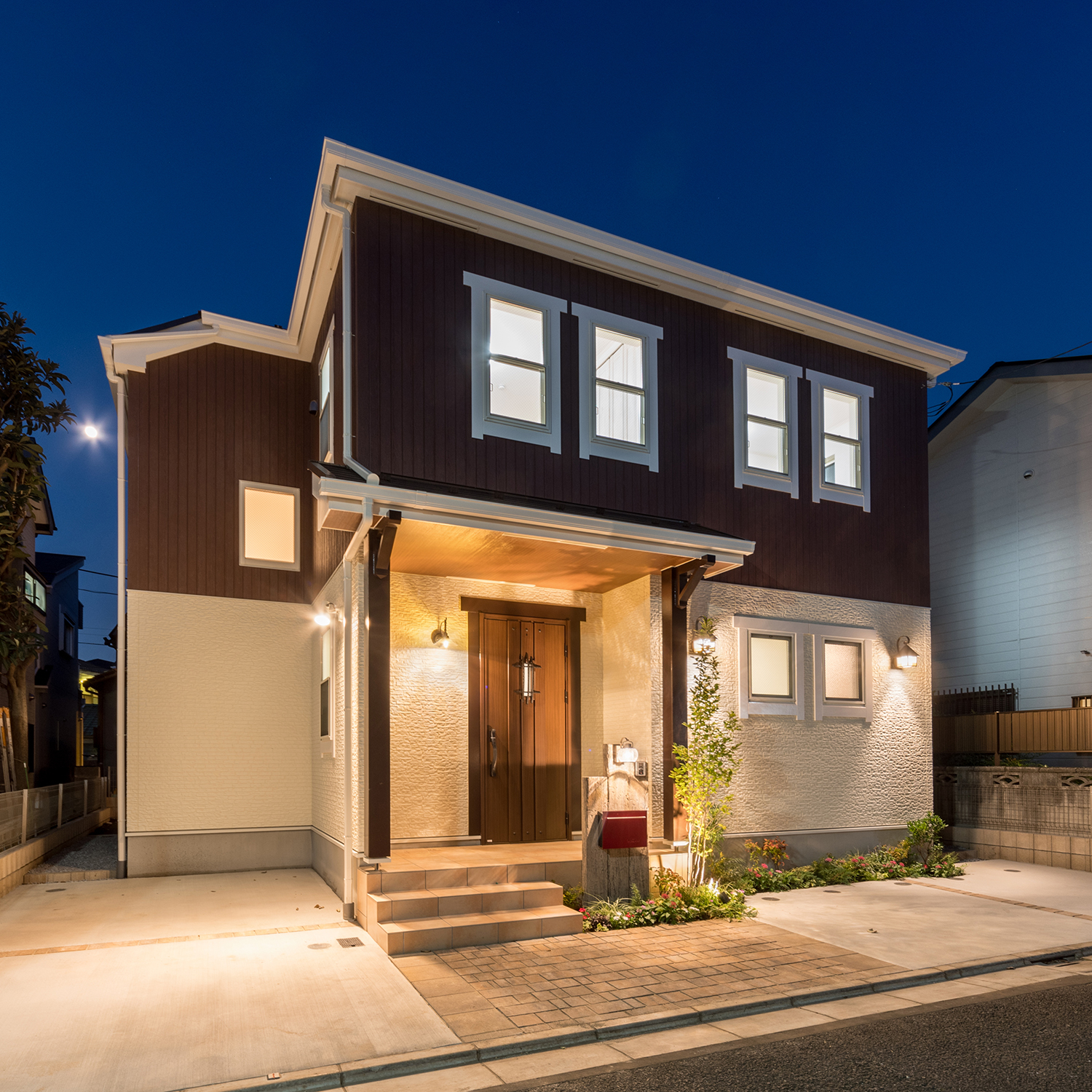 こて塗り風の趣にあふれた白のサイディングをベースに、古木材をイメージしたアンティーク調グリーンの木目柄をアクセントとした、ナチュラル&モダンな佇まい。