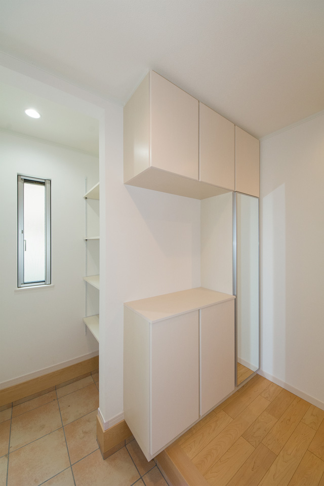 ベビーカーや傘立てなどが収納できる便利な土間収納を設えた玄関。