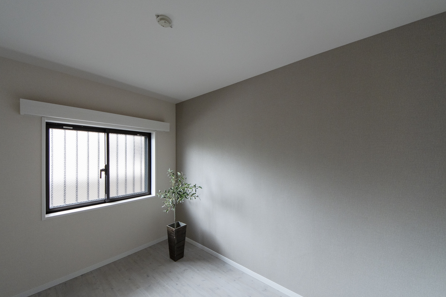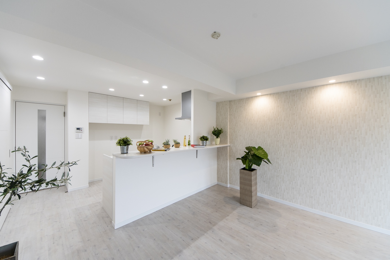 白をベースにした清涼感のある空間。アクセントクロスやダウンライトを施し、お部屋がモダンな印象になりました。