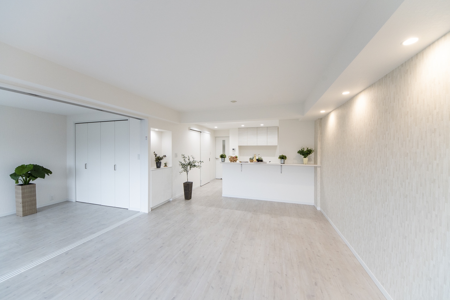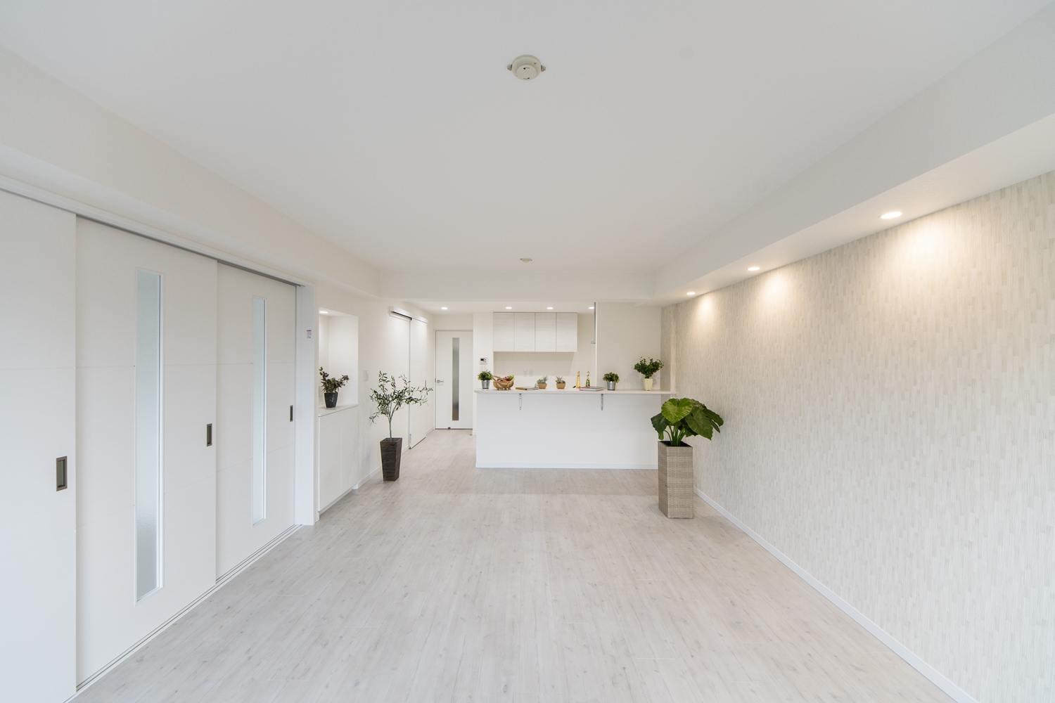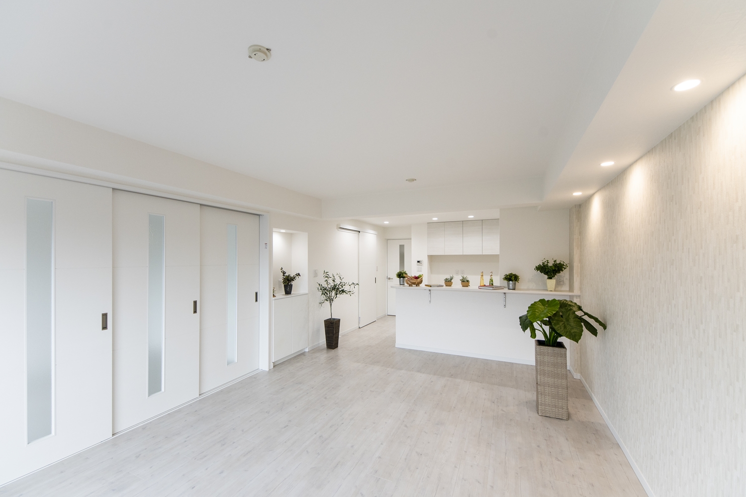 全室、床・クロスの張替え、建具・照明の交換を行い、浴室・洗面等も一新させました。白をベースにした、清涼感のある明るい空間にリフレッシュしました。