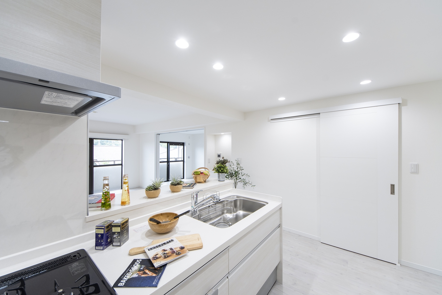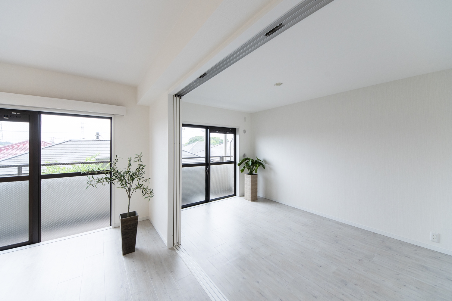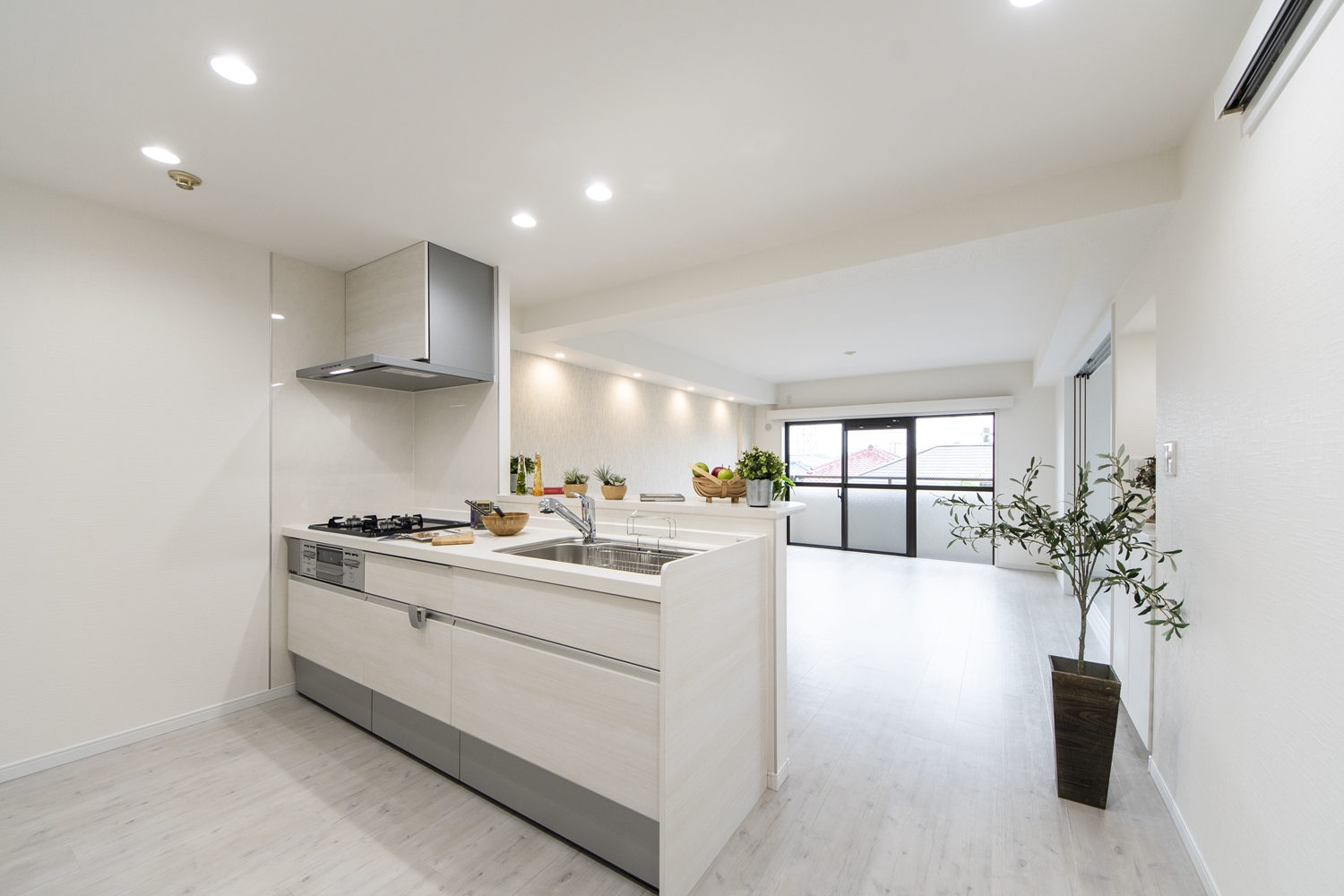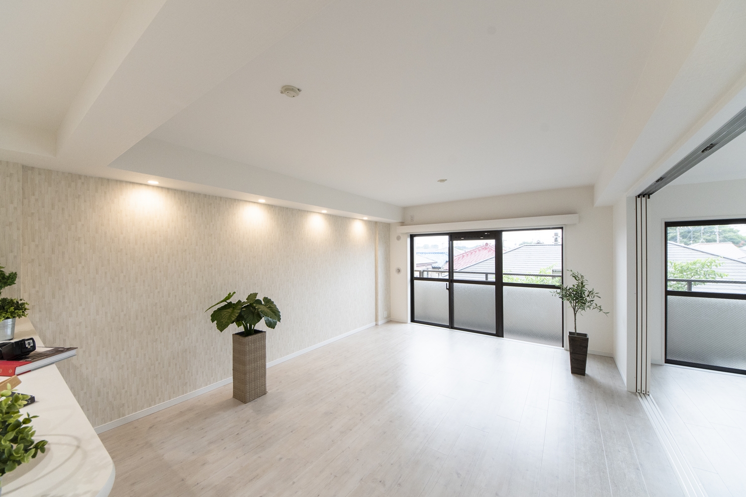 全室、床・クロスの張替え、建具・照明の交換を行い、浴室・洗面等も一新させました。白をベースにした、清涼感のある明るい空間にリフレッシュしました。