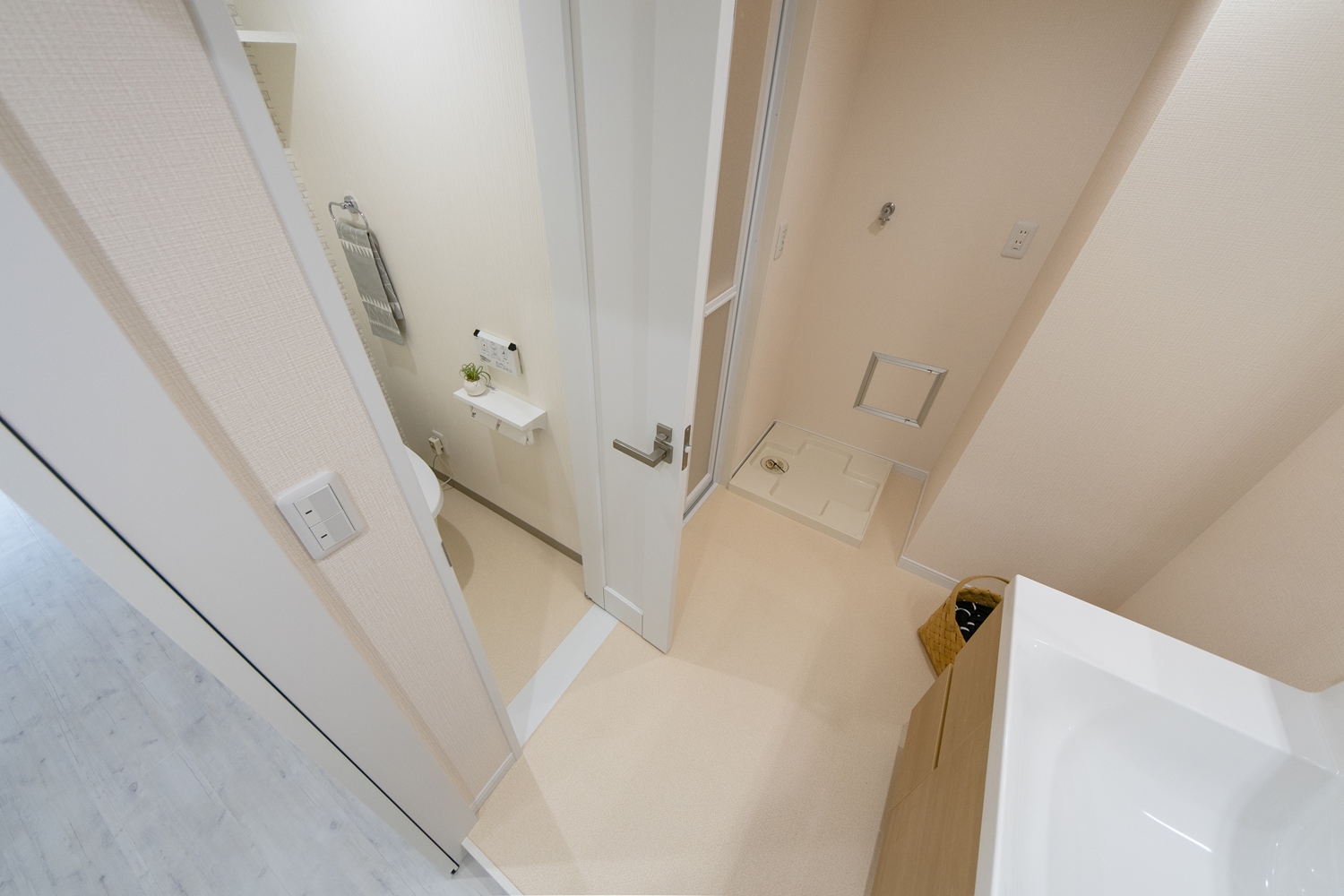 サニタリールーム/床・クロスを全面張替え、建具・洗面化粧台交換しました。扉を明るい木目調カラーでアクセントにしてナチュラルで明るい印象に。