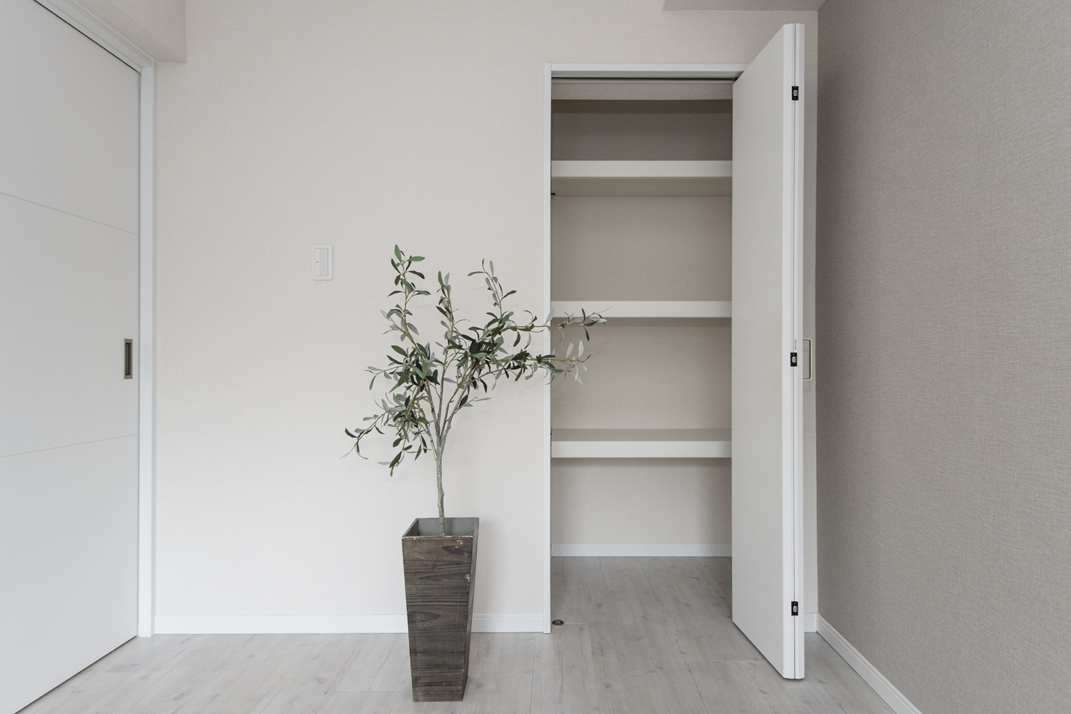 白をベースにして、明るく清涼感のある空間に。既存のクロゼット内部を造作し、快適に収納できるようになりました♪